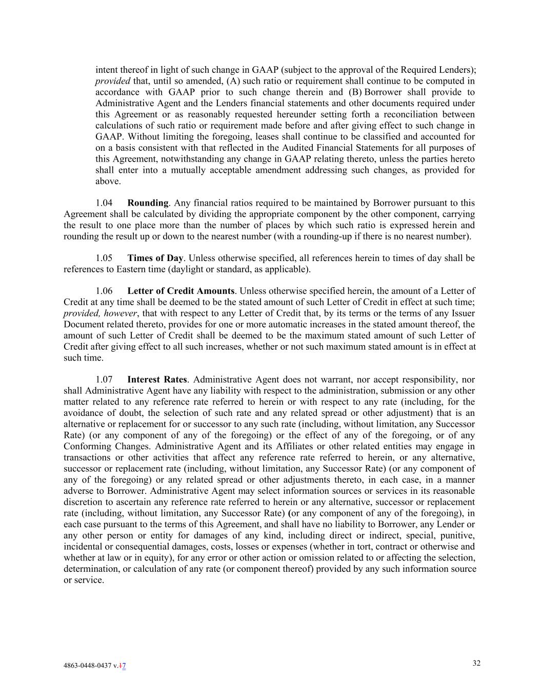 4863-0448-0437 v.17 32 intent thereof in light of such change in GAAP (subject to the approval of the Required Lenders); provided that, until so amended, (A) such ratio or requirement shall continue to be computed in accordance with GAAP prior to such change therein and (B) Borrower shall provide to Administrative Agent and the Lenders financial statements and other documents required under this Agreement or as reasonably requested hereunder setting forth a reconciliation between calculations of such ratio or requirement made before and after giving effect to such change in GAAP. Without limiting the foregoing, leases shall continue to be classified and accounted for on a basis consistent with that reflected in the Audited Financial Statements for all purposes of this Agreement, notwithstanding any change in GAAP relating thereto, unless the parties hereto shall enter into a mutually acceptable amendment addressing such changes, as provided for above. 1.04 Rounding. Any financial ratios required to be maintained by Borrower pursuant to this Agreement shall be calculated by dividing the appropriate component by the other component, carrying the result to one place more than the number of places by which such ratio is expressed herein and rounding the result up or down to the nearest number (with a rounding-up if there is no nearest number). 1.05 Times of Day. Unless otherwise specified, all references herein to times of day shall be references to Eastern time (daylight or standard, as applicable). 1.06 Letter of Credit Amounts. Unless otherwise specified herein, the amount of a Letter of Credit at any time shall be deemed to be the stated amount of such Letter of Credit in effect at such time; provided, however, that with respect to any Letter of Credit that, by its terms or the terms of any Issuer Document related thereto, provides for one or more automatic increases in the stated amount thereof, the amount of such Letter of Credit shall be deemed to be the maximum stated amount of such Letter of Credit after giving effect to all such increases, whether or not such maximum stated amount is in effect at such time. 1.07 Interest Rates. Administrative Agent does not warrant, nor accept responsibility, nor shall Administrative Agent have any liability with respect to the administration, submission or any other matter related to any reference rate referred to herein or with respect to any rate (including, for the avoidance of doubt, the selection of such rate and any related spread or other adjustment) that is an alternative or replacement for or successor to any such rate (including, without limitation, any Successor Rate) (or any component of any of the foregoing) or the effect of any of the foregoing, or of any Conforming Changes. Administrative Agent and its Affiliates or other related entities may engage in transactions or other activities that affect any reference rate referred to herein, or any alternative, successor or replacement rate (including, without limitation, any Successor Rate) (or any component of any of the foregoing) or any related spread or other adjustments thereto, in each case, in a manner adverse to Borrower. Administrative Agent may select information sources or services in its reasonable discretion to ascertain any reference rate referred to herein or any alternative, successor or replacement rate (including, without limitation, any Successor Rate) (or any component of any of the foregoing), in each case pursuant to the terms of this Agreement, and shall have no liability to Borrower, any Lender or any other person or entity for damages of any kind, including direct or indirect, special, punitive, incidental or consequential damages, costs, losses or expenses (whether in tort, contract or otherwise and whether at law or in equity), for any error or other action or omission related to or affecting the selection, determination, or calculation of any rate (or component thereof) provided by any such information source or service.