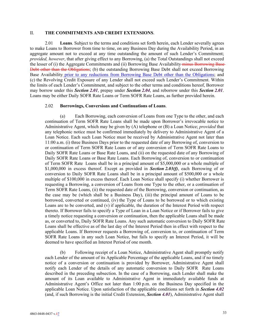 4863-0448-0437 v.17 33 II. THE COMMITMENTS AND CREDIT EXTENSIONS. 2.01 Loans. Subject to the terms and conditions set forth herein, each Lender severally agrees to make Loans to Borrower from time to time, on any Business Day during the Availability Period, in an aggregate amount not to exceed at any time outstanding the amount of such Lender’s Commitment; provided, however, that after giving effect to any Borrowing, (a) the Total Outstandings shall not exceed the lesser of (i) the Aggregate Commitments and (ii) Borrowing Base Availability minus Borrowing Base Debt other than the Obligations; (b) the outstanding Borrowing Base Debt shall not exceed Borrowing Base Availability prior to any reductions from Borrowing Base Debt other than the Obligations; and (c) the Revolving Credit Exposure of any Lender shall not exceed such Lender’s Commitment. Within the limits of each Lender’s Commitment, and subject to the other terms and conditions hereof, Borrower may borrow under this Section 2.01, prepay under Section 2.04, and reborrow under this Section 2.01. Loans may be either Daily SOFR Rate Loans or Term SOFR Rate Loans, as further provided herein. 2.02 Borrowings, Conversions and Continuations of Loans. (a) Each Borrowing, each conversion of Loans from one Type to the other, and each continuation of Term SOFR Rate Loans shall be made upon Borrower’s irrevocable notice to Administrative Agent, which may be given by (A) telephone or (B) a Loan Notice; provided that any telephonic notice must be confirmed immediately by delivery to Administrative Agent of a Loan Notice. Each such Loan Notice must be received by Administrative Agent not later than 11:00 a.m. (i) three Business Days prior to the requested date of any Borrowing of, conversion to or continuation of Term SOFR Rate Loans or of any conversion of Term SOFR Rate Loans to Daily SOFR Rate Loans or Base Rate Loans, and (ii) on the requested date of any Borrowing of Daily SOFR Rate Loans or Base Rate Loans. Each Borrowing of, conversion to or continuation of Term SOFR Rate Loans shall be in a principal amount of $5,000,000 or a whole multiple of $1,000,000 in excess thereof. Except as provided in Section 2.03(f), each Borrowing of or conversion to Daily SOFR Rate Loans shall be in a principal amount of $500,000 or a whole multiple of $100,000 in excess thereof. Each Loan Notice shall specify (i) whether Borrower is requesting a Borrowing, a conversion of Loans from one Type to the other, or a continuation of Term SOFR Rate Loans, (ii) the requested date of the Borrowing, conversion or continuation, as the case may be (which shall be a Business Day), (iii) the principal amount of Loans to be borrowed, converted or continued, (iv) the Type of Loans to be borrowed or to which existing Loans are to be converted, and (v) if applicable, the duration of the Interest Period with respect thereto. If Borrower fails to specify a Type of Loan in a Loan Notice or if Borrower fails to give a timely notice requesting a conversion or continuation, then the applicable Loans shall be made as, or converted to, Daily SOFR Rate Loans. Any such automatic conversion to Daily SOFR Rate Loans shall be effective as of the last day of the Interest Period then in effect with respect to the applicable Loans. If Borrower requests a Borrowing of, conversion to, or continuation of Term SOFR Rate Loans in any such Loan Notice, but fails to specify an Interest Period, it will be deemed to have specified an Interest Period of one month. (b) Following receipt of a Loan Notice, Administrative Agent shall promptly notify each Lender of the amount of its Applicable Percentage of the applicable Loans, and if no timely notice of a conversion or continuation is provided by Borrower, Administrative Agent shall notify each Lender of the details of any automatic conversion to Daily SOFR Rate Loans described in the preceding subsection. In the case of a Borrowing, each Lender shall make the amount of its Loan available to Administrative Agent in immediately available funds at Administrative Agent’s Office not later than 1:00 p.m. on the Business Day specified in the applicable Loan Notice. Upon satisfaction of the applicable conditions set forth in Section 4.02 (and, if such Borrowing is the initial Credit Extension, Section 4.01), Administrative Agent shall