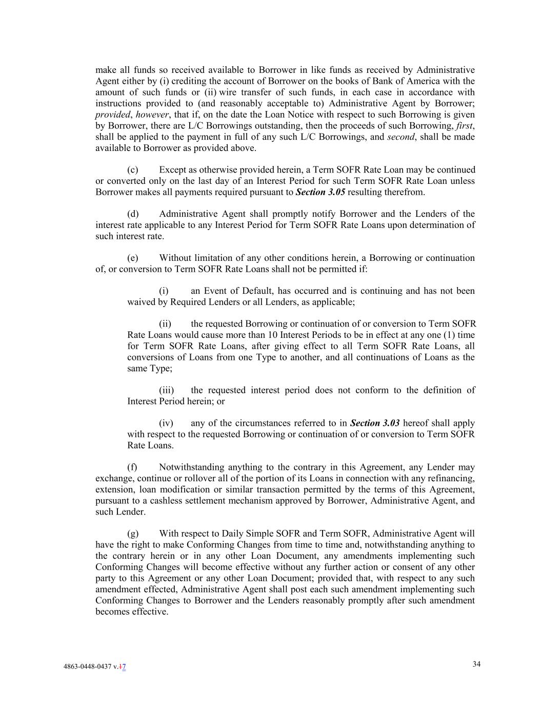 4863-0448-0437 v.17 34 make all funds so received available to Borrower in like funds as received by Administrative Agent either by (i) crediting the account of Borrower on the books of Bank of America with the amount of such funds or (ii) wire transfer of such funds, in each case in accordance with instructions provided to (and reasonably acceptable to) Administrative Agent by Borrower; provided, however, that if, on the date the Loan Notice with respect to such Borrowing is given by Borrower, there are L/C Borrowings outstanding, then the proceeds of such Borrowing, first, shall be applied to the payment in full of any such L/C Borrowings, and second, shall be made available to Borrower as provided above. (c) Except as otherwise provided herein, a Term SOFR Rate Loan may be continued or converted only on the last day of an Interest Period for such Term SOFR Rate Loan unless Borrower makes all payments required pursuant to Section 3.05 resulting therefrom. (d) Administrative Agent shall promptly notify Borrower and the Lenders of the interest rate applicable to any Interest Period for Term SOFR Rate Loans upon determination of such interest rate. (e) Without limitation of any other conditions herein, a Borrowing or continuation of, or conversion to Term SOFR Rate Loans shall not be permitted if: (i) an Event of Default, has occurred and is continuing and has not been waived by Required Lenders or all Lenders, as applicable; (ii) the requested Borrowing or continuation of or conversion to Term SOFR Rate Loans would cause more than 10 Interest Periods to be in effect at any one (1) time for Term SOFR Rate Loans, after giving effect to all Term SOFR Rate Loans, all conversions of Loans from one Type to another, and all continuations of Loans as the same Type; (iii) the requested interest period does not conform to the definition of Interest Period herein; or (iv) any of the circumstances referred to in Section 3.03 hereof shall apply with respect to the requested Borrowing or continuation of or conversion to Term SOFR Rate Loans. (f) Notwithstanding anything to the contrary in this Agreement, any Lender may exchange, continue or rollover all of the portion of its Loans in connection with any refinancing, extension, loan modification or similar transaction permitted by the terms of this Agreement, pursuant to a cashless settlement mechanism approved by Borrower, Administrative Agent, and such Lender. (g) With respect to Daily Simple SOFR and Term SOFR, Administrative Agent will have the right to make Conforming Changes from time to time and, notwithstanding anything to the contrary herein or in any other Loan Document, any amendments implementing such Conforming Changes will become effective without any further action or consent of any other party to this Agreement or any other Loan Document; provided that, with respect to any such amendment effected, Administrative Agent shall post each such amendment implementing such Conforming Changes to Borrower and the Lenders reasonably promptly after such amendment becomes effective.