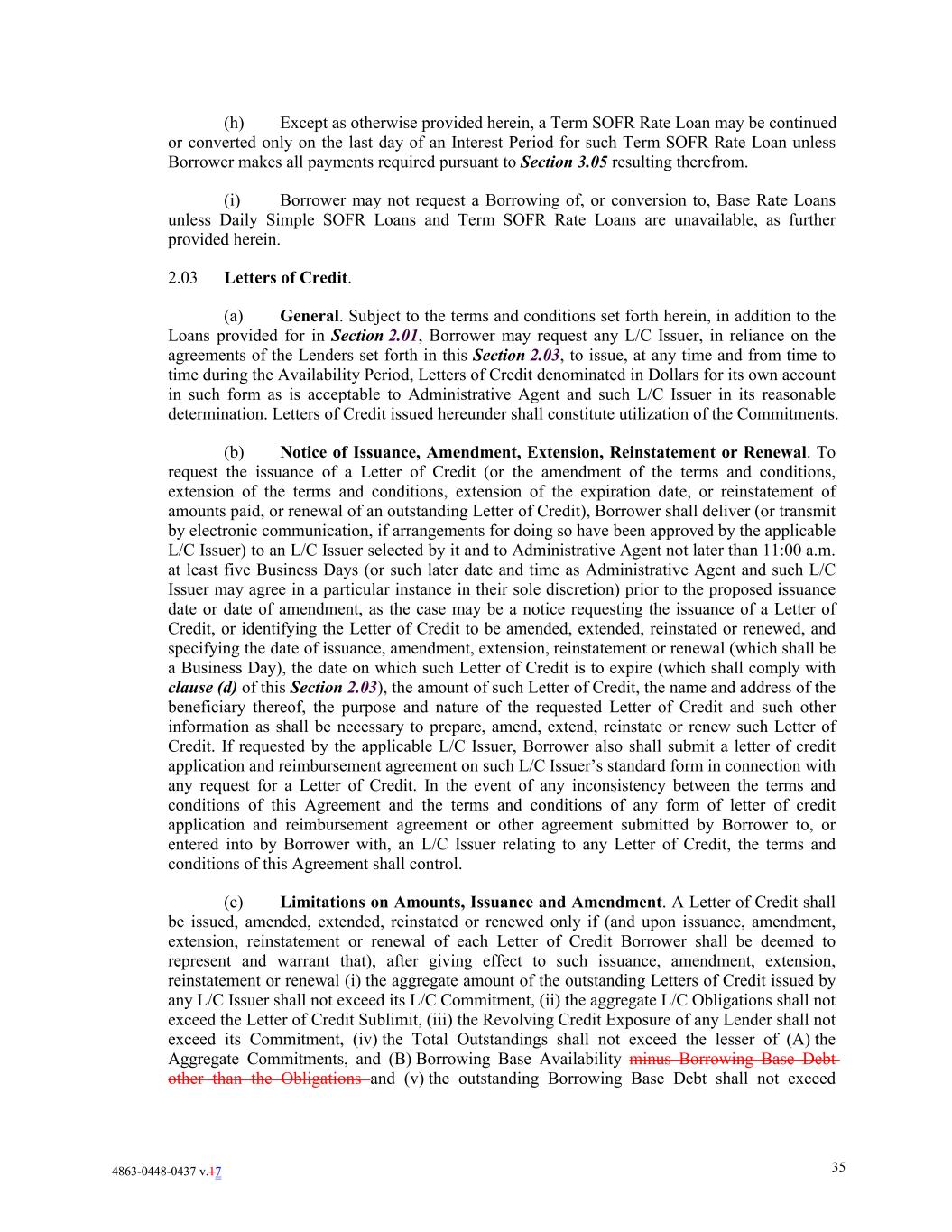 4863-0448-0437 v.17 35 (h) Except as otherwise provided herein, a Term SOFR Rate Loan may be continued or converted only on the last day of an Interest Period for such Term SOFR Rate Loan unless Borrower makes all payments required pursuant to Section 3.05 resulting therefrom. (i) Borrower may not request a Borrowing of, or conversion to, Base Rate Loans unless Daily Simple SOFR Loans and Term SOFR Rate Loans are unavailable, as further provided herein. 2.03 Letters of Credit. (a) General. Subject to the terms and conditions set forth herein, in addition to the Loans provided for in Section 2.01, Borrower may request any L/C Issuer, in reliance on the agreements of the Lenders set forth in this Section 2.03, to issue, at any time and from time to time during the Availability Period, Letters of Credit denominated in Dollars for its own account in such form as is acceptable to Administrative Agent and such L/C Issuer in its reasonable determination. Letters of Credit issued hereunder shall constitute utilization of the Commitments. (b) Notice of Issuance, Amendment, Extension, Reinstatement or Renewal. To request the issuance of a Letter of Credit (or the amendment of the terms and conditions, extension of the terms and conditions, extension of the expiration date, or reinstatement of amounts paid, or renewal of an outstanding Letter of Credit), Borrower shall deliver (or transmit by electronic communication, if arrangements for doing so have been approved by the applicable L/C Issuer) to an L/C Issuer selected by it and to Administrative Agent not later than 11:00 a.m. at least five Business Days (or such later date and time as Administrative Agent and such L/C Issuer may agree in a particular instance in their sole discretion) prior to the proposed issuance date or date of amendment, as the case may be a notice requesting the issuance of a Letter of Credit, or identifying the Letter of Credit to be amended, extended, reinstated or renewed, and specifying the date of issuance, amendment, extension, reinstatement or renewal (which shall be a Business Day), the date on which such Letter of Credit is to expire (which shall comply with clause (d) of this Section 2.03), the amount of such Letter of Credit, the name and address of the beneficiary thereof, the purpose and nature of the requested Letter of Credit and such other information as shall be necessary to prepare, amend, extend, reinstate or renew such Letter of Credit. If requested by the applicable L/C Issuer, Borrower also shall submit a letter of credit application and reimbursement agreement on such L/C Issuer’s standard form in connection with any request for a Letter of Credit. In the event of any inconsistency between the terms and conditions of this Agreement and the terms and conditions of any form of letter of credit application and reimbursement agreement or other agreement submitted by Borrower to, or entered into by Borrower with, an L/C Issuer relating to any Letter of Credit, the terms and conditions of this Agreement shall control. (c) Limitations on Amounts, Issuance and Amendment. A Letter of Credit shall be issued, amended, extended, reinstated or renewed only if (and upon issuance, amendment, extension, reinstatement or renewal of each Letter of Credit Borrower shall be deemed to represent and warrant that), after giving effect to such issuance, amendment, extension, reinstatement or renewal (i) the aggregate amount of the outstanding Letters of Credit issued by any L/C Issuer shall not exceed its L/C Commitment, (ii) the aggregate L/C Obligations shall not exceed the Letter of Credit Sublimit, (iii) the Revolving Credit Exposure of any Lender shall not exceed its Commitment, (iv) the Total Outstandings shall not exceed the lesser of (A) the Aggregate Commitments, and (B) Borrowing Base Availability minus Borrowing Base Debt other than the Obligations and (v) the outstanding Borrowing Base Debt shall not exceed