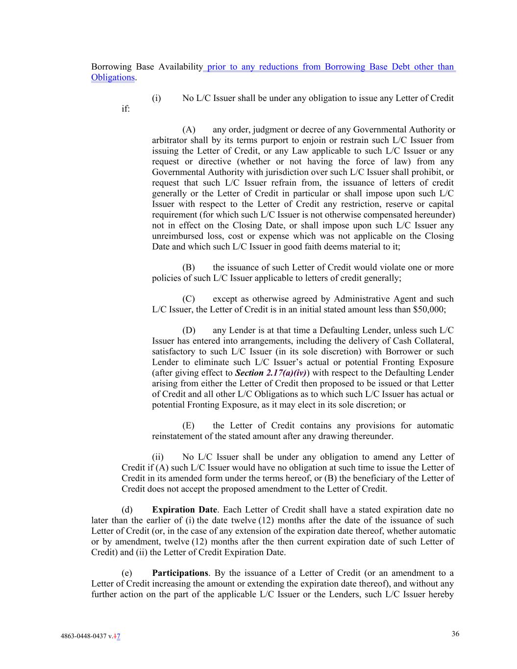 4863-0448-0437 v.17 36 Borrowing Base Availability prior to any reductions from Borrowing Base Debt other than Obligations. (i) No L/C Issuer shall be under any obligation to issue any Letter of Credit if: (A) any order, judgment or decree of any Governmental Authority or arbitrator shall by its terms purport to enjoin or restrain such L/C Issuer from issuing the Letter of Credit, or any Law applicable to such L/C Issuer or any request or directive (whether or not having the force of law) from any Governmental Authority with jurisdiction over such L/C Issuer shall prohibit, or request that such L/C Issuer refrain from, the issuance of letters of credit generally or the Letter of Credit in particular or shall impose upon such L/C Issuer with respect to the Letter of Credit any restriction, reserve or capital requirement (for which such L/C Issuer is not otherwise compensated hereunder) not in effect on the Closing Date, or shall impose upon such L/C Issuer any unreimbursed loss, cost or expense which was not applicable on the Closing Date and which such L/C Issuer in good faith deems material to it; (B) the issuance of such Letter of Credit would violate one or more policies of such L/C Issuer applicable to letters of credit generally; (C) except as otherwise agreed by Administrative Agent and such L/C Issuer, the Letter of Credit is in an initial stated amount less than $50,000; (D) any Lender is at that time a Defaulting Lender, unless such L/C Issuer has entered into arrangements, including the delivery of Cash Collateral, satisfactory to such L/C Issuer (in its sole discretion) with Borrower or such Lender to eliminate such L/C Issuer’s actual or potential Fronting Exposure (after giving effect to Section 2.17(a)(iv)) with respect to the Defaulting Lender arising from either the Letter of Credit then proposed to be issued or that Letter of Credit and all other L/C Obligations as to which such L/C Issuer has actual or potential Fronting Exposure, as it may elect in its sole discretion; or (E) the Letter of Credit contains any provisions for automatic reinstatement of the stated amount after any drawing thereunder. (ii) No L/C Issuer shall be under any obligation to amend any Letter of Credit if (A) such L/C Issuer would have no obligation at such time to issue the Letter of Credit in its amended form under the terms hereof, or (B) the beneficiary of the Letter of Credit does not accept the proposed amendment to the Letter of Credit. (d) Expiration Date. Each Letter of Credit shall have a stated expiration date no later than the earlier of (i) the date twelve (12) months after the date of the issuance of such Letter of Credit (or, in the case of any extension of the expiration date thereof, whether automatic or by amendment, twelve (12) months after the then current expiration date of such Letter of Credit) and (ii) the Letter of Credit Expiration Date. (e) Participations. By the issuance of a Letter of Credit (or an amendment to a Letter of Credit increasing the amount or extending the expiration date thereof), and without any further action on the part of the applicable L/C Issuer or the Lenders, such L/C Issuer hereby