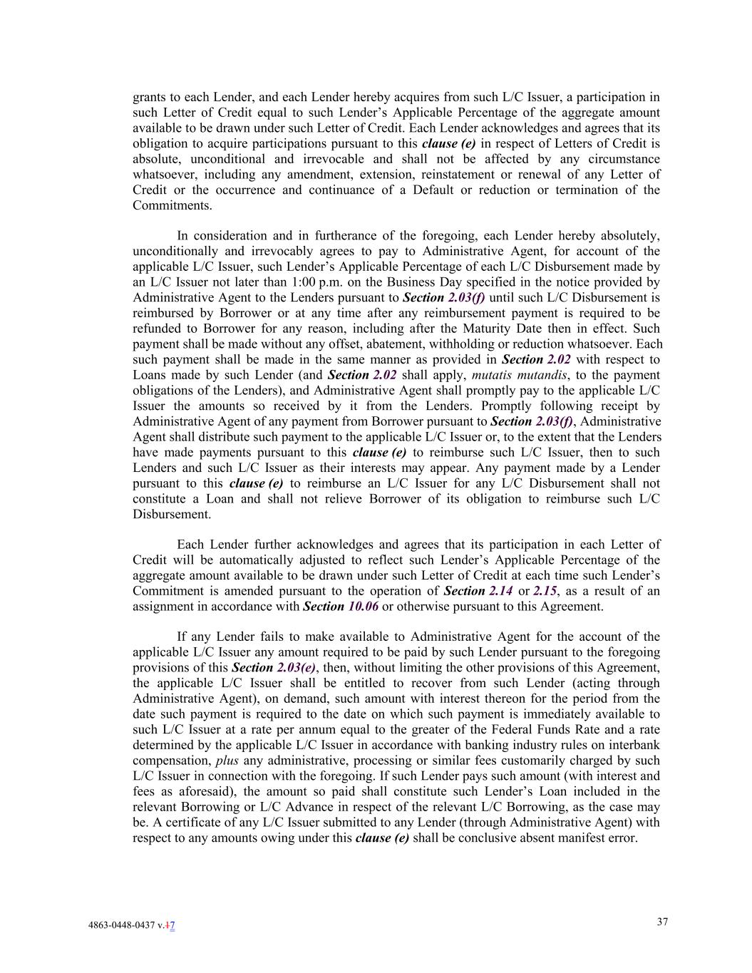 4863-0448-0437 v.17 37 grants to each Lender, and each Lender hereby acquires from such L/C Issuer, a participation in such Letter of Credit equal to such Lender’s Applicable Percentage of the aggregate amount available to be drawn under such Letter of Credit. Each Lender acknowledges and agrees that its obligation to acquire participations pursuant to this clause (e) in respect of Letters of Credit is absolute, unconditional and irrevocable and shall not be affected by any circumstance whatsoever, including any amendment, extension, reinstatement or renewal of any Letter of Credit or the occurrence and continuance of a Default or reduction or termination of the Commitments. In consideration and in furtherance of the foregoing, each Lender hereby absolutely, unconditionally and irrevocably agrees to pay to Administrative Agent, for account of the applicable L/C Issuer, such Lender’s Applicable Percentage of each L/C Disbursement made by an L/C Issuer not later than 1:00 p.m. on the Business Day specified in the notice provided by Administrative Agent to the Lenders pursuant to Section 2.03(f) until such L/C Disbursement is reimbursed by Borrower or at any time after any reimbursement payment is required to be refunded to Borrower for any reason, including after the Maturity Date then in effect. Such payment shall be made without any offset, abatement, withholding or reduction whatsoever. Each such payment shall be made in the same manner as provided in Section 2.02 with respect to Loans made by such Lender (and Section 2.02 shall apply, mutatis mutandis, to the payment obligations of the Lenders), and Administrative Agent shall promptly pay to the applicable L/C Issuer the amounts so received by it from the Lenders. Promptly following receipt by Administrative Agent of any payment from Borrower pursuant to Section 2.03(f), Administrative Agent shall distribute such payment to the applicable L/C Issuer or, to the extent that the Lenders have made payments pursuant to this clause (e) to reimburse such L/C Issuer, then to such Lenders and such L/C Issuer as their interests may appear. Any payment made by a Lender pursuant to this clause (e) to reimburse an L/C Issuer for any L/C Disbursement shall not constitute a Loan and shall not relieve Borrower of its obligation to reimburse such L/C Disbursement. Each Lender further acknowledges and agrees that its participation in each Letter of Credit will be automatically adjusted to reflect such Lender’s Applicable Percentage of the aggregate amount available to be drawn under such Letter of Credit at each time such Lender’s Commitment is amended pursuant to the operation of Section 2.14 or 2.15, as a result of an assignment in accordance with Section 10.06 or otherwise pursuant to this Agreement. If any Lender fails to make available to Administrative Agent for the account of the applicable L/C Issuer any amount required to be paid by such Lender pursuant to the foregoing provisions of this Section 2.03(e), then, without limiting the other provisions of this Agreement, the applicable L/C Issuer shall be entitled to recover from such Lender (acting through Administrative Agent), on demand, such amount with interest thereon for the period from the date such payment is required to the date on which such payment is immediately available to such L/C Issuer at a rate per annum equal to the greater of the Federal Funds Rate and a rate determined by the applicable L/C Issuer in accordance with banking industry rules on interbank compensation, plus any administrative, processing or similar fees customarily charged by such L/C Issuer in connection with the foregoing. If such Lender pays such amount (with interest and fees as aforesaid), the amount so paid shall constitute such Lender’s Loan included in the relevant Borrowing or L/C Advance in respect of the relevant L/C Borrowing, as the case may be. A certificate of any L/C Issuer submitted to any Lender (through Administrative Agent) with respect to any amounts owing under this clause (e) shall be conclusive absent manifest error.