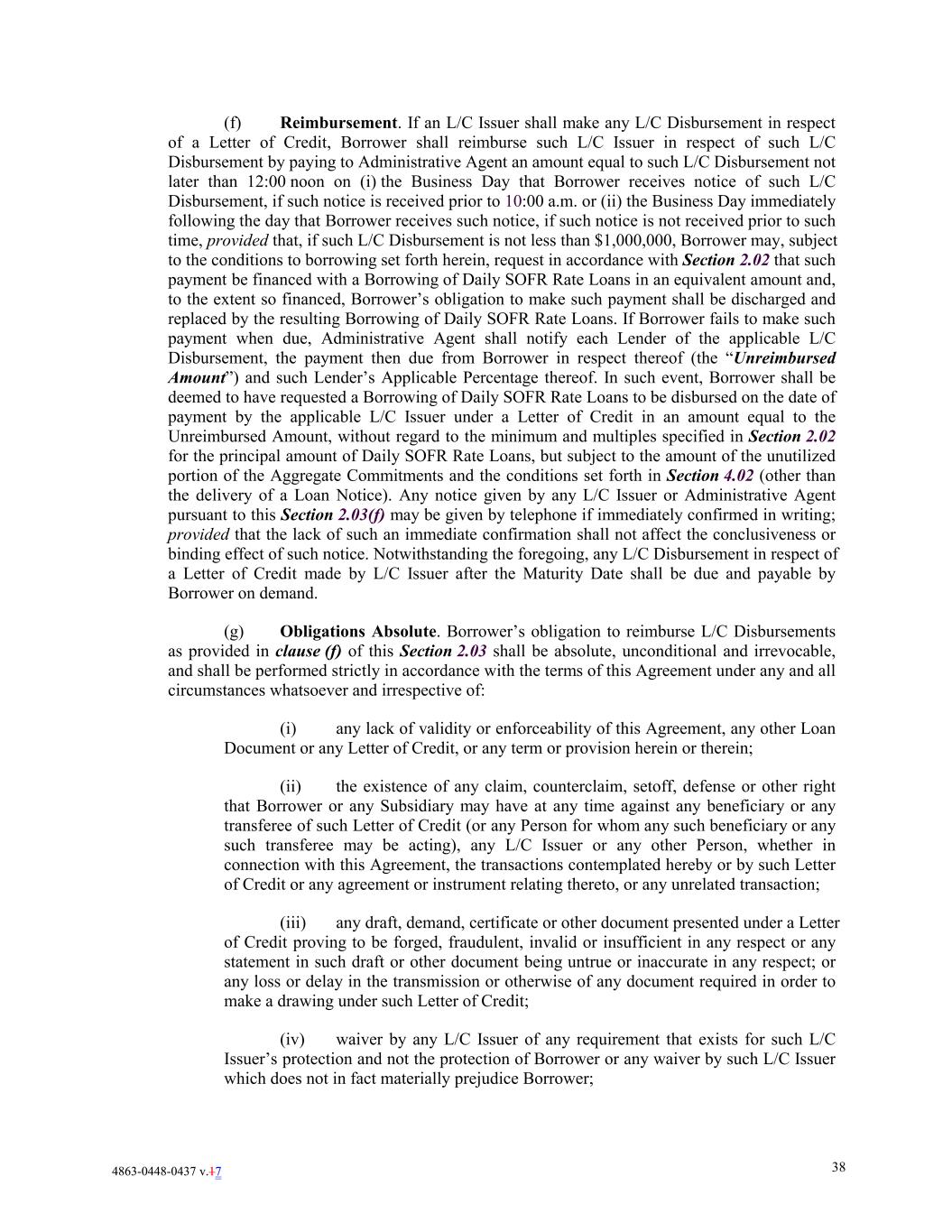 4863-0448-0437 v.17 38 (f) Reimbursement. If an L/C Issuer shall make any L/C Disbursement in respect of a Letter of Credit, Borrower shall reimburse such L/C Issuer in respect of such L/C Disbursement by paying to Administrative Agent an amount equal to such L/C Disbursement not later than 12:00 noon on (i) the Business Day that Borrower receives notice of such L/C Disbursement, if such notice is received prior to 10:00 a.m. or (ii) the Business Day immediately following the day that Borrower receives such notice, if such notice is not received prior to such time, provided that, if such L/C Disbursement is not less than $1,000,000, Borrower may, subject to the conditions to borrowing set forth herein, request in accordance with Section 2.02 that such payment be financed with a Borrowing of Daily SOFR Rate Loans in an equivalent amount and, to the extent so financed, Borrower’s obligation to make such payment shall be discharged and replaced by the resulting Borrowing of Daily SOFR Rate Loans. If Borrower fails to make such payment when due, Administrative Agent shall notify each Lender of the applicable L/C Disbursement, the payment then due from Borrower in respect thereof (the “Unreimbursed Amount”) and such Lender’s Applicable Percentage thereof. In such event, Borrower shall be deemed to have requested a Borrowing of Daily SOFR Rate Loans to be disbursed on the date of payment by the applicable L/C Issuer under a Letter of Credit in an amount equal to the Unreimbursed Amount, without regard to the minimum and multiples specified in Section 2.02 for the principal amount of Daily SOFR Rate Loans, but subject to the amount of the unutilized portion of the Aggregate Commitments and the conditions set forth in Section 4.02 (other than the delivery of a Loan Notice). Any notice given by any L/C Issuer or Administrative Agent pursuant to this Section 2.03(f) may be given by telephone if immediately confirmed in writing; provided that the lack of such an immediate confirmation shall not affect the conclusiveness or binding effect of such notice. Notwithstanding the foregoing, any L/C Disbursement in respect of a Letter of Credit made by L/C Issuer after the Maturity Date shall be due and payable by Borrower on demand. (g) Obligations Absolute. Borrower’s obligation to reimburse L/C Disbursements as provided in clause (f) of this Section 2.03 shall be absolute, unconditional and irrevocable, and shall be performed strictly in accordance with the terms of this Agreement under any and all circumstances whatsoever and irrespective of: (i) any lack of validity or enforceability of this Agreement, any other Loan Document or any Letter of Credit, or any term or provision herein or therein; (ii) the existence of any claim, counterclaim, setoff, defense or other right that Borrower or any Subsidiary may have at any time against any beneficiary or any transferee of such Letter of Credit (or any Person for whom any such beneficiary or any such transferee may be acting), any L/C Issuer or any other Person, whether in connection with this Agreement, the transactions contemplated hereby or by such Letter of Credit or any agreement or instrument relating thereto, or any unrelated transaction; (iii) any draft, demand, certificate or other document presented under a Letter of Credit proving to be forged, fraudulent, invalid or insufficient in any respect or any statement in such draft or other document being untrue or inaccurate in any respect; or any loss or delay in the transmission or otherwise of any document required in order to make a drawing under such Letter of Credit; (iv) waiver by any L/C Issuer of any requirement that exists for such L/C Issuer’s protection and not the protection of Borrower or any waiver by such L/C Issuer which does not in fact materially prejudice Borrower;