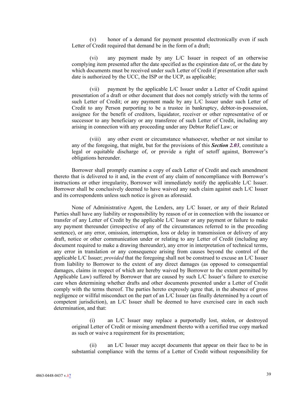 4863-0448-0437 v.17 39 (v) honor of a demand for payment presented electronically even if such Letter of Credit required that demand be in the form of a draft; (vi) any payment made by any L/C Issuer in respect of an otherwise complying item presented after the date specified as the expiration date of, or the date by which documents must be received under such Letter of Credit if presentation after such date is authorized by the UCC, the ISP or the UCP, as applicable; (vii) payment by the applicable L/C Issuer under a Letter of Credit against presentation of a draft or other document that does not comply strictly with the terms of such Letter of Credit; or any payment made by any L/C Issuer under such Letter of Credit to any Person purporting to be a trustee in bankruptcy, debtor-in-possession, assignee for the benefit of creditors, liquidator, receiver or other representative of or successor to any beneficiary or any transferee of such Letter of Credit, including any arising in connection with any proceeding under any Debtor Relief Law; or (viii) any other event or circumstance whatsoever, whether or not similar to any of the foregoing, that might, but for the provisions of this Section 2.03, constitute a legal or equitable discharge of, or provide a right of setoff against, Borrower’s obligations hereunder. Borrower shall promptly examine a copy of each Letter of Credit and each amendment thereto that is delivered to it and, in the event of any claim of noncompliance with Borrower’s instructions or other irregularity, Borrower will immediately notify the applicable L/C Issuer. Borrower shall be conclusively deemed to have waived any such claim against each L/C Issuer and its correspondents unless such notice is given as aforesaid. None of Administrative Agent, the Lenders, any L/C Issuer, or any of their Related Parties shall have any liability or responsibility by reason of or in connection with the issuance or transfer of any Letter of Credit by the applicable L/C Issuer or any payment or failure to make any payment thereunder (irrespective of any of the circumstances referred to in the preceding sentence), or any error, omission, interruption, loss or delay in transmission or delivery of any draft, notice or other communication under or relating to any Letter of Credit (including any document required to make a drawing thereunder), any error in interpretation of technical terms, any error in translation or any consequence arising from causes beyond the control of the applicable L/C Issuer; provided that the foregoing shall not be construed to excuse an L/C Issuer from liability to Borrower to the extent of any direct damages (as opposed to consequential damages, claims in respect of which are hereby waived by Borrower to the extent permitted by Applicable Law) suffered by Borrower that are caused by such L/C Issuer’s failure to exercise care when determining whether drafts and other documents presented under a Letter of Credit comply with the terms thereof. The parties hereto expressly agree that, in the absence of gross negligence or willful misconduct on the part of an L/C Issuer (as finally determined by a court of competent jurisdiction), an L/C Issuer shall be deemed to have exercised care in each such determination, and that: (i) an L/C Issuer may replace a purportedly lost, stolen, or destroyed original Letter of Credit or missing amendment thereto with a certified true copy marked as such or waive a requirement for its presentation; (ii) an L/C Issuer may accept documents that appear on their face to be in substantial compliance with the terms of a Letter of Credit without responsibility for