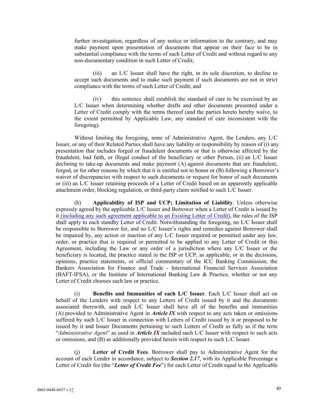 4863-0448-0437 v.17 40 further investigation, regardless of any notice or information to the contrary, and may make payment upon presentation of documents that appear on their face to be in substantial compliance with the terms of such Letter of Credit and without regard to any non-documentary condition in such Letter of Credit; (iii) an L/C Issuer shall have the right, in its sole discretion, to decline to accept such documents and to make such payment if such documents are not in strict compliance with the terms of such Letter of Credit; and (iv) this sentence shall establish the standard of care to be exercised by an L/C Issuer when determining whether drafts and other documents presented under a Letter of Credit comply with the terms thereof (and the parties hereto hereby waive, to the extent permitted by Applicable Law, any standard of care inconsistent with the foregoing). Without limiting the foregoing, none of Administrative Agent, the Lenders, any L/C Issuer, or any of their Related Parties shall have any liability or responsibility by reason of (i) any presentation that includes forged or fraudulent documents or that is otherwise affected by the fraudulent, bad faith, or illegal conduct of the beneficiary or other Person, (ii) an L/C Issuer declining to take-up documents and make payment (A) against documents that are fraudulent, forged, or for other reasons by which that it is entitled not to honor or (B) following a Borrower’s waiver of discrepancies with respect to such documents or request for honor of such documents or (iii) an L/C Issuer retaining proceeds of a Letter of Credit based on an apparently applicable attachment order, blocking regulation, or third-party claim notified to such L/C Issuer. (h) Applicability of ISP and UCP; Limitation of Liability. Unless otherwise expressly agreed by the applicable L/C Issuer and Borrower when a Letter of Credit is issued by it (including any such agreement applicable to an Existing Letter of Credit), the rules of the ISP shall apply to each standby Letter of Credit. Notwithstanding the foregoing, no L/C Issuer shall be responsible to Borrower for, and no L/C Issuer’s rights and remedies against Borrower shall be impaired by, any action or inaction of any L/C Issuer required or permitted under any law, order, or practice that is required or permitted to be applied to any Letter of Credit or this Agreement, including the Law or any order of a jurisdiction where any L/C Issuer or the beneficiary is located, the practice stated in the ISP or UCP, as applicable, or in the decisions, opinions, practice statements, or official commentary of the ICC Banking Commission, the Bankers Association for Finance and Trade - International Financial Services Association (BAFT-IFSA), or the Institute of International Banking Law & Practice, whether or not any Letter of Credit chooses such law or practice. (i) Benefits and Immunities of each L/C Issuer. Each L/C Issuer shall act on behalf of the Lenders with respect to any Letters of Credit issued by it and the documents associated therewith, and each L/C Issuer shall have all of the benefits and immunities (A) provided to Administrative Agent in Article IX with respect to any acts taken or omissions suffered by such L/C Issuer in connection with Letters of Credit issued by it or proposed to be issued by it and Issuer Documents pertaining to such Letters of Credit as fully as if the term “Administrative Agent” as used in Article IX included such L/C Issuer with respect to such acts or omissions, and (B) as additionally provided herein with respect to such L/C Issuer. (j) Letter of Credit Fees. Borrower shall pay to Administrative Agent for the account of each Lender in accordance, subject to Section 2.17, with its Applicable Percentage a Letter of Credit fee (the “Letter of Credit Fee”) for each Letter of Credit equal to the Applicable