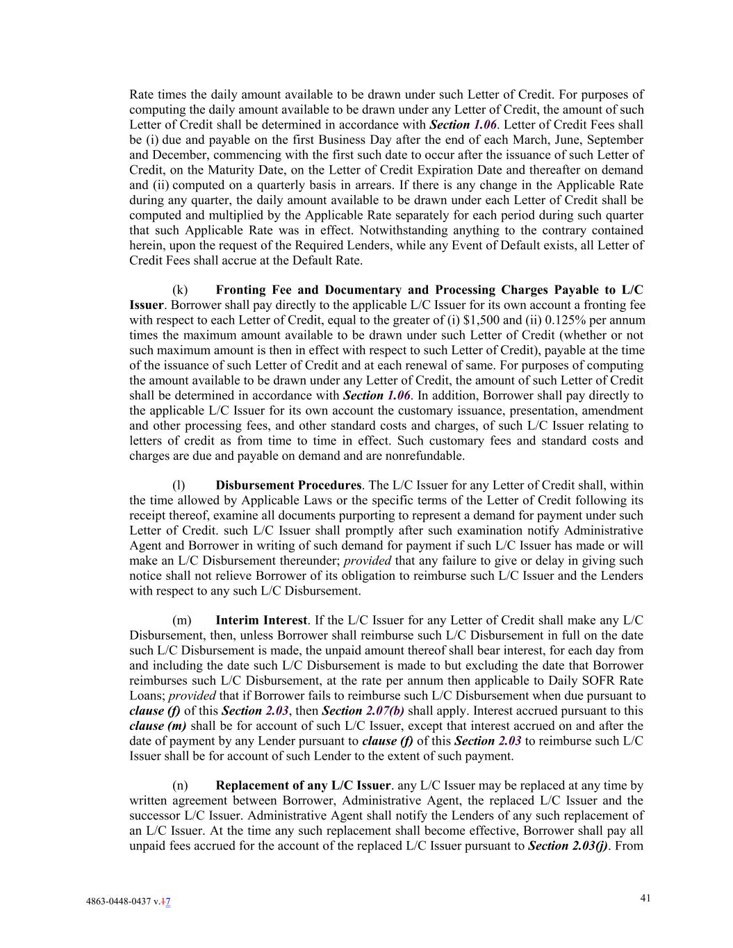 4863-0448-0437 v.17 41 Rate times the daily amount available to be drawn under such Letter of Credit. For purposes of computing the daily amount available to be drawn under any Letter of Credit, the amount of such Letter of Credit shall be determined in accordance with Section 1.06. Letter of Credit Fees shall be (i) due and payable on the first Business Day after the end of each March, June, September and December, commencing with the first such date to occur after the issuance of such Letter of Credit, on the Maturity Date, on the Letter of Credit Expiration Date and thereafter on demand and (ii) computed on a quarterly basis in arrears. If there is any change in the Applicable Rate during any quarter, the daily amount available to be drawn under each Letter of Credit shall be computed and multiplied by the Applicable Rate separately for each period during such quarter that such Applicable Rate was in effect. Notwithstanding anything to the contrary contained herein, upon the request of the Required Lenders, while any Event of Default exists, all Letter of Credit Fees shall accrue at the Default Rate. (k) Fronting Fee and Documentary and Processing Charges Payable to L/C Issuer. Borrower shall pay directly to the applicable L/C Issuer for its own account a fronting fee with respect to each Letter of Credit, equal to the greater of (i) $1,500 and (ii) 0.125% per annum times the maximum amount available to be drawn under such Letter of Credit (whether or not such maximum amount is then in effect with respect to such Letter of Credit), payable at the time of the issuance of such Letter of Credit and at each renewal of same. For purposes of computing the amount available to be drawn under any Letter of Credit, the amount of such Letter of Credit shall be determined in accordance with Section 1.06. In addition, Borrower shall pay directly to the applicable L/C Issuer for its own account the customary issuance, presentation, amendment and other processing fees, and other standard costs and charges, of such L/C Issuer relating to letters of credit as from time to time in effect. Such customary fees and standard costs and charges are due and payable on demand and are nonrefundable. (l) Disbursement Procedures. The L/C Issuer for any Letter of Credit shall, within the time allowed by Applicable Laws or the specific terms of the Letter of Credit following its receipt thereof, examine all documents purporting to represent a demand for payment under such Letter of Credit. such L/C Issuer shall promptly after such examination notify Administrative Agent and Borrower in writing of such demand for payment if such L/C Issuer has made or will make an L/C Disbursement thereunder; provided that any failure to give or delay in giving such notice shall not relieve Borrower of its obligation to reimburse such L/C Issuer and the Lenders with respect to any such L/C Disbursement. (m) Interim Interest. If the L/C Issuer for any Letter of Credit shall make any L/C Disbursement, then, unless Borrower shall reimburse such L/C Disbursement in full on the date such L/C Disbursement is made, the unpaid amount thereof shall bear interest, for each day from and including the date such L/C Disbursement is made to but excluding the date that Borrower reimburses such L/C Disbursement, at the rate per annum then applicable to Daily SOFR Rate Loans; provided that if Borrower fails to reimburse such L/C Disbursement when due pursuant to clause (f) of this Section 2.03, then Section 2.07(b) shall apply. Interest accrued pursuant to this clause (m) shall be for account of such L/C Issuer, except that interest accrued on and after the date of payment by any Lender pursuant to clause (f) of this Section 2.03 to reimburse such L/C Issuer shall be for account of such Lender to the extent of such payment. (n) Replacement of any L/C Issuer. any L/C Issuer may be replaced at any time by written agreement between Borrower, Administrative Agent, the replaced L/C Issuer and the successor L/C Issuer. Administrative Agent shall notify the Lenders of any such replacement of an L/C Issuer. At the time any such replacement shall become effective, Borrower shall pay all unpaid fees accrued for the account of the replaced L/C Issuer pursuant to Section 2.03(j). From
