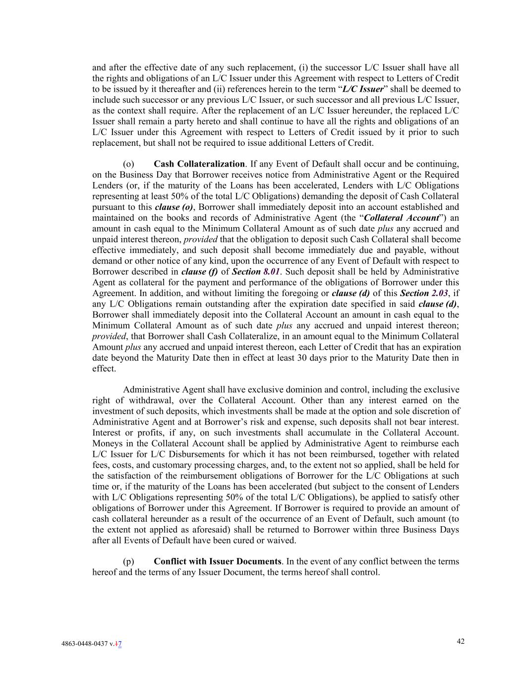 4863-0448-0437 v.17 42 and after the effective date of any such replacement, (i) the successor L/C Issuer shall have all the rights and obligations of an L/C Issuer under this Agreement with respect to Letters of Credit to be issued by it thereafter and (ii) references herein to the term “L/C Issuer” shall be deemed to include such successor or any previous L/C Issuer, or such successor and all previous L/C Issuer, as the context shall require. After the replacement of an L/C Issuer hereunder, the replaced L/C Issuer shall remain a party hereto and shall continue to have all the rights and obligations of an L/C Issuer under this Agreement with respect to Letters of Credit issued by it prior to such replacement, but shall not be required to issue additional Letters of Credit. (o) Cash Collateralization. If any Event of Default shall occur and be continuing, on the Business Day that Borrower receives notice from Administrative Agent or the Required Lenders (or, if the maturity of the Loans has been accelerated, Lenders with L/C Obligations representing at least 50% of the total L/C Obligations) demanding the deposit of Cash Collateral pursuant to this clause (o), Borrower shall immediately deposit into an account established and maintained on the books and records of Administrative Agent (the “Collateral Account”) an amount in cash equal to the Minimum Collateral Amount as of such date plus any accrued and unpaid interest thereon, provided that the obligation to deposit such Cash Collateral shall become effective immediately, and such deposit shall become immediately due and payable, without demand or other notice of any kind, upon the occurrence of any Event of Default with respect to Borrower described in clause (f) of Section 8.01. Such deposit shall be held by Administrative Agent as collateral for the payment and performance of the obligations of Borrower under this Agreement. In addition, and without limiting the foregoing or clause (d) of this Section 2.03, if any L/C Obligations remain outstanding after the expiration date specified in said clause (d), Borrower shall immediately deposit into the Collateral Account an amount in cash equal to the Minimum Collateral Amount as of such date plus any accrued and unpaid interest thereon; provided, that Borrower shall Cash Collateralize, in an amount equal to the Minimum Collateral Amount plus any accrued and unpaid interest thereon, each Letter of Credit that has an expiration date beyond the Maturity Date then in effect at least 30 days prior to the Maturity Date then in effect. Administrative Agent shall have exclusive dominion and control, including the exclusive right of withdrawal, over the Collateral Account. Other than any interest earned on the investment of such deposits, which investments shall be made at the option and sole discretion of Administrative Agent and at Borrower’s risk and expense, such deposits shall not bear interest. Interest or profits, if any, on such investments shall accumulate in the Collateral Account. Moneys in the Collateral Account shall be applied by Administrative Agent to reimburse each L/C Issuer for L/C Disbursements for which it has not been reimbursed, together with related fees, costs, and customary processing charges, and, to the extent not so applied, shall be held for the satisfaction of the reimbursement obligations of Borrower for the L/C Obligations at such time or, if the maturity of the Loans has been accelerated (but subject to the consent of Lenders with L/C Obligations representing 50% of the total L/C Obligations), be applied to satisfy other obligations of Borrower under this Agreement. If Borrower is required to provide an amount of cash collateral hereunder as a result of the occurrence of an Event of Default, such amount (to the extent not applied as aforesaid) shall be returned to Borrower within three Business Days after all Events of Default have been cured or waived. (p) Conflict with Issuer Documents. In the event of any conflict between the terms hereof and the terms of any Issuer Document, the terms hereof shall control.