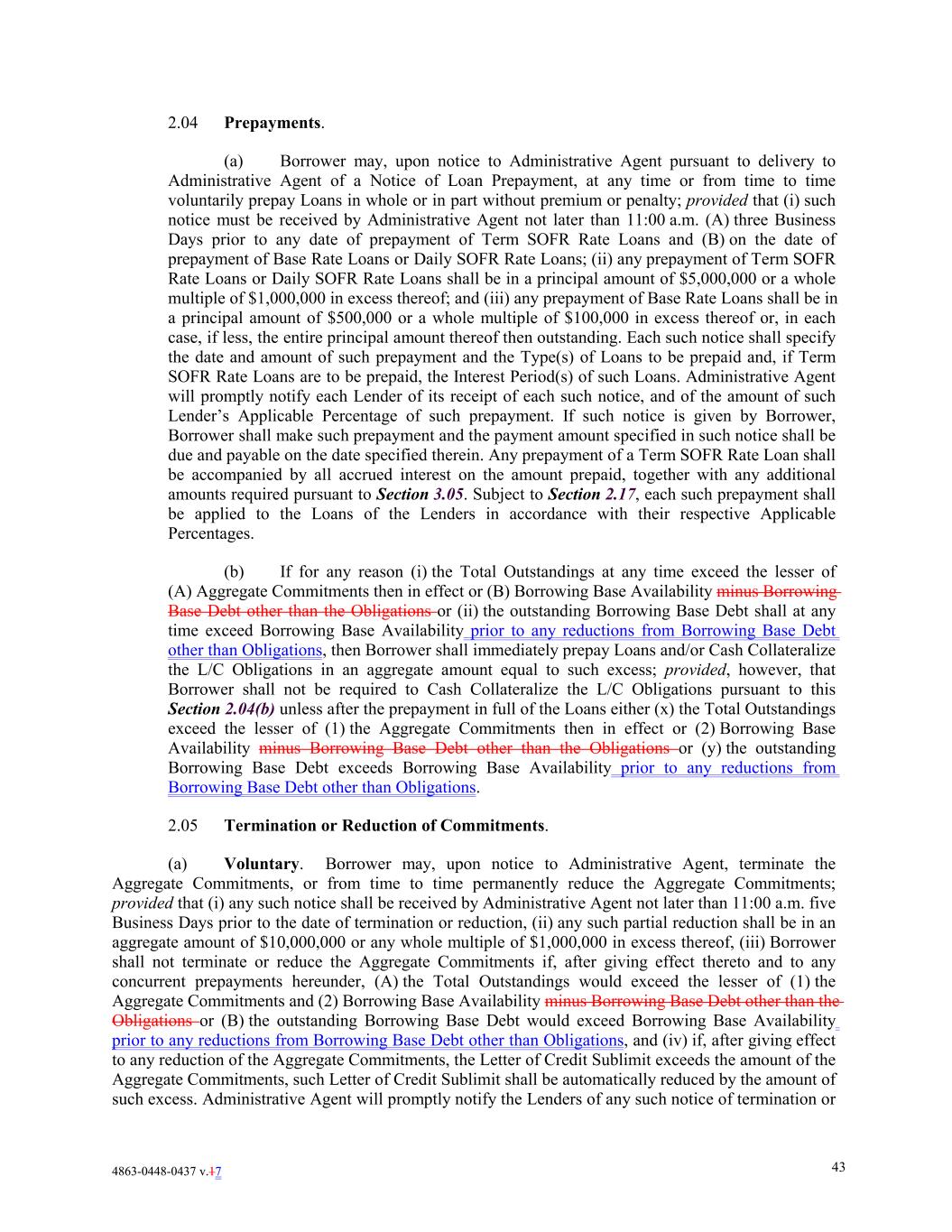 4863-0448-0437 v.17 43 2.04 Prepayments. (a) Borrower may, upon notice to Administrative Agent pursuant to delivery to Administrative Agent of a Notice of Loan Prepayment, at any time or from time to time voluntarily prepay Loans in whole or in part without premium or penalty; provided that (i) such notice must be received by Administrative Agent not later than 11:00 a.m. (A) three Business Days prior to any date of prepayment of Term SOFR Rate Loans and (B) on the date of prepayment of Base Rate Loans or Daily SOFR Rate Loans; (ii) any prepayment of Term SOFR Rate Loans or Daily SOFR Rate Loans shall be in a principal amount of $5,000,000 or a whole multiple of $1,000,000 in excess thereof; and (iii) any prepayment of Base Rate Loans shall be in a principal amount of $500,000 or a whole multiple of $100,000 in excess thereof or, in each case, if less, the entire principal amount thereof then outstanding. Each such notice shall specify the date and amount of such prepayment and the Type(s) of Loans to be prepaid and, if Term SOFR Rate Loans are to be prepaid, the Interest Period(s) of such Loans. Administrative Agent will promptly notify each Lender of its receipt of each such notice, and of the amount of such Lender’s Applicable Percentage of such prepayment. If such notice is given by Borrower, Borrower shall make such prepayment and the payment amount specified in such notice shall be due and payable on the date specified therein. Any prepayment of a Term SOFR Rate Loan shall be accompanied by all accrued interest on the amount prepaid, together with any additional amounts required pursuant to Section 3.05. Subject to Section 2.17, each such prepayment shall be applied to the Loans of the Lenders in accordance with their respective Applicable Percentages. (b) If for any reason (i) the Total Outstandings at any time exceed the lesser of (A) Aggregate Commitments then in effect or (B) Borrowing Base Availability minus Borrowing Base Debt other than the Obligations or (ii) the outstanding Borrowing Base Debt shall at any time exceed Borrowing Base Availability prior to any reductions from Borrowing Base Debt other than Obligations, then Borrower shall immediately prepay Loans and/or Cash Collateralize the L/C Obligations in an aggregate amount equal to such excess; provided, however, that Borrower shall not be required to Cash Collateralize the L/C Obligations pursuant to this Section 2.04(b) unless after the prepayment in full of the Loans either (x) the Total Outstandings exceed the lesser of (1) the Aggregate Commitments then in effect or (2) Borrowing Base Availability minus Borrowing Base Debt other than the Obligations or (y) the outstanding Borrowing Base Debt exceeds Borrowing Base Availability prior to any reductions from Borrowing Base Debt other than Obligations. 2.05 Termination or Reduction of Commitments. (a) Voluntary. Borrower may, upon notice to Administrative Agent, terminate the Aggregate Commitments, or from time to time permanently reduce the Aggregate Commitments; provided that (i) any such notice shall be received by Administrative Agent not later than 11:00 a.m. five Business Days prior to the date of termination or reduction, (ii) any such partial reduction shall be in an aggregate amount of $10,000,000 or any whole multiple of $1,000,000 in excess thereof, (iii) Borrower shall not terminate or reduce the Aggregate Commitments if, after giving effect thereto and to any concurrent prepayments hereunder, (A) the Total Outstandings would exceed the lesser of (1) the Aggregate Commitments and (2) Borrowing Base Availability minus Borrowing Base Debt other than the Obligations or (B) the outstanding Borrowing Base Debt would exceed Borrowing Base Availability prior to any reductions from Borrowing Base Debt other than Obligations, and (iv) if, after giving effect to any reduction of the Aggregate Commitments, the Letter of Credit Sublimit exceeds the amount of the Aggregate Commitments, such Letter of Credit Sublimit shall be automatically reduced by the amount of such excess. Administrative Agent will promptly notify the Lenders of any such notice of termination or