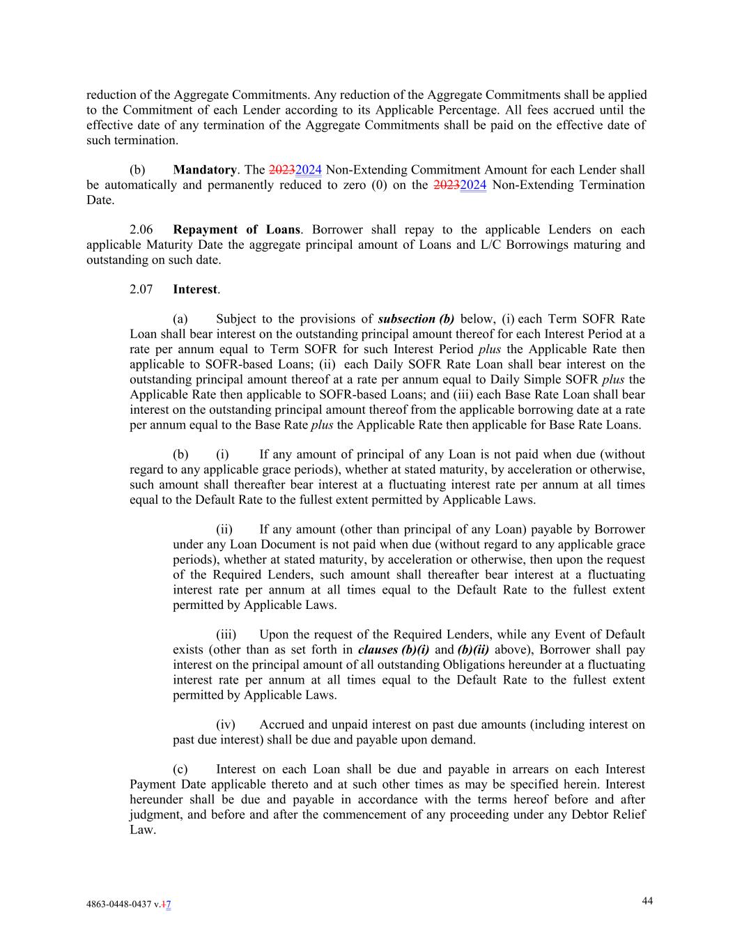 4863-0448-0437 v.17 44 reduction of the Aggregate Commitments. Any reduction of the Aggregate Commitments shall be applied to the Commitment of each Lender according to its Applicable Percentage. All fees accrued until the effective date of any termination of the Aggregate Commitments shall be paid on the effective date of such termination. (b) Mandatory. The 20232024 Non-Extending Commitment Amount for each Lender shall be automatically and permanently reduced to zero (0) on the 20232024 Non-Extending Termination Date. 2.06 Repayment of Loans. Borrower shall repay to the applicable Lenders on each applicable Maturity Date the aggregate principal amount of Loans and L/C Borrowings maturing and outstanding on such date. 2.07 Interest. (a) Subject to the provisions of subsection (b) below, (i) each Term SOFR Rate Loan shall bear interest on the outstanding principal amount thereof for each Interest Period at a rate per annum equal to Term SOFR for such Interest Period plus the Applicable Rate then applicable to SOFR-based Loans; (ii) each Daily SOFR Rate Loan shall bear interest on the outstanding principal amount thereof at a rate per annum equal to Daily Simple SOFR plus the Applicable Rate then applicable to SOFR-based Loans; and (iii) each Base Rate Loan shall bear interest on the outstanding principal amount thereof from the applicable borrowing date at a rate per annum equal to the Base Rate plus the Applicable Rate then applicable for Base Rate Loans. (b) (i) If any amount of principal of any Loan is not paid when due (without regard to any applicable grace periods), whether at stated maturity, by acceleration or otherwise, such amount shall thereafter bear interest at a fluctuating interest rate per annum at all times equal to the Default Rate to the fullest extent permitted by Applicable Laws. (ii) If any amount (other than principal of any Loan) payable by Borrower under any Loan Document is not paid when due (without regard to any applicable grace periods), whether at stated maturity, by acceleration or otherwise, then upon the request of the Required Lenders, such amount shall thereafter bear interest at a fluctuating interest rate per annum at all times equal to the Default Rate to the fullest extent permitted by Applicable Laws. (iii) Upon the request of the Required Lenders, while any Event of Default exists (other than as set forth in clauses (b)(i) and (b)(ii) above), Borrower shall pay interest on the principal amount of all outstanding Obligations hereunder at a fluctuating interest rate per annum at all times equal to the Default Rate to the fullest extent permitted by Applicable Laws. (iv) Accrued and unpaid interest on past due amounts (including interest on past due interest) shall be due and payable upon demand. (c) Interest on each Loan shall be due and payable in arrears on each Interest Payment Date applicable thereto and at such other times as may be specified herein. Interest hereunder shall be due and payable in accordance with the terms hereof before and after judgment, and before and after the commencement of any proceeding under any Debtor Relief Law.