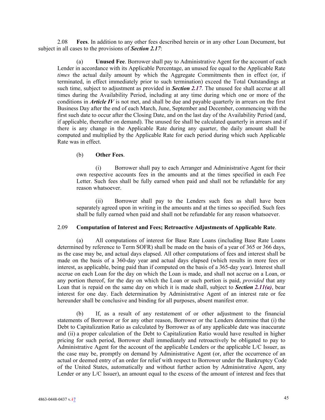 4863-0448-0437 v.17 45 2.08 Fees. In addition to any other fees described herein or in any other Loan Document, but subject in all cases to the provisions of Section 2.17: (a) Unused Fee. Borrower shall pay to Administrative Agent for the account of each Lender in accordance with its Applicable Percentage, an unused fee equal to the Applicable Rate times the actual daily amount by which the Aggregate Commitments then in effect (or, if terminated, in effect immediately prior to such termination) exceed the Total Outstandings at such time, subject to adjustment as provided in Section 2.17. The unused fee shall accrue at all times during the Availability Period, including at any time during which one or more of the conditions in Article IV is not met, and shall be due and payable quarterly in arrears on the first Business Day after the end of each March, June, September and December, commencing with the first such date to occur after the Closing Date, and on the last day of the Availability Period (and, if applicable, thereafter on demand). The unused fee shall be calculated quarterly in arrears and if there is any change in the Applicable Rate during any quarter, the daily amount shall be computed and multiplied by the Applicable Rate for each period during which such Applicable Rate was in effect. (b) Other Fees. (i) Borrower shall pay to each Arranger and Administrative Agent for their own respective accounts fees in the amounts and at the times specified in each Fee Letter. Such fees shall be fully earned when paid and shall not be refundable for any reason whatsoever. (ii) Borrower shall pay to the Lenders such fees as shall have been separately agreed upon in writing in the amounts and at the times so specified. Such fees shall be fully earned when paid and shall not be refundable for any reason whatsoever. 2.09 Computation of Interest and Fees; Retroactive Adjustments of Applicable Rate. (a) All computations of interest for Base Rate Loans (including Base Rate Loans determined by reference to Term SOFR) shall be made on the basis of a year of 365 or 366 days, as the case may be, and actual days elapsed. All other computations of fees and interest shall be made on the basis of a 360-day year and actual days elapsed (which results in more fees or interest, as applicable, being paid than if computed on the basis of a 365-day year). Interest shall accrue on each Loan for the day on which the Loan is made, and shall not accrue on a Loan, or any portion thereof, for the day on which the Loan or such portion is paid, provided that any Loan that is repaid on the same day on which it is made shall, subject to Section 2.11(a), bear interest for one day. Each determination by Administrative Agent of an interest rate or fee hereunder shall be conclusive and binding for all purposes, absent manifest error. (b) If, as a result of any restatement of or other adjustment to the financial statements of Borrower or for any other reason, Borrower or the Lenders determine that (i) the Debt to Capitalization Ratio as calculated by Borrower as of any applicable date was inaccurate and (ii) a proper calculation of the Debt to Capitalization Ratio would have resulted in higher pricing for such period, Borrower shall immediately and retroactively be obligated to pay to Administrative Agent for the account of the applicable Lenders or the applicable L/C Issuer, as the case may be, promptly on demand by Administrative Agent (or, after the occurrence of an actual or deemed entry of an order for relief with respect to Borrower under the Bankruptcy Code of the United States, automatically and without further action by Administrative Agent, any Lender or any L/C Issuer), an amount equal to the excess of the amount of interest and fees that