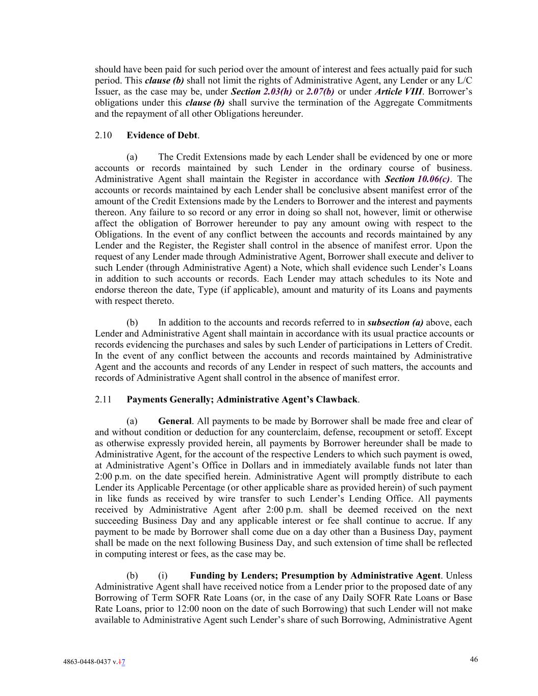 4863-0448-0437 v.17 46 should have been paid for such period over the amount of interest and fees actually paid for such period. This clause (b) shall not limit the rights of Administrative Agent, any Lender or any L/C Issuer, as the case may be, under Section 2.03(h) or 2.07(b) or under Article VIII. Borrower’s obligations under this clause (b) shall survive the termination of the Aggregate Commitments and the repayment of all other Obligations hereunder. 2.10 Evidence of Debt. (a) The Credit Extensions made by each Lender shall be evidenced by one or more accounts or records maintained by such Lender in the ordinary course of business. Administrative Agent shall maintain the Register in accordance with Section 10.06(c). The accounts or records maintained by each Lender shall be conclusive absent manifest error of the amount of the Credit Extensions made by the Lenders to Borrower and the interest and payments thereon. Any failure to so record or any error in doing so shall not, however, limit or otherwise affect the obligation of Borrower hereunder to pay any amount owing with respect to the Obligations. In the event of any conflict between the accounts and records maintained by any Lender and the Register, the Register shall control in the absence of manifest error. Upon the request of any Lender made through Administrative Agent, Borrower shall execute and deliver to such Lender (through Administrative Agent) a Note, which shall evidence such Lender’s Loans in addition to such accounts or records. Each Lender may attach schedules to its Note and endorse thereon the date, Type (if applicable), amount and maturity of its Loans and payments with respect thereto. (b) In addition to the accounts and records referred to in subsection (a) above, each Lender and Administrative Agent shall maintain in accordance with its usual practice accounts or records evidencing the purchases and sales by such Lender of participations in Letters of Credit. In the event of any conflict between the accounts and records maintained by Administrative Agent and the accounts and records of any Lender in respect of such matters, the accounts and records of Administrative Agent shall control in the absence of manifest error. 2.11 Payments Generally; Administrative Agent’s Clawback. (a) General. All payments to be made by Borrower shall be made free and clear of and without condition or deduction for any counterclaim, defense, recoupment or setoff. Except as otherwise expressly provided herein, all payments by Borrower hereunder shall be made to Administrative Agent, for the account of the respective Lenders to which such payment is owed, at Administrative Agent’s Office in Dollars and in immediately available funds not later than 2:00 p.m. on the date specified herein. Administrative Agent will promptly distribute to each Lender its Applicable Percentage (or other applicable share as provided herein) of such payment in like funds as received by wire transfer to such Lender’s Lending Office. All payments received by Administrative Agent after 2:00 p.m. shall be deemed received on the next succeeding Business Day and any applicable interest or fee shall continue to accrue. If any payment to be made by Borrower shall come due on a day other than a Business Day, payment shall be made on the next following Business Day, and such extension of time shall be reflected in computing interest or fees, as the case may be. (b) (i) Funding by Lenders; Presumption by Administrative Agent. Unless Administrative Agent shall have received notice from a Lender prior to the proposed date of any Borrowing of Term SOFR Rate Loans (or, in the case of any Daily SOFR Rate Loans or Base Rate Loans, prior to 12:00 noon on the date of such Borrowing) that such Lender will not make available to Administrative Agent such Lender’s share of such Borrowing, Administrative Agent