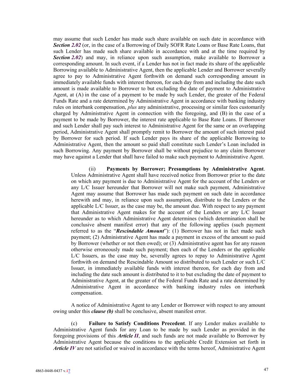 4863-0448-0437 v.17 47 may assume that such Lender has made such share available on such date in accordance with Section 2.02 (or, in the case of a Borrowing of Daily SOFR Rate Loans or Base Rate Loans, that such Lender has made such share available in accordance with and at the time required by Section 2.02) and may, in reliance upon such assumption, make available to Borrower a corresponding amount. In such event, if a Lender has not in fact made its share of the applicable Borrowing available to Administrative Agent, then the applicable Lender and Borrower severally agree to pay to Administrative Agent forthwith on demand such corresponding amount in immediately available funds with interest thereon, for each day from and including the date such amount is made available to Borrower to but excluding the date of payment to Administrative Agent, at (A) in the case of a payment to be made by such Lender, the greater of the Federal Funds Rate and a rate determined by Administrative Agent in accordance with banking industry rules on interbank compensation, plus any administrative, processing or similar fees customarily charged by Administrative Agent in connection with the foregoing, and (B) in the case of a payment to be made by Borrower, the interest rate applicable to Base Rate Loans. If Borrower and such Lender shall pay such interest to Administrative Agent for the same or an overlapping period, Administrative Agent shall promptly remit to Borrower the amount of such interest paid by Borrower for such period. If such Lender pays its share of the applicable Borrowing to Administrative Agent, then the amount so paid shall constitute such Lender’s Loan included in such Borrowing. Any payment by Borrower shall be without prejudice to any claim Borrower may have against a Lender that shall have failed to make such payment to Administrative Agent. (ii) Payments by Borrower; Presumptions by Administrative Agent. Unless Administrative Agent shall have received notice from Borrower prior to the date on which any payment is due to Administrative Agent for the account of the Lenders or any L/C Issuer hereunder that Borrower will not make such payment, Administrative Agent may assume that Borrower has made such payment on such date in accordance herewith and may, in reliance upon such assumption, distribute to the Lenders or the applicable L/C Issuer, as the case may be, the amount due. With respect to any payment that Administrative Agent makes for the account of the Lenders or any L/C Issuer hereunder as to which Administrative Agent determines (which determination shall be conclusive absent manifest error) that any of the following applies (such payment referred to as the “Rescindable Amount”): (1) Borrower has not in fact made such payment; (2) Administrative Agent has made a payment in excess of the amount so paid by Borrower (whether or not then owed); or (3) Administrative agent has for any reason otherwise erroneously made such payment; then each of the Lenders or the applicable L/C Issuers, as the case may be, severally agrees to repay to Administrative Agent forthwith on demand the Rescindable Amount so distributed to such Lender or such L/C Issuer, in immediately available funds with interest thereon, for each day from and including the date such amount is distributed to it to but excluding the date of payment to Administrative Agent, at the greater of the Federal Funds Rate and a rate determined by Administrative Agent in accordance with banking industry rules on interbank compensation. A notice of Administrative Agent to any Lender or Borrower with respect to any amount owing under this clause (b) shall be conclusive, absent manifest error. (c) Failure to Satisfy Conditions Precedent. If any Lender makes available to Administrative Agent funds for any Loan to be made by such Lender as provided in the foregoing provisions of this Article II, and such funds are not made available to Borrower by Administrative Agent because the conditions to the applicable Credit Extension set forth in Article IV are not satisfied or waived in accordance with the terms hereof, Administrative Agent