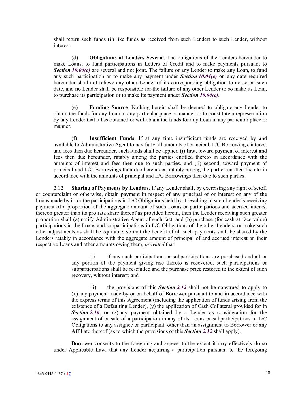 4863-0448-0437 v.17 48 shall return such funds (in like funds as received from such Lender) to such Lender, without interest. (d) Obligations of Lenders Several. The obligations of the Lenders hereunder to make Loans, to fund participations in Letters of Credit and to make payments pursuant to Section 10.04(c) are several and not joint. The failure of any Lender to make any Loan, to fund any such participation or to make any payment under Section 10.04(c) on any date required hereunder shall not relieve any other Lender of its corresponding obligation to do so on such date, and no Lender shall be responsible for the failure of any other Lender to so make its Loan, to purchase its participation or to make its payment under Section 10.04(c). (e) Funding Source. Nothing herein shall be deemed to obligate any Lender to obtain the funds for any Loan in any particular place or manner or to constitute a representation by any Lender that it has obtained or will obtain the funds for any Loan in any particular place or manner. (f) Insufficient Funds. If at any time insufficient funds are received by and available to Administrative Agent to pay fully all amounts of principal, L/C Borrowings, interest and fees then due hereunder, such funds shall be applied (i) first, toward payment of interest and fees then due hereunder, ratably among the parties entitled thereto in accordance with the amounts of interest and fees then due to such parties, and (ii) second, toward payment of principal and L/C Borrowings then due hereunder, ratably among the parties entitled thereto in accordance with the amounts of principal and L/C Borrowings then due to such parties. 2.12 Sharing of Payments by Lenders. If any Lender shall, by exercising any right of setoff or counterclaim or otherwise, obtain payment in respect of any principal of or interest on any of the Loans made by it, or the participations in L/C Obligations held by it resulting in such Lender’s receiving payment of a proportion of the aggregate amount of such Loans or participations and accrued interest thereon greater than its pro rata share thereof as provided herein, then the Lender receiving such greater proportion shall (a) notify Administrative Agent of such fact, and (b) purchase (for cash at face value) participations in the Loans and subparticipations in L/C Obligations of the other Lenders, or make such other adjustments as shall be equitable, so that the benefit of all such payments shall be shared by the Lenders ratably in accordance with the aggregate amount of principal of and accrued interest on their respective Loans and other amounts owing them, provided that: (i) if any such participations or subparticipations are purchased and all or any portion of the payment giving rise thereto is recovered, such participations or subparticipations shall be rescinded and the purchase price restored to the extent of such recovery, without interest; and (ii) the provisions of this Section 2.12 shall not be construed to apply to (x) any payment made by or on behalf of Borrower pursuant to and in accordance with the express terms of this Agreement (including the application of funds arising from the existence of a Defaulting Lender), (y) the application of Cash Collateral provided for in Section 2.16, or (z) any payment obtained by a Lender as consideration for the assignment of or sale of a participation in any of its Loans or subparticipations in L/C Obligations to any assignee or participant, other than an assignment to Borrower or any Affiliate thereof (as to which the provisions of this Section 2.12 shall apply). Borrower consents to the foregoing and agrees, to the extent it may effectively do so under Applicable Law, that any Lender acquiring a participation pursuant to the foregoing