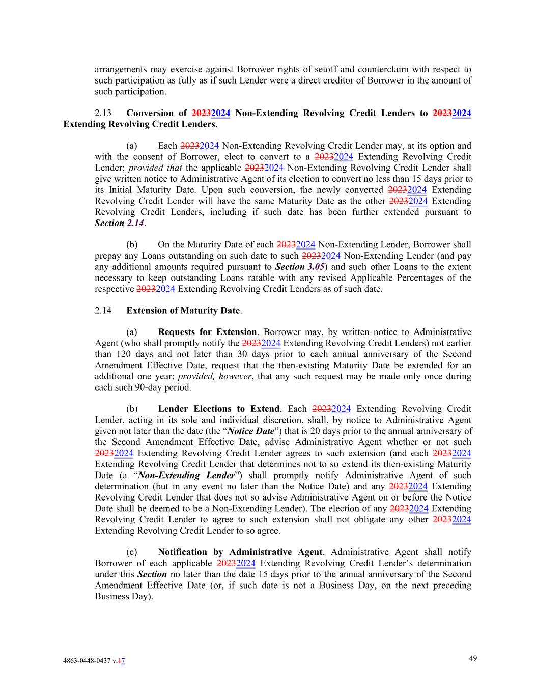 4863-0448-0437 v.17 49 arrangements may exercise against Borrower rights of setoff and counterclaim with respect to such participation as fully as if such Lender were a direct creditor of Borrower in the amount of such participation. 2.13 Conversion of 20232024 Non-Extending Revolving Credit Lenders to 20232024 Extending Revolving Credit Lenders. (a) Each 20232024 Non-Extending Revolving Credit Lender may, at its option and with the consent of Borrower, elect to convert to a 20232024 Extending Revolving Credit Lender; provided that the applicable 20232024 Non-Extending Revolving Credit Lender shall give written notice to Administrative Agent of its election to convert no less than 15 days prior to its Initial Maturity Date. Upon such conversion, the newly converted 20232024 Extending Revolving Credit Lender will have the same Maturity Date as the other 20232024 Extending Revolving Credit Lenders, including if such date has been further extended pursuant to Section 2.14. (b) On the Maturity Date of each 20232024 Non-Extending Lender, Borrower shall prepay any Loans outstanding on such date to such 20232024 Non-Extending Lender (and pay any additional amounts required pursuant to Section 3.05) and such other Loans to the extent necessary to keep outstanding Loans ratable with any revised Applicable Percentages of the respective 20232024 Extending Revolving Credit Lenders as of such date. 2.14 Extension of Maturity Date. (a) Requests for Extension. Borrower may, by written notice to Administrative Agent (who shall promptly notify the 20232024 Extending Revolving Credit Lenders) not earlier than 120 days and not later than 30 days prior to each annual anniversary of the Second Amendment Effective Date, request that the then-existing Maturity Date be extended for an additional one year; provided, however, that any such request may be made only once during each such 90-day period. (b) Lender Elections to Extend. Each 20232024 Extending Revolving Credit Lender, acting in its sole and individual discretion, shall, by notice to Administrative Agent given not later than the date (the “Notice Date”) that is 20 days prior to the annual anniversary of the Second Amendment Effective Date, advise Administrative Agent whether or not such 20232024 Extending Revolving Credit Lender agrees to such extension (and each 20232024 Extending Revolving Credit Lender that determines not to so extend its then-existing Maturity Date (a “Non-Extending Lender”) shall promptly notify Administrative Agent of such determination (but in any event no later than the Notice Date) and any 20232024 Extending Revolving Credit Lender that does not so advise Administrative Agent on or before the Notice Date shall be deemed to be a Non-Extending Lender). The election of any 20232024 Extending Revolving Credit Lender to agree to such extension shall not obligate any other 20232024 Extending Revolving Credit Lender to so agree. (c) Notification by Administrative Agent. Administrative Agent shall notify Borrower of each applicable 20232024 Extending Revolving Credit Lender’s determination under this Section no later than the date 15 days prior to the annual anniversary of the Second Amendment Effective Date (or, if such date is not a Business Day, on the next preceding Business Day).