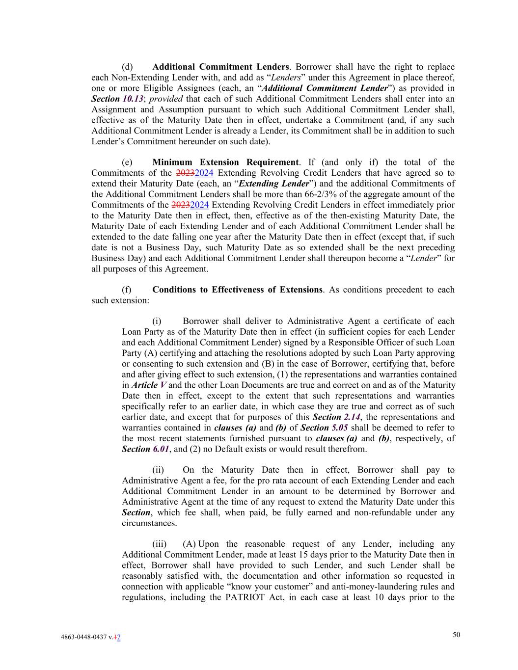 4863-0448-0437 v.17 50 (d) Additional Commitment Lenders. Borrower shall have the right to replace each Non-Extending Lender with, and add as “Lenders” under this Agreement in place thereof, one or more Eligible Assignees (each, an “Additional Commitment Lender”) as provided in Section 10.13; provided that each of such Additional Commitment Lenders shall enter into an Assignment and Assumption pursuant to which such Additional Commitment Lender shall, effective as of the Maturity Date then in effect, undertake a Commitment (and, if any such Additional Commitment Lender is already a Lender, its Commitment shall be in addition to such Lender’s Commitment hereunder on such date). (e) Minimum Extension Requirement. If (and only if) the total of the Commitments of the 20232024 Extending Revolving Credit Lenders that have agreed so to extend their Maturity Date (each, an “Extending Lender”) and the additional Commitments of the Additional Commitment Lenders shall be more than 66-2/3% of the aggregate amount of the Commitments of the 20232024 Extending Revolving Credit Lenders in effect immediately prior to the Maturity Date then in effect, then, effective as of the then-existing Maturity Date, the Maturity Date of each Extending Lender and of each Additional Commitment Lender shall be extended to the date falling one year after the Maturity Date then in effect (except that, if such date is not a Business Day, such Maturity Date as so extended shall be the next preceding Business Day) and each Additional Commitment Lender shall thereupon become a “Lender” for all purposes of this Agreement. (f) Conditions to Effectiveness of Extensions. As conditions precedent to each such extension: (i) Borrower shall deliver to Administrative Agent a certificate of each Loan Party as of the Maturity Date then in effect (in sufficient copies for each Lender and each Additional Commitment Lender) signed by a Responsible Officer of such Loan Party (A) certifying and attaching the resolutions adopted by such Loan Party approving or consenting to such extension and (B) in the case of Borrower, certifying that, before and after giving effect to such extension, (1) the representations and warranties contained in Article V and the other Loan Documents are true and correct on and as of the Maturity Date then in effect, except to the extent that such representations and warranties specifically refer to an earlier date, in which case they are true and correct as of such earlier date, and except that for purposes of this Section 2.14, the representations and warranties contained in clauses (a) and (b) of Section 5.05 shall be deemed to refer to the most recent statements furnished pursuant to clauses (a) and (b), respectively, of Section 6.01, and (2) no Default exists or would result therefrom. (ii) On the Maturity Date then in effect, Borrower shall pay to Administrative Agent a fee, for the pro rata account of each Extending Lender and each Additional Commitment Lender in an amount to be determined by Borrower and Administrative Agent at the time of any request to extend the Maturity Date under this Section, which fee shall, when paid, be fully earned and non-refundable under any circumstances. (iii) (A) Upon the reasonable request of any Lender, including any Additional Commitment Lender, made at least 15 days prior to the Maturity Date then in effect, Borrower shall have provided to such Lender, and such Lender shall be reasonably satisfied with, the documentation and other information so requested in connection with applicable “know your customer” and anti-money-laundering rules and regulations, including the PATRIOT Act, in each case at least 10 days prior to the