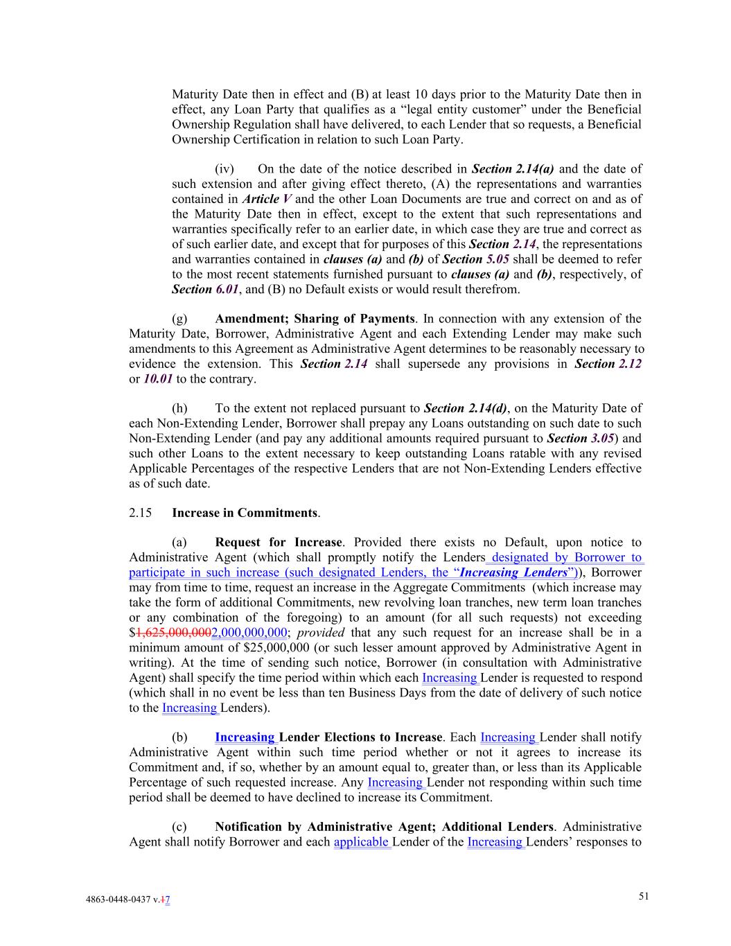 4863-0448-0437 v.17 51 Maturity Date then in effect and (B) at least 10 days prior to the Maturity Date then in effect, any Loan Party that qualifies as a “legal entity customer” under the Beneficial Ownership Regulation shall have delivered, to each Lender that so requests, a Beneficial Ownership Certification in relation to such Loan Party. (iv) On the date of the notice described in Section 2.14(a) and the date of such extension and after giving effect thereto, (A) the representations and warranties contained in Article V and the other Loan Documents are true and correct on and as of the Maturity Date then in effect, except to the extent that such representations and warranties specifically refer to an earlier date, in which case they are true and correct as of such earlier date, and except that for purposes of this Section 2.14, the representations and warranties contained in clauses (a) and (b) of Section 5.05 shall be deemed to refer to the most recent statements furnished pursuant to clauses (a) and (b), respectively, of Section 6.01, and (B) no Default exists or would result therefrom. (g) Amendment; Sharing of Payments. In connection with any extension of the Maturity Date, Borrower, Administrative Agent and each Extending Lender may make such amendments to this Agreement as Administrative Agent determines to be reasonably necessary to evidence the extension. This Section 2.14 shall supersede any provisions in Section 2.12 or 10.01 to the contrary. (h) To the extent not replaced pursuant to Section 2.14(d), on the Maturity Date of each Non-Extending Lender, Borrower shall prepay any Loans outstanding on such date to such Non-Extending Lender (and pay any additional amounts required pursuant to Section 3.05) and such other Loans to the extent necessary to keep outstanding Loans ratable with any revised Applicable Percentages of the respective Lenders that are not Non-Extending Lenders effective as of such date. 2.15 Increase in Commitments. (a) Request for Increase. Provided there exists no Default, upon notice to Administrative Agent (which shall promptly notify the Lenders designated by Borrower to participate in such increase (such designated Lenders, the “Increasing Lenders”)), Borrower may from time to time, request an increase in the Aggregate Commitments (which increase may take the form of additional Commitments, new revolving loan tranches, new term loan tranches or any combination of the foregoing) to an amount (for all such requests) not exceeding $1,625,000,0002,000,000,000; provided that any such request for an increase shall be in a minimum amount of $25,000,000 (or such lesser amount approved by Administrative Agent in writing). At the time of sending such notice, Borrower (in consultation with Administrative Agent) shall specify the time period within which each Increasing Lender is requested to respond (which shall in no event be less than ten Business Days from the date of delivery of such notice to the Increasing Lenders). (b) Increasing Lender Elections to Increase. Each Increasing Lender shall notify Administrative Agent within such time period whether or not it agrees to increase its Commitment and, if so, whether by an amount equal to, greater than, or less than its Applicable Percentage of such requested increase. Any Increasing Lender not responding within such time period shall be deemed to have declined to increase its Commitment. (c) Notification by Administrative Agent; Additional Lenders. Administrative Agent shall notify Borrower and each applicable Lender of the Increasing Lenders’ responses to