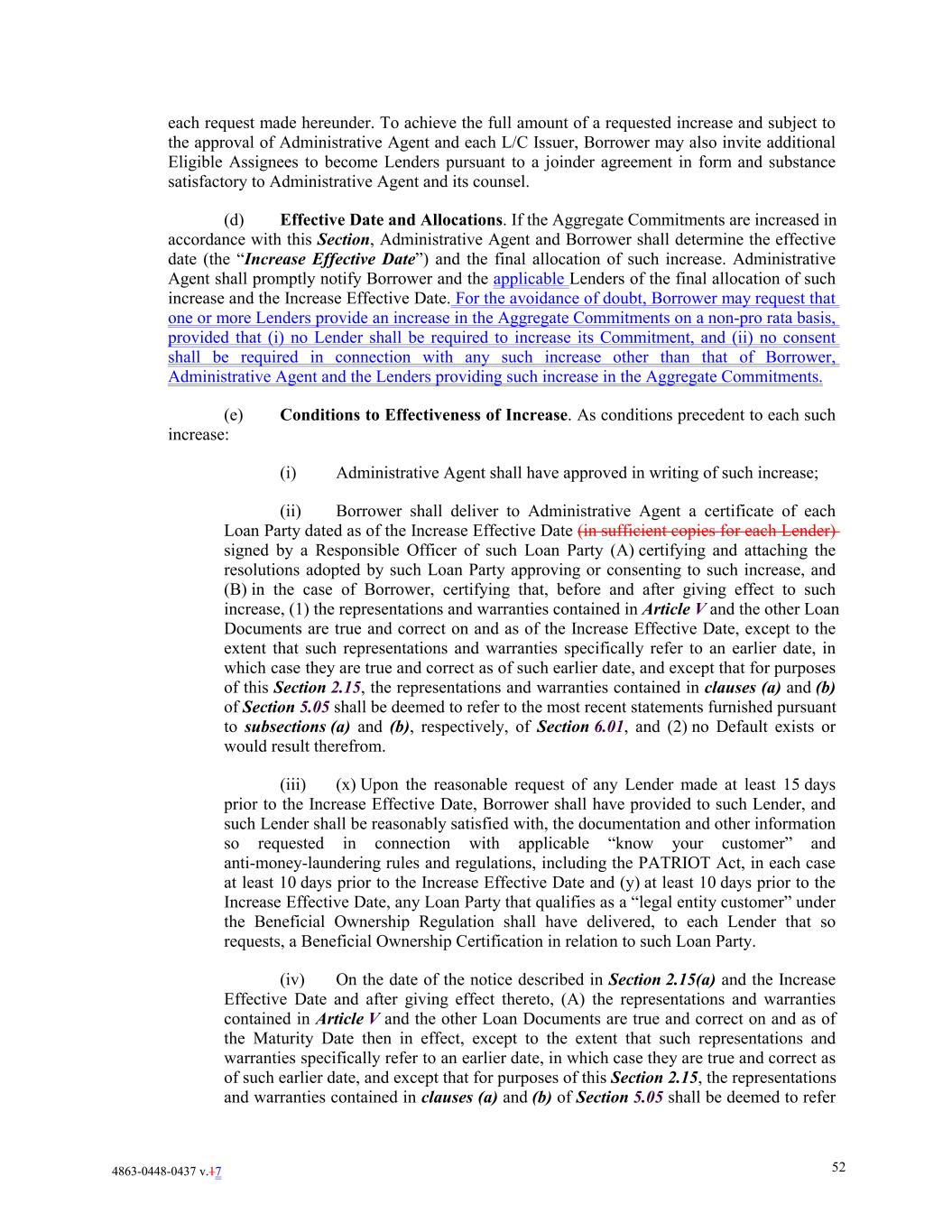 4863-0448-0437 v.17 52 each request made hereunder. To achieve the full amount of a requested increase and subject to the approval of Administrative Agent and each L/C Issuer, Borrower may also invite additional Eligible Assignees to become Lenders pursuant to a joinder agreement in form and substance satisfactory to Administrative Agent and its counsel. (d) Effective Date and Allocations. If the Aggregate Commitments are increased in accordance with this Section, Administrative Agent and Borrower shall determine the effective date (the “Increase Effective Date”) and the final allocation of such increase. Administrative Agent shall promptly notify Borrower and the applicable Lenders of the final allocation of such increase and the Increase Effective Date. For the avoidance of doubt, Borrower may request that one or more Lenders provide an increase in the Aggregate Commitments on a non-pro rata basis, provided that (i) no Lender shall be required to increase its Commitment, and (ii) no consent shall be required in connection with any such increase other than that of Borrower, Administrative Agent and the Lenders providing such increase in the Aggregate Commitments. (e) Conditions to Effectiveness of Increase. As conditions precedent to each such increase: (i) Administrative Agent shall have approved in writing of such increase; (ii) Borrower shall deliver to Administrative Agent a certificate of each Loan Party dated as of the Increase Effective Date (in sufficient copies for each Lender) signed by a Responsible Officer of such Loan Party (A) certifying and attaching the resolutions adopted by such Loan Party approving or consenting to such increase, and (B) in the case of Borrower, certifying that, before and after giving effect to such increase, (1) the representations and warranties contained in Article V and the other Loan Documents are true and correct on and as of the Increase Effective Date, except to the extent that such representations and warranties specifically refer to an earlier date, in which case they are true and correct as of such earlier date, and except that for purposes of this Section 2.15, the representations and warranties contained in clauses (a) and (b) of Section 5.05 shall be deemed to refer to the most recent statements furnished pursuant to subsections (a) and (b), respectively, of Section 6.01, and (2) no Default exists or would result therefrom. (iii) (x) Upon the reasonable request of any Lender made at least 15 days prior to the Increase Effective Date, Borrower shall have provided to such Lender, and such Lender shall be reasonably satisfied with, the documentation and other information so requested in connection with applicable “know your customer” and anti-money-laundering rules and regulations, including the PATRIOT Act, in each case at least 10 days prior to the Increase Effective Date and (y) at least 10 days prior to the Increase Effective Date, any Loan Party that qualifies as a “legal entity customer” under the Beneficial Ownership Regulation shall have delivered, to each Lender that so requests, a Beneficial Ownership Certification in relation to such Loan Party. (iv) On the date of the notice described in Section 2.15(a) and the Increase Effective Date and after giving effect thereto, (A) the representations and warranties contained in Article V and the other Loan Documents are true and correct on and as of the Maturity Date then in effect, except to the extent that such representations and warranties specifically refer to an earlier date, in which case they are true and correct as of such earlier date, and except that for purposes of this Section 2.15, the representations and warranties contained in clauses (a) and (b) of Section 5.05 shall be deemed to refer