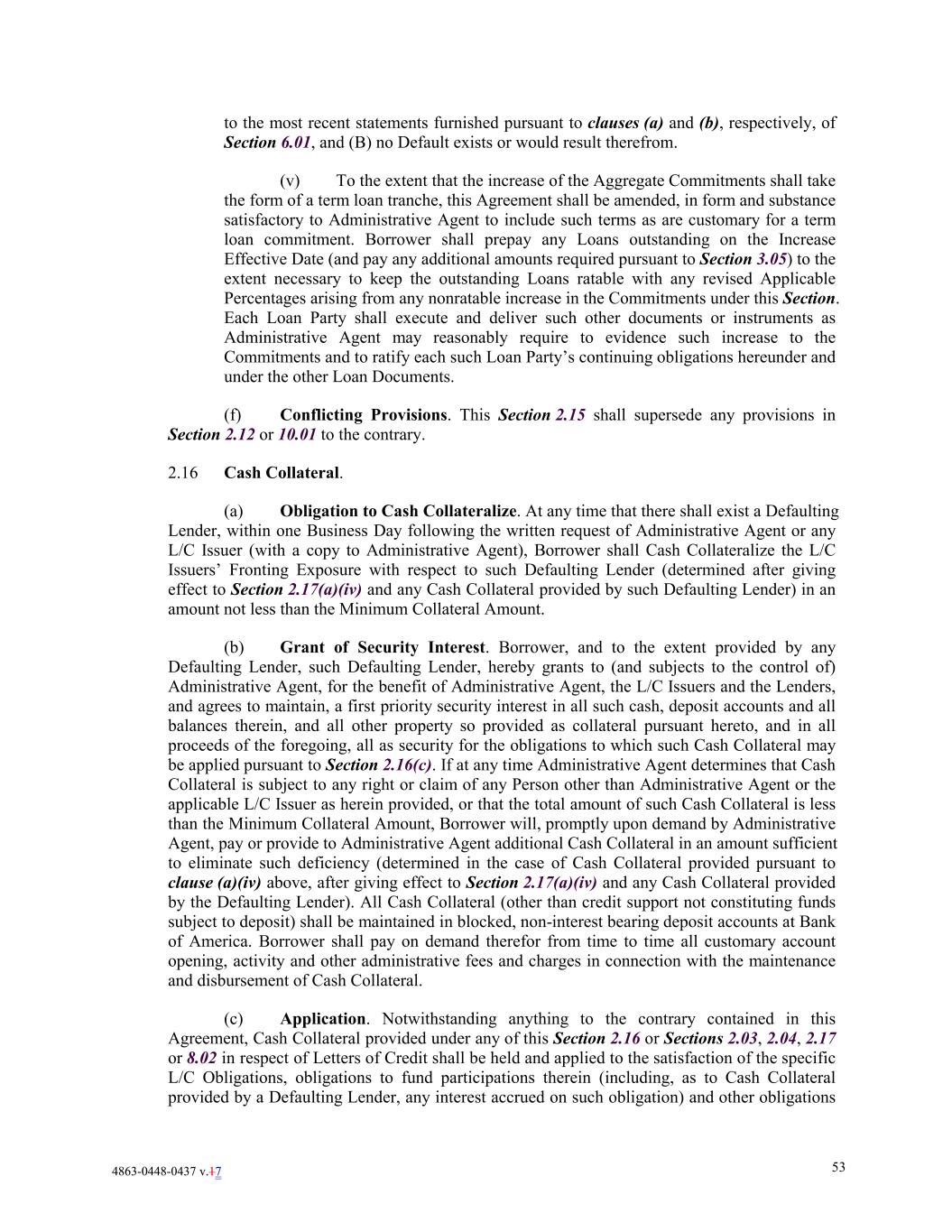 4863-0448-0437 v.17 53 to the most recent statements furnished pursuant to clauses (a) and (b), respectively, of Section 6.01, and (B) no Default exists or would result therefrom. (v) To the extent that the increase of the Aggregate Commitments shall take the form of a term loan tranche, this Agreement shall be amended, in form and substance satisfactory to Administrative Agent to include such terms as are customary for a term loan commitment. Borrower shall prepay any Loans outstanding on the Increase Effective Date (and pay any additional amounts required pursuant to Section 3.05) to the extent necessary to keep the outstanding Loans ratable with any revised Applicable Percentages arising from any nonratable increase in the Commitments under this Section. Each Loan Party shall execute and deliver such other documents or instruments as Administrative Agent may reasonably require to evidence such increase to the Commitments and to ratify each such Loan Party’s continuing obligations hereunder and under the other Loan Documents. (f) Conflicting Provisions. This Section 2.15 shall supersede any provisions in Section 2.12 or 10.01 to the contrary. 2.16 Cash Collateral. (a) Obligation to Cash Collateralize. At any time that there shall exist a Defaulting Lender, within one Business Day following the written request of Administrative Agent or any L/C Issuer (with a copy to Administrative Agent), Borrower shall Cash Collateralize the L/C Issuers’ Fronting Exposure with respect to such Defaulting Lender (determined after giving effect to Section 2.17(a)(iv) and any Cash Collateral provided by such Defaulting Lender) in an amount not less than the Minimum Collateral Amount. (b) Grant of Security Interest. Borrower, and to the extent provided by any Defaulting Lender, such Defaulting Lender, hereby grants to (and subjects to the control of) Administrative Agent, for the benefit of Administrative Agent, the L/C Issuers and the Lenders, and agrees to maintain, a first priority security interest in all such cash, deposit accounts and all balances therein, and all other property so provided as collateral pursuant hereto, and in all proceeds of the foregoing, all as security for the obligations to which such Cash Collateral may be applied pursuant to Section 2.16(c). If at any time Administrative Agent determines that Cash Collateral is subject to any right or claim of any Person other than Administrative Agent or the applicable L/C Issuer as herein provided, or that the total amount of such Cash Collateral is less than the Minimum Collateral Amount, Borrower will, promptly upon demand by Administrative Agent, pay or provide to Administrative Agent additional Cash Collateral in an amount sufficient to eliminate such deficiency (determined in the case of Cash Collateral provided pursuant to clause (a)(iv) above, after giving effect to Section 2.17(a)(iv) and any Cash Collateral provided by the Defaulting Lender). All Cash Collateral (other than credit support not constituting funds subject to deposit) shall be maintained in blocked, non-interest bearing deposit accounts at Bank of America. Borrower shall pay on demand therefor from time to time all customary account opening, activity and other administrative fees and charges in connection with the maintenance and disbursement of Cash Collateral. (c) Application. Notwithstanding anything to the contrary contained in this Agreement, Cash Collateral provided under any of this Section 2.16 or Sections 2.03, 2.04, 2.17 or 8.02 in respect of Letters of Credit shall be held and applied to the satisfaction of the specific L/C Obligations, obligations to fund participations therein (including, as to Cash Collateral provided by a Defaulting Lender, any interest accrued on such obligation) and other obligations