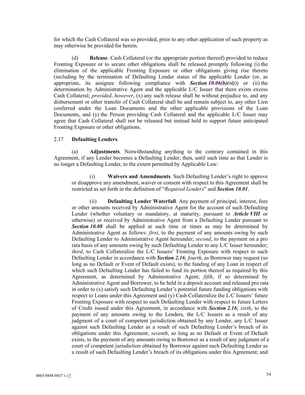 4863-0448-0437 v.17 54 for which the Cash Collateral was so provided, prior to any other application of such property as may otherwise be provided for herein. (d) Release. Cash Collateral (or the appropriate portion thereof) provided to reduce Fronting Exposure or to secure other obligations shall be released promptly following (i) the elimination of the applicable Fronting Exposure or other obligations giving rise thereto (including by the termination of Defaulting Lender status of the applicable Lender (or, as appropriate, its assignee following compliance with Section 10.06(b)(vi))) or (ii) the determination by Administrative Agent and the applicable L/C Issuer that there exists excess Cash Collateral; provided, however, (x) any such release shall be without prejudice to, and any disbursement or other transfer of Cash Collateral shall be and remain subject to, any other Lien conferred under the Loan Documents and the other applicable provisions of the Loan Documents, and (y) the Person providing Cash Collateral and the applicable L/C Issuer may agree that Cash Collateral shall not be released but instead held to support future anticipated Fronting Exposure or other obligations. 2.17 Defaulting Lenders. (a) Adjustments. Notwithstanding anything to the contrary contained in this Agreement, if any Lender becomes a Defaulting Lender, then, until such time as that Lender is no longer a Defaulting Lender, to the extent permitted by Applicable Law: (i) Waivers and Amendments. Such Defaulting Lender’s right to approve or disapprove any amendment, waiver or consent with respect to this Agreement shall be restricted as set forth in the definition of “Required Lenders” and Section 10.01. (ii) Defaulting Lender Waterfall. Any payment of principal, interest, fees or other amounts received by Administrative Agent for the account of such Defaulting Lender (whether voluntary or mandatory, at maturity, pursuant to Article VIII or otherwise) or received by Administrative Agent from a Defaulting Lender pursuant to Section 10.08 shall be applied at such time or times as may be determined by Administrative Agent as follows: first, to the payment of any amounts owing by such Defaulting Lender to Administrative Agent hereunder; second, to the payment on a pro rata basis of any amounts owing by such Defaulting Lender to any L/C Issuer hereunder; third, to Cash Collateralize the L/C Issuers’ Fronting Exposure with respect to such Defaulting Lender in accordance with Section 2.16; fourth, as Borrower may request (so long as no Default or Event of Default exists), to the funding of any Loan in respect of which such Defaulting Lender has failed to fund its portion thereof as required by this Agreement, as determined by Administrative Agent; fifth, if so determined by Administrative Agent and Borrower, to be held in a deposit account and released pro rata in order to (x) satisfy such Defaulting Lender’s potential future funding obligations with respect to Loans under this Agreement and (y) Cash Collateralize the L/C Issuers’ future Fronting Exposure with respect to such Defaulting Lender with respect to future Letters of Credit issued under this Agreement, in accordance with Section 2.16; sixth, to the payment of any amounts owing to the Lenders, the L/C Issuers as a result of any judgment of a court of competent jurisdiction obtained by any Lender, any L/C Issuer against such Defaulting Lender as a result of such Defaulting Lender’s breach of its obligations under this Agreement; seventh, so long as no Default or Event of Default exists, to the payment of any amounts owing to Borrower as a result of any judgment of a court of competent jurisdiction obtained by Borrower against such Defaulting Lender as a result of such Defaulting Lender’s breach of its obligations under this Agreement; and