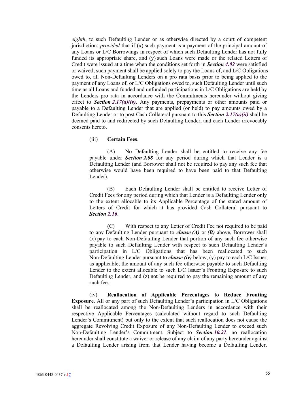 4863-0448-0437 v.17 55 eighth, to such Defaulting Lender or as otherwise directed by a court of competent jurisdiction; provided that if (x) such payment is a payment of the principal amount of any Loans or L/C Borrowings in respect of which such Defaulting Lender has not fully funded its appropriate share, and (y) such Loans were made or the related Letters of Credit were issued at a time when the conditions set forth in Section 4.02 were satisfied or waived, such payment shall be applied solely to pay the Loans of, and L/C Obligations owed to, all Non-Defaulting Lenders on a pro rata basis prior to being applied to the payment of any Loans of, or L/C Obligations owed to, such Defaulting Lender until such time as all Loans and funded and unfunded participations in L/C Obligations are held by the Lenders pro rata in accordance with the Commitments hereunder without giving effect to Section 2.17(a)(iv). Any payments, prepayments or other amounts paid or payable to a Defaulting Lender that are applied (or held) to pay amounts owed by a Defaulting Lender or to post Cash Collateral pursuant to this Section 2.17(a)(ii) shall be deemed paid to and redirected by such Defaulting Lender, and each Lender irrevocably consents hereto. (iii) Certain Fees. (A) No Defaulting Lender shall be entitled to receive any fee payable under Section 2.08 for any period during which that Lender is a Defaulting Lender (and Borrower shall not be required to pay any such fee that otherwise would have been required to have been paid to that Defaulting Lender). (B) Each Defaulting Lender shall be entitled to receive Letter of Credit Fees for any period during which that Lender is a Defaulting Lender only to the extent allocable to its Applicable Percentage of the stated amount of Letters of Credit for which it has provided Cash Collateral pursuant to Section 2.16. (C) With respect to any Letter of Credit Fee not required to be paid to any Defaulting Lender pursuant to clause (A) or (B) above, Borrower shall (x) pay to each Non-Defaulting Lender that portion of any such fee otherwise payable to such Defaulting Lender with respect to such Defaulting Lender’s participation in L/C Obligations that has been reallocated to such Non-Defaulting Lender pursuant to clause (iv) below, (y) pay to each L/C Issuer, as applicable, the amount of any such fee otherwise payable to such Defaulting Lender to the extent allocable to such L/C Issuer’s Fronting Exposure to such Defaulting Lender, and (z) not be required to pay the remaining amount of any such fee. (iv) Reallocation of Applicable Percentages to Reduce Fronting Exposure. All or any part of such Defaulting Lender’s participation in L/C Obligations shall be reallocated among the Non-Defaulting Lenders in accordance with their respective Applicable Percentages (calculated without regard to such Defaulting Lender’s Commitment) but only to the extent that such reallocation does not cause the aggregate Revolving Credit Exposure of any Non-Defaulting Lender to exceed such Non-Defaulting Lender’s Commitment. Subject to Section 10.21, no reallocation hereunder shall constitute a waiver or release of any claim of any party hereunder against a Defaulting Lender arising from that Lender having become a Defaulting Lender,