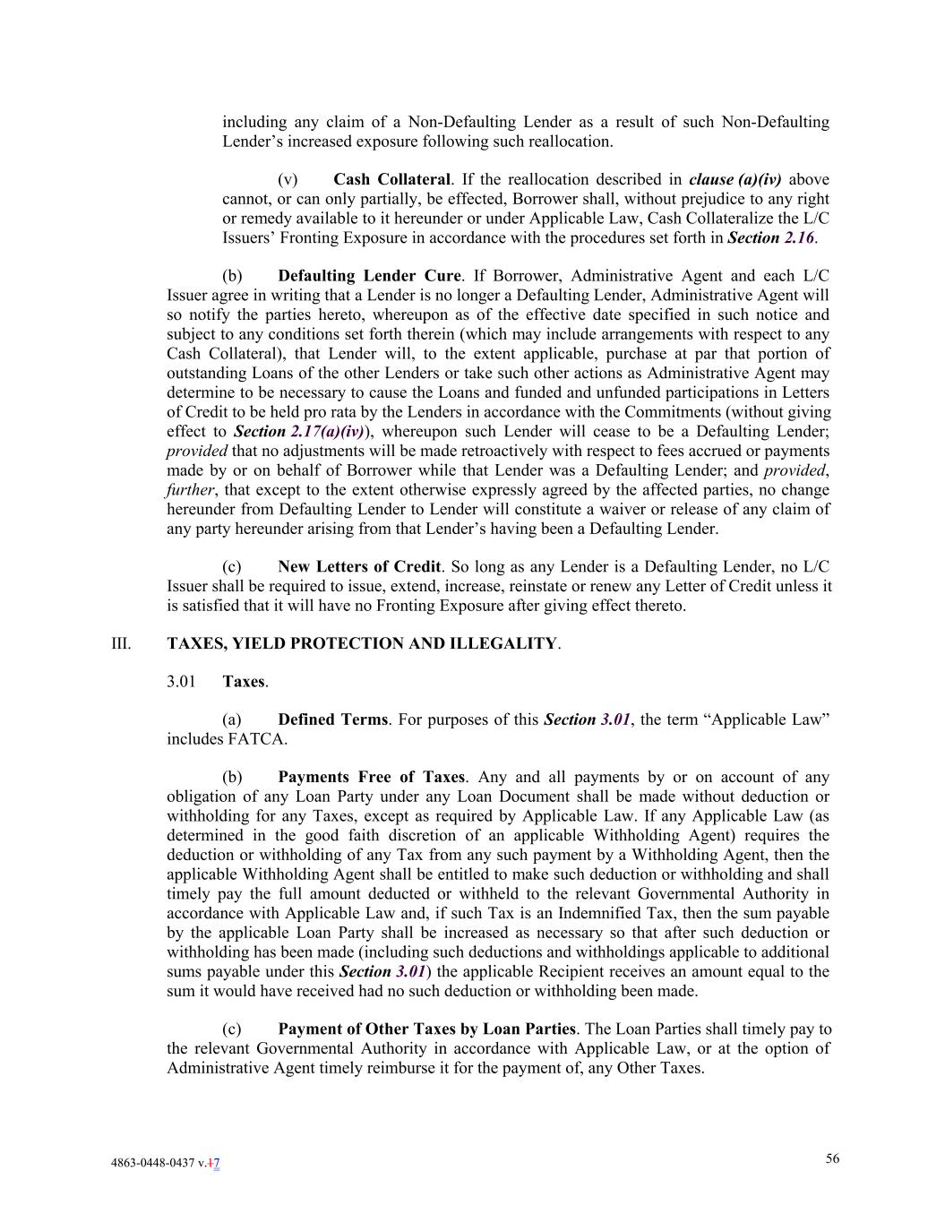 4863-0448-0437 v.17 56 including any claim of a Non-Defaulting Lender as a result of such Non-Defaulting Lender’s increased exposure following such reallocation. (v) Cash Collateral. If the reallocation described in clause (a)(iv) above cannot, or can only partially, be effected, Borrower shall, without prejudice to any right or remedy available to it hereunder or under Applicable Law, Cash Collateralize the L/C Issuers’ Fronting Exposure in accordance with the procedures set forth in Section 2.16. (b) Defaulting Lender Cure. If Borrower, Administrative Agent and each L/C Issuer agree in writing that a Lender is no longer a Defaulting Lender, Administrative Agent will so notify the parties hereto, whereupon as of the effective date specified in such notice and subject to any conditions set forth therein (which may include arrangements with respect to any Cash Collateral), that Lender will, to the extent applicable, purchase at par that portion of outstanding Loans of the other Lenders or take such other actions as Administrative Agent may determine to be necessary to cause the Loans and funded and unfunded participations in Letters of Credit to be held pro rata by the Lenders in accordance with the Commitments (without giving effect to Section 2.17(a)(iv)), whereupon such Lender will cease to be a Defaulting Lender; provided that no adjustments will be made retroactively with respect to fees accrued or payments made by or on behalf of Borrower while that Lender was a Defaulting Lender; and provided, further, that except to the extent otherwise expressly agreed by the affected parties, no change hereunder from Defaulting Lender to Lender will constitute a waiver or release of any claim of any party hereunder arising from that Lender’s having been a Defaulting Lender. (c) New Letters of Credit. So long as any Lender is a Defaulting Lender, no L/C Issuer shall be required to issue, extend, increase, reinstate or renew any Letter of Credit unless it is satisfied that it will have no Fronting Exposure after giving effect thereto. III. TAXES, YIELD PROTECTION AND ILLEGALITY. 3.01 Taxes. (a) Defined Terms. For purposes of this Section 3.01, the term “Applicable Law” includes FATCA. (b) Payments Free of Taxes. Any and all payments by or on account of any obligation of any Loan Party under any Loan Document shall be made without deduction or withholding for any Taxes, except as required by Applicable Law. If any Applicable Law (as determined in the good faith discretion of an applicable Withholding Agent) requires the deduction or withholding of any Tax from any such payment by a Withholding Agent, then the applicable Withholding Agent shall be entitled to make such deduction or withholding and shall timely pay the full amount deducted or withheld to the relevant Governmental Authority in accordance with Applicable Law and, if such Tax is an Indemnified Tax, then the sum payable by the applicable Loan Party shall be increased as necessary so that after such deduction or withholding has been made (including such deductions and withholdings applicable to additional sums payable under this Section 3.01) the applicable Recipient receives an amount equal to the sum it would have received had no such deduction or withholding been made. (c) Payment of Other Taxes by Loan Parties. The Loan Parties shall timely pay to the relevant Governmental Authority in accordance with Applicable Law, or at the option of Administrative Agent timely reimburse it for the payment of, any Other Taxes.