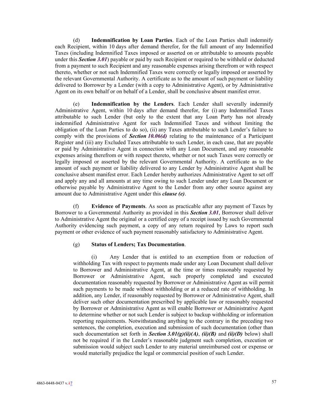 4863-0448-0437 v.17 57 (d) Indemnification by Loan Parties. Each of the Loan Parties shall indemnify each Recipient, within 10 days after demand therefor, for the full amount of any Indemnified Taxes (including Indemnified Taxes imposed or asserted on or attributable to amounts payable under this Section 3.01) payable or paid by such Recipient or required to be withheld or deducted from a payment to such Recipient and any reasonable expenses arising therefrom or with respect thereto, whether or not such Indemnified Taxes were correctly or legally imposed or asserted by the relevant Governmental Authority. A certificate as to the amount of such payment or liability delivered to Borrower by a Lender (with a copy to Administrative Agent), or by Administrative Agent on its own behalf or on behalf of a Lender, shall be conclusive absent manifest error. (e) Indemnification by the Lenders. Each Lender shall severally indemnify Administrative Agent, within 10 days after demand therefor, for (i) any Indemnified Taxes attributable to such Lender (but only to the extent that any Loan Party has not already indemnified Administrative Agent for such Indemnified Taxes and without limiting the obligation of the Loan Parties to do so), (ii) any Taxes attributable to such Lender’s failure to comply with the provisions of Section 10.06(d) relating to the maintenance of a Participant Register and (iii) any Excluded Taxes attributable to such Lender, in each case, that are payable or paid by Administrative Agent in connection with any Loan Document, and any reasonable expenses arising therefrom or with respect thereto, whether or not such Taxes were correctly or legally imposed or asserted by the relevant Governmental Authority. A certificate as to the amount of such payment or liability delivered to any Lender by Administrative Agent shall be conclusive absent manifest error. Each Lender hereby authorizes Administrative Agent to set off and apply any and all amounts at any time owing to such Lender under any Loan Document or otherwise payable by Administrative Agent to the Lender from any other source against any amount due to Administrative Agent under this clause (e). (f) Evidence of Payments. As soon as practicable after any payment of Taxes by Borrower to a Governmental Authority as provided in this Section 3.01, Borrower shall deliver to Administrative Agent the original or a certified copy of a receipt issued by such Governmental Authority evidencing such payment, a copy of any return required by Laws to report such payment or other evidence of such payment reasonably satisfactory to Administrative Agent. (g) Status of Lenders; Tax Documentation. (i) Any Lender that is entitled to an exemption from or reduction of withholding Tax with respect to payments made under any Loan Document shall deliver to Borrower and Administrative Agent, at the time or times reasonably requested by Borrower or Administrative Agent, such properly completed and executed documentation reasonably requested by Borrower or Administrative Agent as will permit such payments to be made without withholding or at a reduced rate of withholding. In addition, any Lender, if reasonably requested by Borrower or Administrative Agent, shall deliver such other documentation prescribed by applicable law or reasonably requested by Borrower or Administrative Agent as will enable Borrower or Administrative Agent to determine whether or not such Lender is subject to backup withholding or information reporting requirements. Notwithstanding anything to the contrary in the preceding two sentences, the completion, execution and submission of such documentation (other than such documentation set forth in Section 3.01(g)(ii)(A), (ii)(B) and (ii)(D) below) shall not be required if in the Lender’s reasonable judgment such completion, execution or submission would subject such Lender to any material unreimbursed cost or expense or would materially prejudice the legal or commercial position of such Lender.
