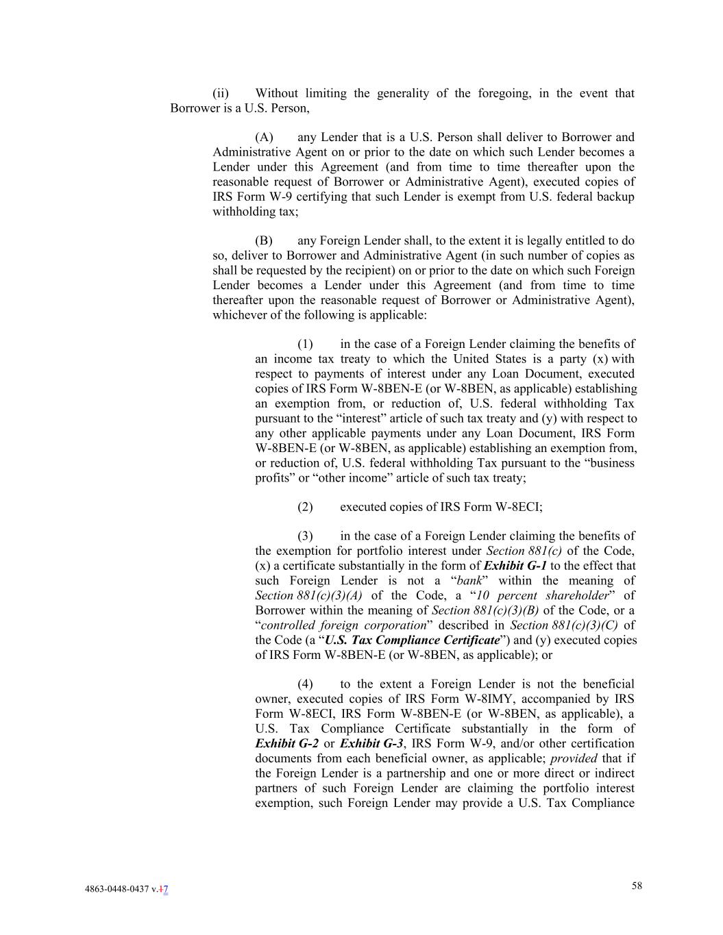 4863-0448-0437 v.17 58 (ii) Without limiting the generality of the foregoing, in the event that Borrower is a U.S. Person, (A) any Lender that is a U.S. Person shall deliver to Borrower and Administrative Agent on or prior to the date on which such Lender becomes a Lender under this Agreement (and from time to time thereafter upon the reasonable request of Borrower or Administrative Agent), executed copies of IRS Form W-9 certifying that such Lender is exempt from U.S. federal backup withholding tax; (B) any Foreign Lender shall, to the extent it is legally entitled to do so, deliver to Borrower and Administrative Agent (in such number of copies as shall be requested by the recipient) on or prior to the date on which such Foreign Lender becomes a Lender under this Agreement (and from time to time thereafter upon the reasonable request of Borrower or Administrative Agent), whichever of the following is applicable: (1) in the case of a Foreign Lender claiming the benefits of an income tax treaty to which the United States is a party (x) with respect to payments of interest under any Loan Document, executed copies of IRS Form W-8BEN-E (or W-8BEN, as applicable) establishing an exemption from, or reduction of, U.S. federal withholding Tax pursuant to the “interest” article of such tax treaty and (y) with respect to any other applicable payments under any Loan Document, IRS Form W-8BEN-E (or W-8BEN, as applicable) establishing an exemption from, or reduction of, U.S. federal withholding Tax pursuant to the “business profits” or “other income” article of such tax treaty; (2) executed copies of IRS Form W-8ECI; (3) in the case of a Foreign Lender claiming the benefits of the exemption for portfolio interest under Section 881(c) of the Code, (x) a certificate substantially in the form of Exhibit G-1 to the effect that such Foreign Lender is not a “bank” within the meaning of Section 881(c)(3)(A) of the Code, a “10 percent shareholder” of Borrower within the meaning of Section 881(c)(3)(B) of the Code, or a “controlled foreign corporation” described in Section 881(c)(3)(C) of the Code (a “U.S. Tax Compliance Certificate”) and (y) executed copies of IRS Form W-8BEN-E (or W-8BEN, as applicable); or (4) to the extent a Foreign Lender is not the beneficial owner, executed copies of IRS Form W-8IMY, accompanied by IRS Form W-8ECI, IRS Form W-8BEN-E (or W-8BEN, as applicable), a U.S. Tax Compliance Certificate substantially in the form of Exhibit G-2 or Exhibit G-3, IRS Form W-9, and/or other certification documents from each beneficial owner, as applicable; provided that if the Foreign Lender is a partnership and one or more direct or indirect partners of such Foreign Lender are claiming the portfolio interest exemption, such Foreign Lender may provide a U.S. Tax Compliance