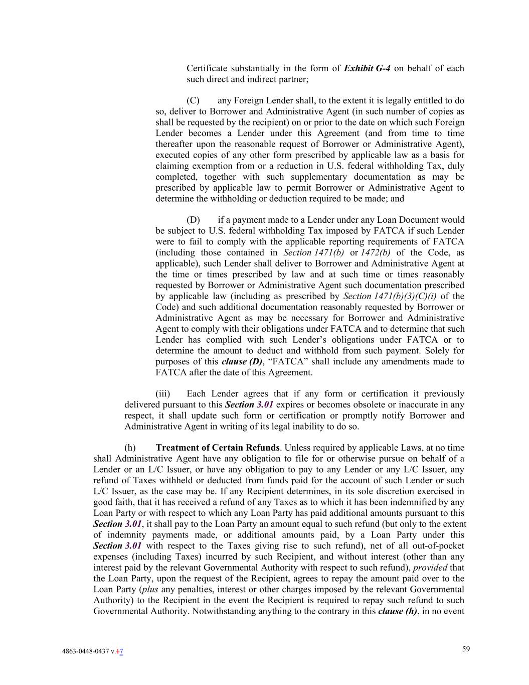 4863-0448-0437 v.17 59 Certificate substantially in the form of Exhibit G-4 on behalf of each such direct and indirect partner; (C) any Foreign Lender shall, to the extent it is legally entitled to do so, deliver to Borrower and Administrative Agent (in such number of copies as shall be requested by the recipient) on or prior to the date on which such Foreign Lender becomes a Lender under this Agreement (and from time to time thereafter upon the reasonable request of Borrower or Administrative Agent), executed copies of any other form prescribed by applicable law as a basis for claiming exemption from or a reduction in U.S. federal withholding Tax, duly completed, together with such supplementary documentation as may be prescribed by applicable law to permit Borrower or Administrative Agent to determine the withholding or deduction required to be made; and (D) if a payment made to a Lender under any Loan Document would be subject to U.S. federal withholding Tax imposed by FATCA if such Lender were to fail to comply with the applicable reporting requirements of FATCA (including those contained in Section 1471(b) or 1472(b) of the Code, as applicable), such Lender shall deliver to Borrower and Administrative Agent at the time or times prescribed by law and at such time or times reasonably requested by Borrower or Administrative Agent such documentation prescribed by applicable law (including as prescribed by Section 1471(b)(3)(C)(i) of the Code) and such additional documentation reasonably requested by Borrower or Administrative Agent as may be necessary for Borrower and Administrative Agent to comply with their obligations under FATCA and to determine that such Lender has complied with such Lender’s obligations under FATCA or to determine the amount to deduct and withhold from such payment. Solely for purposes of this clause (D), “FATCA” shall include any amendments made to FATCA after the date of this Agreement. (iii) Each Lender agrees that if any form or certification it previously delivered pursuant to this Section 3.01 expires or becomes obsolete or inaccurate in any respect, it shall update such form or certification or promptly notify Borrower and Administrative Agent in writing of its legal inability to do so. (h) Treatment of Certain Refunds. Unless required by applicable Laws, at no time shall Administrative Agent have any obligation to file for or otherwise pursue on behalf of a Lender or an L/C Issuer, or have any obligation to pay to any Lender or any L/C Issuer, any refund of Taxes withheld or deducted from funds paid for the account of such Lender or such L/C Issuer, as the case may be. If any Recipient determines, in its sole discretion exercised in good faith, that it has received a refund of any Taxes as to which it has been indemnified by any Loan Party or with respect to which any Loan Party has paid additional amounts pursuant to this Section 3.01, it shall pay to the Loan Party an amount equal to such refund (but only to the extent of indemnity payments made, or additional amounts paid, by a Loan Party under this Section 3.01 with respect to the Taxes giving rise to such refund), net of all out-of-pocket expenses (including Taxes) incurred by such Recipient, and without interest (other than any interest paid by the relevant Governmental Authority with respect to such refund), provided that the Loan Party, upon the request of the Recipient, agrees to repay the amount paid over to the Loan Party (plus any penalties, interest or other charges imposed by the relevant Governmental Authority) to the Recipient in the event the Recipient is required to repay such refund to such Governmental Authority. Notwithstanding anything to the contrary in this clause (h), in no event