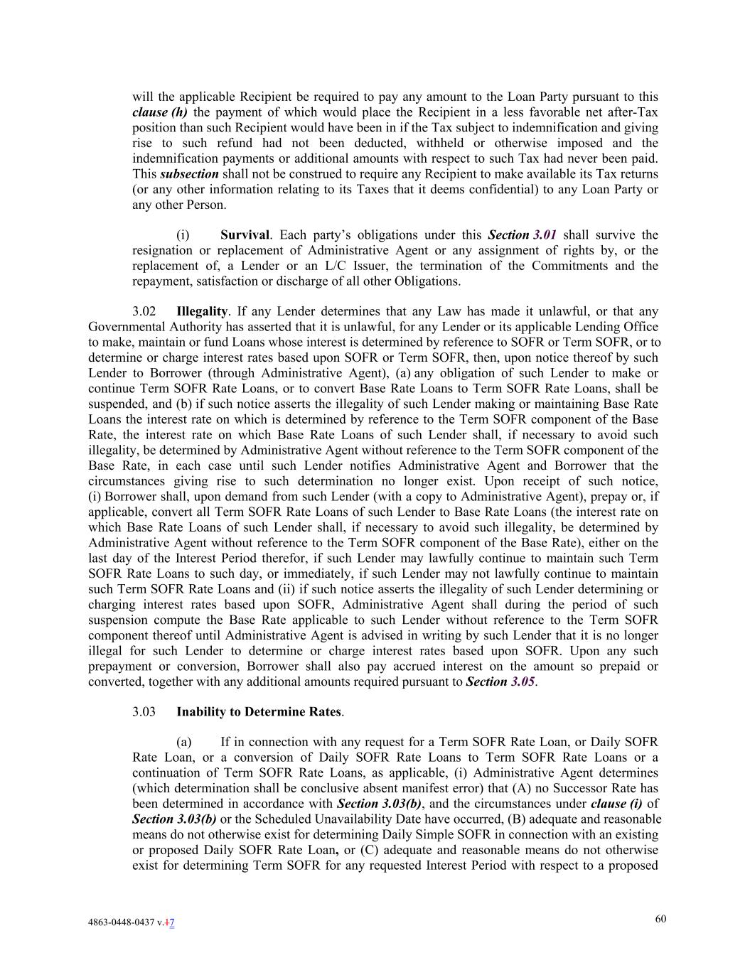4863-0448-0437 v.17 60 will the applicable Recipient be required to pay any amount to the Loan Party pursuant to this clause (h) the payment of which would place the Recipient in a less favorable net after-Tax position than such Recipient would have been in if the Tax subject to indemnification and giving rise to such refund had not been deducted, withheld or otherwise imposed and the indemnification payments or additional amounts with respect to such Tax had never been paid. This subsection shall not be construed to require any Recipient to make available its Tax returns (or any other information relating to its Taxes that it deems confidential) to any Loan Party or any other Person. (i) Survival. Each party’s obligations under this Section 3.01 shall survive the resignation or replacement of Administrative Agent or any assignment of rights by, or the replacement of, a Lender or an L/C Issuer, the termination of the Commitments and the repayment, satisfaction or discharge of all other Obligations. 3.02 Illegality. If any Lender determines that any Law has made it unlawful, or that any Governmental Authority has asserted that it is unlawful, for any Lender or its applicable Lending Office to make, maintain or fund Loans whose interest is determined by reference to SOFR or Term SOFR, or to determine or charge interest rates based upon SOFR or Term SOFR, then, upon notice thereof by such Lender to Borrower (through Administrative Agent), (a) any obligation of such Lender to make or continue Term SOFR Rate Loans, or to convert Base Rate Loans to Term SOFR Rate Loans, shall be suspended, and (b) if such notice asserts the illegality of such Lender making or maintaining Base Rate Loans the interest rate on which is determined by reference to the Term SOFR component of the Base Rate, the interest rate on which Base Rate Loans of such Lender shall, if necessary to avoid such illegality, be determined by Administrative Agent without reference to the Term SOFR component of the Base Rate, in each case until such Lender notifies Administrative Agent and Borrower that the circumstances giving rise to such determination no longer exist. Upon receipt of such notice, (i) Borrower shall, upon demand from such Lender (with a copy to Administrative Agent), prepay or, if applicable, convert all Term SOFR Rate Loans of such Lender to Base Rate Loans (the interest rate on which Base Rate Loans of such Lender shall, if necessary to avoid such illegality, be determined by Administrative Agent without reference to the Term SOFR component of the Base Rate), either on the last day of the Interest Period therefor, if such Lender may lawfully continue to maintain such Term SOFR Rate Loans to such day, or immediately, if such Lender may not lawfully continue to maintain such Term SOFR Rate Loans and (ii) if such notice asserts the illegality of such Lender determining or charging interest rates based upon SOFR, Administrative Agent shall during the period of such suspension compute the Base Rate applicable to such Lender without reference to the Term SOFR component thereof until Administrative Agent is advised in writing by such Lender that it is no longer illegal for such Lender to determine or charge interest rates based upon SOFR. Upon any such prepayment or conversion, Borrower shall also pay accrued interest on the amount so prepaid or converted, together with any additional amounts required pursuant to Section 3.05. 3.03 Inability to Determine Rates. (a) If in connection with any request for a Term SOFR Rate Loan, or Daily SOFR Rate Loan, or a conversion of Daily SOFR Rate Loans to Term SOFR Rate Loans or a continuation of Term SOFR Rate Loans, as applicable, (i) Administrative Agent determines (which determination shall be conclusive absent manifest error) that (A) no Successor Rate has been determined in accordance with Section 3.03(b), and the circumstances under clause (i) of Section 3.03(b) or the Scheduled Unavailability Date have occurred, (B) adequate and reasonable means do not otherwise exist for determining Daily Simple SOFR in connection with an existing or proposed Daily SOFR Rate Loan, or (C) adequate and reasonable means do not otherwise exist for determining Term SOFR for any requested Interest Period with respect to a proposed