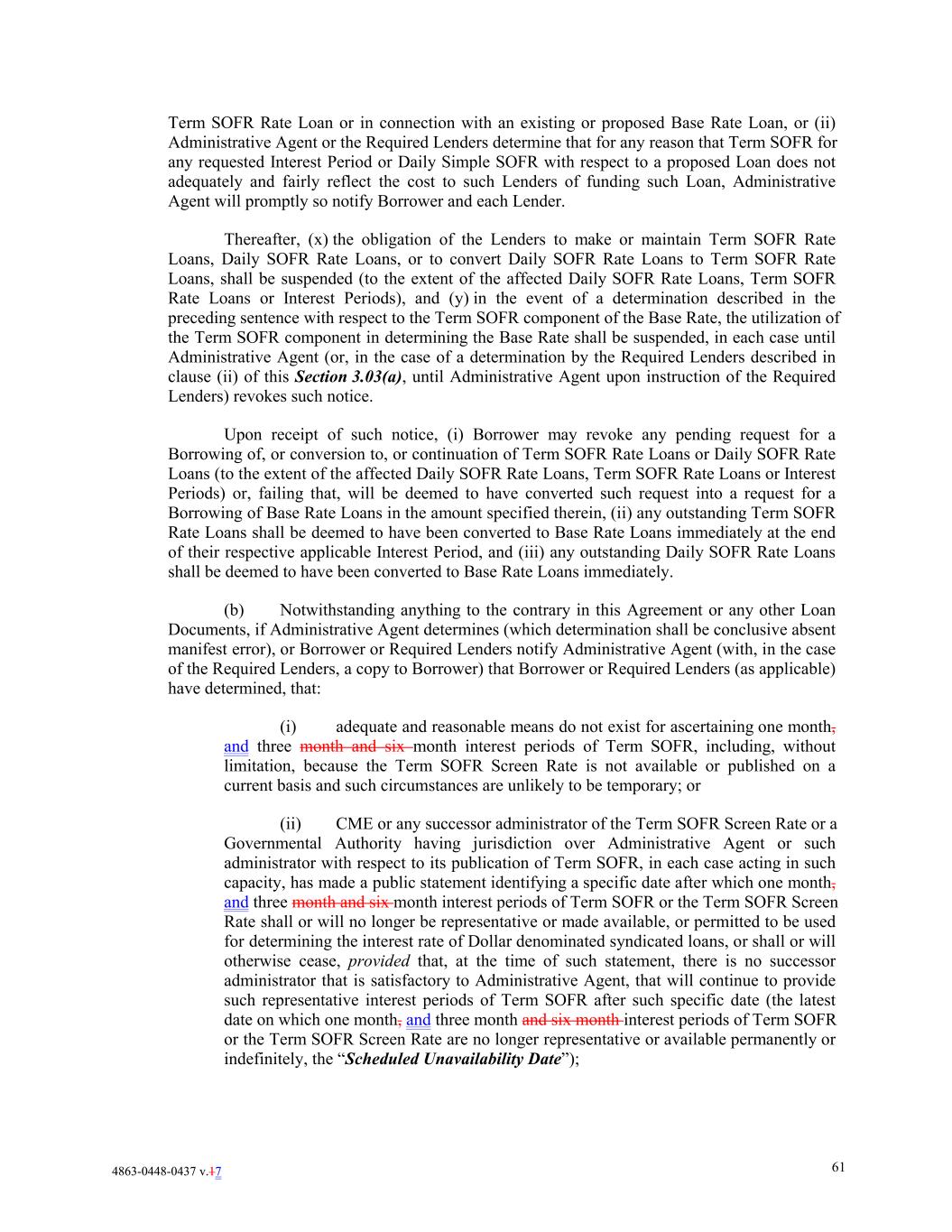4863-0448-0437 v.17 61 Term SOFR Rate Loan or in connection with an existing or proposed Base Rate Loan, or (ii) Administrative Agent or the Required Lenders determine that for any reason that Term SOFR for any requested Interest Period or Daily Simple SOFR with respect to a proposed Loan does not adequately and fairly reflect the cost to such Lenders of funding such Loan, Administrative Agent will promptly so notify Borrower and each Lender. Thereafter, (x) the obligation of the Lenders to make or maintain Term SOFR Rate Loans, Daily SOFR Rate Loans, or to convert Daily SOFR Rate Loans to Term SOFR Rate Loans, shall be suspended (to the extent of the affected Daily SOFR Rate Loans, Term SOFR Rate Loans or Interest Periods), and (y) in the event of a determination described in the preceding sentence with respect to the Term SOFR component of the Base Rate, the utilization of the Term SOFR component in determining the Base Rate shall be suspended, in each case until Administrative Agent (or, in the case of a determination by the Required Lenders described in clause (ii) of this Section 3.03(a), until Administrative Agent upon instruction of the Required Lenders) revokes such notice. Upon receipt of such notice, (i) Borrower may revoke any pending request for a Borrowing of, or conversion to, or continuation of Term SOFR Rate Loans or Daily SOFR Rate Loans (to the extent of the affected Daily SOFR Rate Loans, Term SOFR Rate Loans or Interest Periods) or, failing that, will be deemed to have converted such request into a request for a Borrowing of Base Rate Loans in the amount specified therein, (ii) any outstanding Term SOFR Rate Loans shall be deemed to have been converted to Base Rate Loans immediately at the end of their respective applicable Interest Period, and (iii) any outstanding Daily SOFR Rate Loans shall be deemed to have been converted to Base Rate Loans immediately. (b) Notwithstanding anything to the contrary in this Agreement or any other Loan Documents, if Administrative Agent determines (which determination shall be conclusive absent manifest error), or Borrower or Required Lenders notify Administrative Agent (with, in the case of the Required Lenders, a copy to Borrower) that Borrower or Required Lenders (as applicable) have determined, that: (i) adequate and reasonable means do not exist for ascertaining one month, and three month and six month interest periods of Term SOFR, including, without limitation, because the Term SOFR Screen Rate is not available or published on a current basis and such circumstances are unlikely to be temporary; or (ii) CME or any successor administrator of the Term SOFR Screen Rate or a Governmental Authority having jurisdiction over Administrative Agent or such administrator with respect to its publication of Term SOFR, in each case acting in such capacity, has made a public statement identifying a specific date after which one month, and three month and six month interest periods of Term SOFR or the Term SOFR Screen Rate shall or will no longer be representative or made available, or permitted to be used for determining the interest rate of Dollar denominated syndicated loans, or shall or will otherwise cease, provided that, at the time of such statement, there is no successor administrator that is satisfactory to Administrative Agent, that will continue to provide such representative interest periods of Term SOFR after such specific date (the latest date on which one month, and three month and six month interest periods of Term SOFR or the Term SOFR Screen Rate are no longer representative or available permanently or indefinitely, the “Scheduled Unavailability Date”);