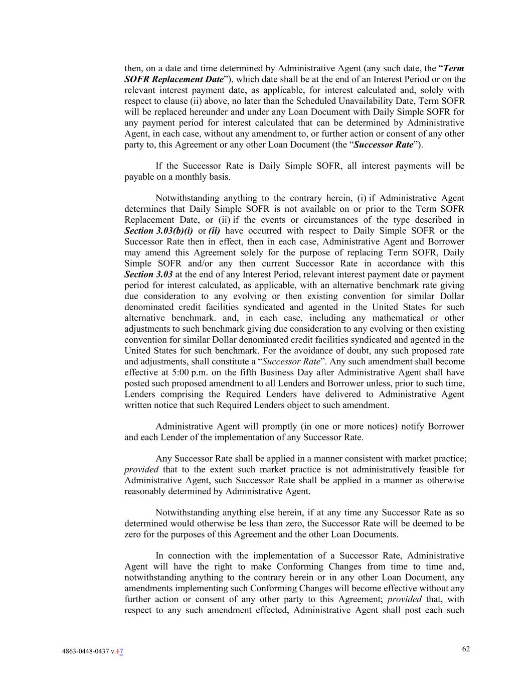 4863-0448-0437 v.17 62 then, on a date and time determined by Administrative Agent (any such date, the “Term SOFR Replacement Date”), which date shall be at the end of an Interest Period or on the relevant interest payment date, as applicable, for interest calculated and, solely with respect to clause (ii) above, no later than the Scheduled Unavailability Date, Term SOFR will be replaced hereunder and under any Loan Document with Daily Simple SOFR for any payment period for interest calculated that can be determined by Administrative Agent, in each case, without any amendment to, or further action or consent of any other party to, this Agreement or any other Loan Document (the “Successor Rate”). If the Successor Rate is Daily Simple SOFR, all interest payments will be payable on a monthly basis. Notwithstanding anything to the contrary herein, (i) if Administrative Agent determines that Daily Simple SOFR is not available on or prior to the Term SOFR Replacement Date, or (ii) if the events or circumstances of the type described in Section 3.03(b)(i) or (ii) have occurred with respect to Daily Simple SOFR or the Successor Rate then in effect, then in each case, Administrative Agent and Borrower may amend this Agreement solely for the purpose of replacing Term SOFR, Daily Simple SOFR and/or any then current Successor Rate in accordance with this Section 3.03 at the end of any Interest Period, relevant interest payment date or payment period for interest calculated, as applicable, with an alternative benchmark rate giving due consideration to any evolving or then existing convention for similar Dollar denominated credit facilities syndicated and agented in the United States for such alternative benchmark. and, in each case, including any mathematical or other adjustments to such benchmark giving due consideration to any evolving or then existing convention for similar Dollar denominated credit facilities syndicated and agented in the United States for such benchmark. For the avoidance of doubt, any such proposed rate and adjustments, shall constitute a “Successor Rate”. Any such amendment shall become effective at 5:00 p.m. on the fifth Business Day after Administrative Agent shall have posted such proposed amendment to all Lenders and Borrower unless, prior to such time, Lenders comprising the Required Lenders have delivered to Administrative Agent written notice that such Required Lenders object to such amendment. Administrative Agent will promptly (in one or more notices) notify Borrower and each Lender of the implementation of any Successor Rate. Any Successor Rate shall be applied in a manner consistent with market practice; provided that to the extent such market practice is not administratively feasible for Administrative Agent, such Successor Rate shall be applied in a manner as otherwise reasonably determined by Administrative Agent. Notwithstanding anything else herein, if at any time any Successor Rate as so determined would otherwise be less than zero, the Successor Rate will be deemed to be zero for the purposes of this Agreement and the other Loan Documents. In connection with the implementation of a Successor Rate, Administrative Agent will have the right to make Conforming Changes from time to time and, notwithstanding anything to the contrary herein or in any other Loan Document, any amendments implementing such Conforming Changes will become effective without any further action or consent of any other party to this Agreement; provided that, with respect to any such amendment effected, Administrative Agent shall post each such
