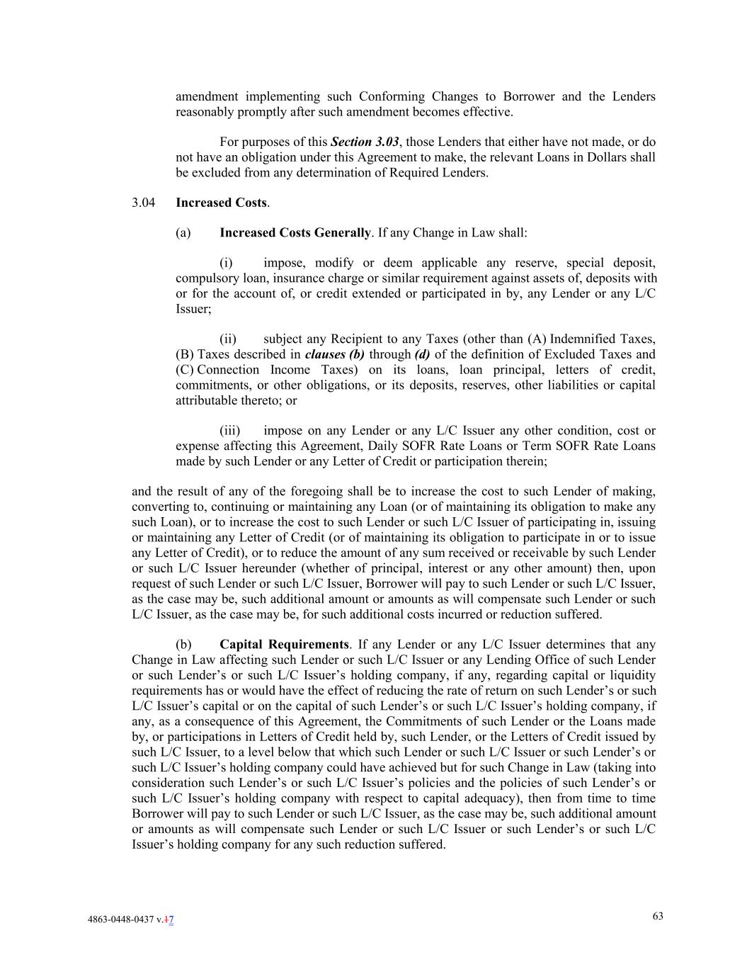 4863-0448-0437 v.17 63 amendment implementing such Conforming Changes to Borrower and the Lenders reasonably promptly after such amendment becomes effective. For purposes of this Section 3.03, those Lenders that either have not made, or do not have an obligation under this Agreement to make, the relevant Loans in Dollars shall be excluded from any determination of Required Lenders. 3.04 Increased Costs. (a) Increased Costs Generally. If any Change in Law shall: (i) impose, modify or deem applicable any reserve, special deposit, compulsory loan, insurance charge or similar requirement against assets of, deposits with or for the account of, or credit extended or participated in by, any Lender or any L/C Issuer; (ii) subject any Recipient to any Taxes (other than (A) Indemnified Taxes, (B) Taxes described in clauses (b) through (d) of the definition of Excluded Taxes and (C) Connection Income Taxes) on its loans, loan principal, letters of credit, commitments, or other obligations, or its deposits, reserves, other liabilities or capital attributable thereto; or (iii) impose on any Lender or any L/C Issuer any other condition, cost or expense affecting this Agreement, Daily SOFR Rate Loans or Term SOFR Rate Loans made by such Lender or any Letter of Credit or participation therein; and the result of any of the foregoing shall be to increase the cost to such Lender of making, converting to, continuing or maintaining any Loan (or of maintaining its obligation to make any such Loan), or to increase the cost to such Lender or such L/C Issuer of participating in, issuing or maintaining any Letter of Credit (or of maintaining its obligation to participate in or to issue any Letter of Credit), or to reduce the amount of any sum received or receivable by such Lender or such L/C Issuer hereunder (whether of principal, interest or any other amount) then, upon request of such Lender or such L/C Issuer, Borrower will pay to such Lender or such L/C Issuer, as the case may be, such additional amount or amounts as will compensate such Lender or such L/C Issuer, as the case may be, for such additional costs incurred or reduction suffered. (b) Capital Requirements. If any Lender or any L/C Issuer determines that any Change in Law affecting such Lender or such L/C Issuer or any Lending Office of such Lender or such Lender’s or such L/C Issuer’s holding company, if any, regarding capital or liquidity requirements has or would have the effect of reducing the rate of return on such Lender’s or such L/C Issuer’s capital or on the capital of such Lender’s or such L/C Issuer’s holding company, if any, as a consequence of this Agreement, the Commitments of such Lender or the Loans made by, or participations in Letters of Credit held by, such Lender, or the Letters of Credit issued by such L/C Issuer, to a level below that which such Lender or such L/C Issuer or such Lender’s or such L/C Issuer’s holding company could have achieved but for such Change in Law (taking into consideration such Lender’s or such L/C Issuer’s policies and the policies of such Lender’s or such L/C Issuer’s holding company with respect to capital adequacy), then from time to time Borrower will pay to such Lender or such L/C Issuer, as the case may be, such additional amount or amounts as will compensate such Lender or such L/C Issuer or such Lender’s or such L/C Issuer’s holding company for any such reduction suffered.