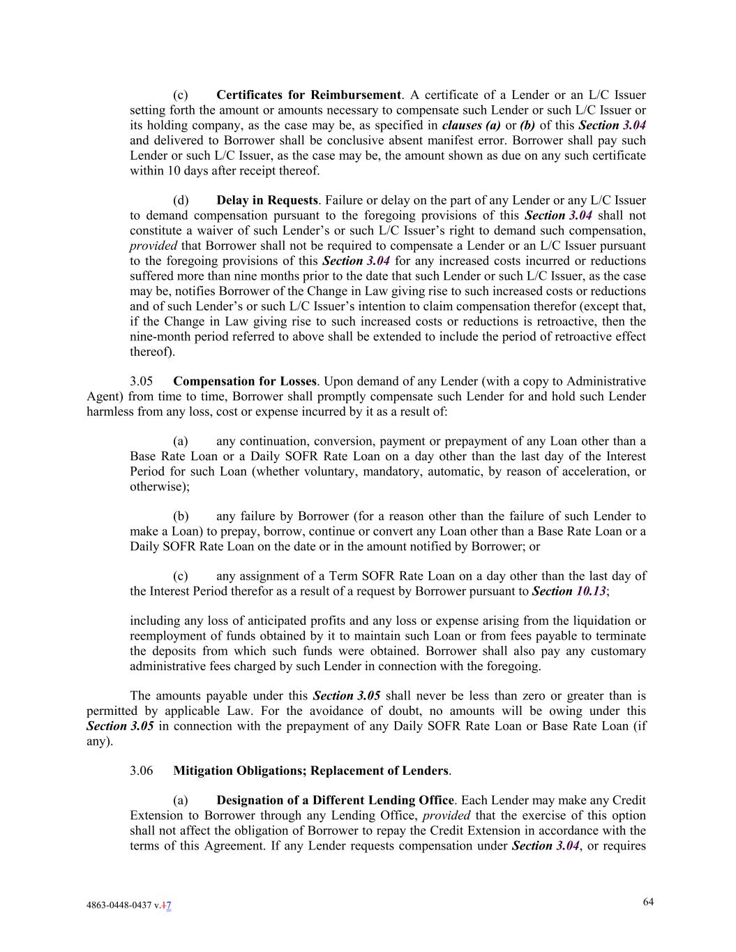4863-0448-0437 v.17 64 (c) Certificates for Reimbursement. A certificate of a Lender or an L/C Issuer setting forth the amount or amounts necessary to compensate such Lender or such L/C Issuer or its holding company, as the case may be, as specified in clauses (a) or (b) of this Section 3.04 and delivered to Borrower shall be conclusive absent manifest error. Borrower shall pay such Lender or such L/C Issuer, as the case may be, the amount shown as due on any such certificate within 10 days after receipt thereof. (d) Delay in Requests. Failure or delay on the part of any Lender or any L/C Issuer to demand compensation pursuant to the foregoing provisions of this Section 3.04 shall not constitute a waiver of such Lender’s or such L/C Issuer’s right to demand such compensation, provided that Borrower shall not be required to compensate a Lender or an L/C Issuer pursuant to the foregoing provisions of this Section 3.04 for any increased costs incurred or reductions suffered more than nine months prior to the date that such Lender or such L/C Issuer, as the case may be, notifies Borrower of the Change in Law giving rise to such increased costs or reductions and of such Lender’s or such L/C Issuer’s intention to claim compensation therefor (except that, if the Change in Law giving rise to such increased costs or reductions is retroactive, then the nine-month period referred to above shall be extended to include the period of retroactive effect thereof). 3.05 Compensation for Losses. Upon demand of any Lender (with a copy to Administrative Agent) from time to time, Borrower shall promptly compensate such Lender for and hold such Lender harmless from any loss, cost or expense incurred by it as a result of: (a) any continuation, conversion, payment or prepayment of any Loan other than a Base Rate Loan or a Daily SOFR Rate Loan on a day other than the last day of the Interest Period for such Loan (whether voluntary, mandatory, automatic, by reason of acceleration, or otherwise); (b) any failure by Borrower (for a reason other than the failure of such Lender to make a Loan) to prepay, borrow, continue or convert any Loan other than a Base Rate Loan or a Daily SOFR Rate Loan on the date or in the amount notified by Borrower; or (c) any assignment of a Term SOFR Rate Loan on a day other than the last day of the Interest Period therefor as a result of a request by Borrower pursuant to Section 10.13; including any loss of anticipated profits and any loss or expense arising from the liquidation or reemployment of funds obtained by it to maintain such Loan or from fees payable to terminate the deposits from which such funds were obtained. Borrower shall also pay any customary administrative fees charged by such Lender in connection with the foregoing. The amounts payable under this Section 3.05 shall never be less than zero or greater than is permitted by applicable Law. For the avoidance of doubt, no amounts will be owing under this Section 3.05 in connection with the prepayment of any Daily SOFR Rate Loan or Base Rate Loan (if any). 3.06 Mitigation Obligations; Replacement of Lenders. (a) Designation of a Different Lending Office. Each Lender may make any Credit Extension to Borrower through any Lending Office, provided that the exercise of this option shall not affect the obligation of Borrower to repay the Credit Extension in accordance with the terms of this Agreement. If any Lender requests compensation under Section 3.04, or requires