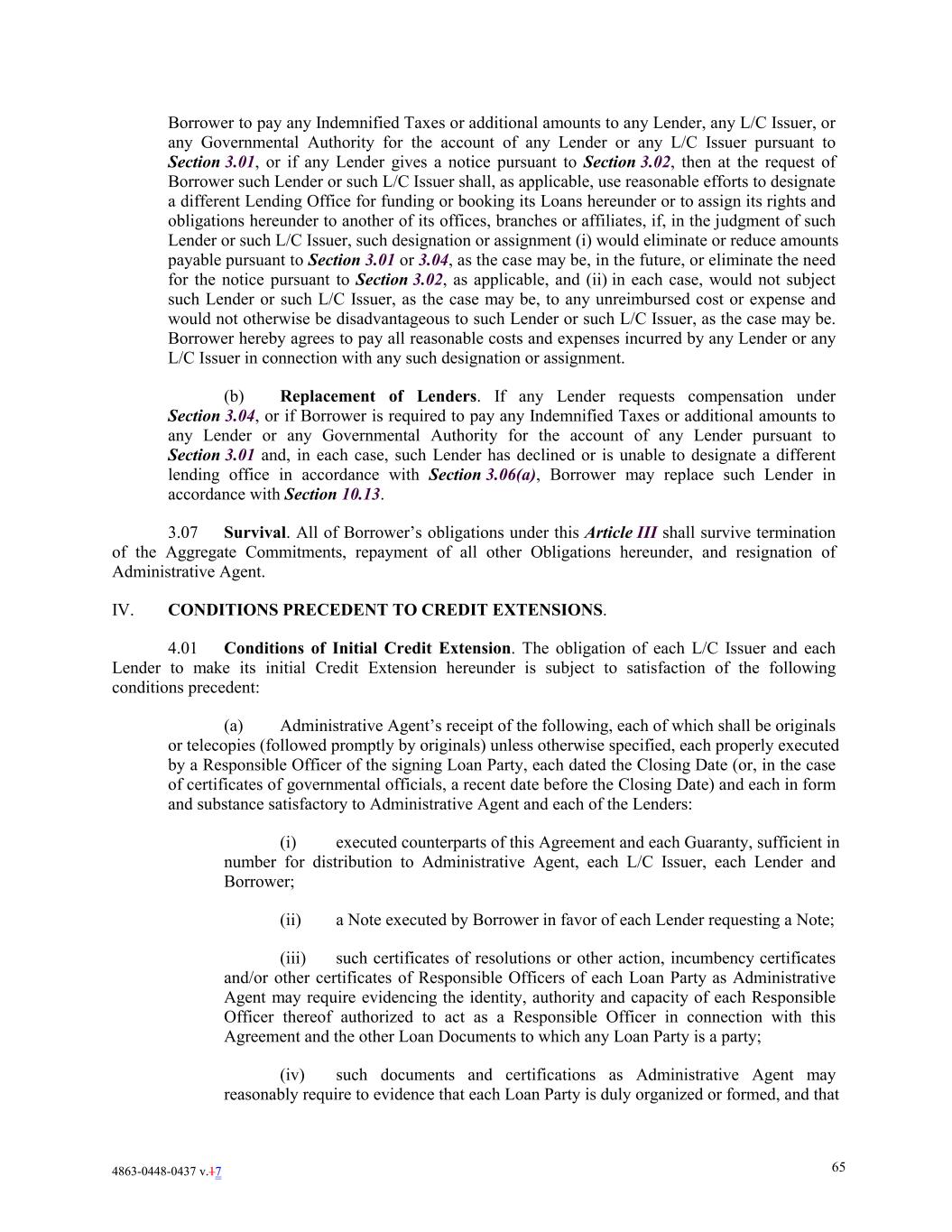 4863-0448-0437 v.17 65 Borrower to pay any Indemnified Taxes or additional amounts to any Lender, any L/C Issuer, or any Governmental Authority for the account of any Lender or any L/C Issuer pursuant to Section 3.01, or if any Lender gives a notice pursuant to Section 3.02, then at the request of Borrower such Lender or such L/C Issuer shall, as applicable, use reasonable efforts to designate a different Lending Office for funding or booking its Loans hereunder or to assign its rights and obligations hereunder to another of its offices, branches or affiliates, if, in the judgment of such Lender or such L/C Issuer, such designation or assignment (i) would eliminate or reduce amounts payable pursuant to Section 3.01 or 3.04, as the case may be, in the future, or eliminate the need for the notice pursuant to Section 3.02, as applicable, and (ii) in each case, would not subject such Lender or such L/C Issuer, as the case may be, to any unreimbursed cost or expense and would not otherwise be disadvantageous to such Lender or such L/C Issuer, as the case may be. Borrower hereby agrees to pay all reasonable costs and expenses incurred by any Lender or any L/C Issuer in connection with any such designation or assignment. (b) Replacement of Lenders. If any Lender requests compensation under Section 3.04, or if Borrower is required to pay any Indemnified Taxes or additional amounts to any Lender or any Governmental Authority for the account of any Lender pursuant to Section 3.01 and, in each case, such Lender has declined or is unable to designate a different lending office in accordance with Section 3.06(a), Borrower may replace such Lender in accordance with Section 10.13. 3.07 Survival. All of Borrower’s obligations under this Article III shall survive termination of the Aggregate Commitments, repayment of all other Obligations hereunder, and resignation of Administrative Agent. IV. CONDITIONS PRECEDENT TO CREDIT EXTENSIONS. 4.01 Conditions of Initial Credit Extension. The obligation of each L/C Issuer and each Lender to make its initial Credit Extension hereunder is subject to satisfaction of the following conditions precedent: (a) Administrative Agent’s receipt of the following, each of which shall be originals or telecopies (followed promptly by originals) unless otherwise specified, each properly executed by a Responsible Officer of the signing Loan Party, each dated the Closing Date (or, in the case of certificates of governmental officials, a recent date before the Closing Date) and each in form and substance satisfactory to Administrative Agent and each of the Lenders: (i) executed counterparts of this Agreement and each Guaranty, sufficient in number for distribution to Administrative Agent, each L/C Issuer, each Lender and Borrower; (ii) a Note executed by Borrower in favor of each Lender requesting a Note; (iii) such certificates of resolutions or other action, incumbency certificates and/or other certificates of Responsible Officers of each Loan Party as Administrative Agent may require evidencing the identity, authority and capacity of each Responsible Officer thereof authorized to act as a Responsible Officer in connection with this Agreement and the other Loan Documents to which any Loan Party is a party; (iv) such documents and certifications as Administrative Agent may reasonably require to evidence that each Loan Party is duly organized or formed, and that