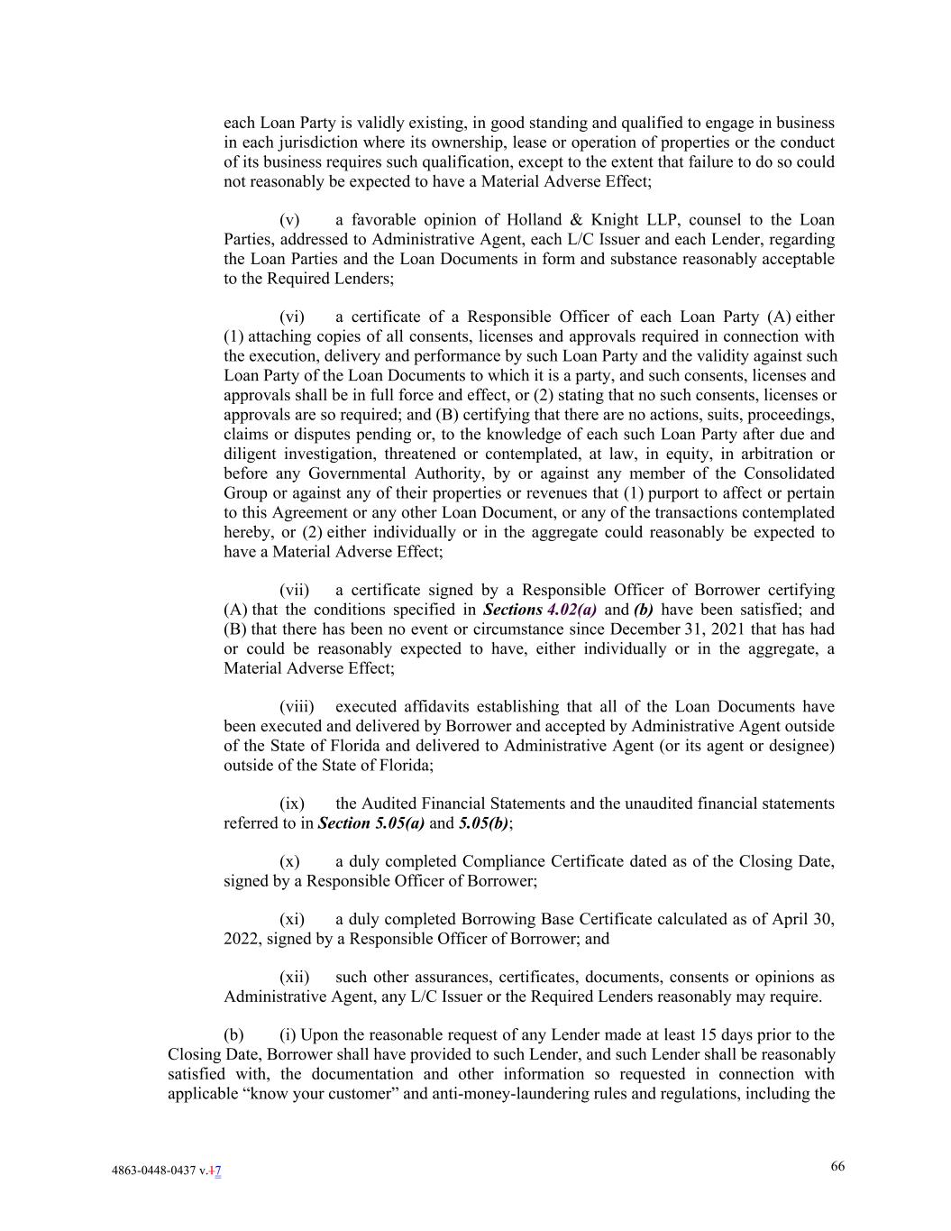 4863-0448-0437 v.17 66 each Loan Party is validly existing, in good standing and qualified to engage in business in each jurisdiction where its ownership, lease or operation of properties or the conduct of its business requires such qualification, except to the extent that failure to do so could not reasonably be expected to have a Material Adverse Effect; (v) a favorable opinion of Holland & Knight LLP, counsel to the Loan Parties, addressed to Administrative Agent, each L/C Issuer and each Lender, regarding the Loan Parties and the Loan Documents in form and substance reasonably acceptable to the Required Lenders; (vi) a certificate of a Responsible Officer of each Loan Party (A) either (1) attaching copies of all consents, licenses and approvals required in connection with the execution, delivery and performance by such Loan Party and the validity against such Loan Party of the Loan Documents to which it is a party, and such consents, licenses and approvals shall be in full force and effect, or (2) stating that no such consents, licenses or approvals are so required; and (B) certifying that there are no actions, suits, proceedings, claims or disputes pending or, to the knowledge of each such Loan Party after due and diligent investigation, threatened or contemplated, at law, in equity, in arbitration or before any Governmental Authority, by or against any member of the Consolidated Group or against any of their properties or revenues that (1) purport to affect or pertain to this Agreement or any other Loan Document, or any of the transactions contemplated hereby, or (2) either individually or in the aggregate could reasonably be expected to have a Material Adverse Effect; (vii) a certificate signed by a Responsible Officer of Borrower certifying (A) that the conditions specified in Sections 4.02(a) and (b) have been satisfied; and (B) that there has been no event or circumstance since December 31, 2021 that has had or could be reasonably expected to have, either individually or in the aggregate, a Material Adverse Effect; (viii) executed affidavits establishing that all of the Loan Documents have been executed and delivered by Borrower and accepted by Administrative Agent outside of the State of Florida and delivered to Administrative Agent (or its agent or designee) outside of the State of Florida; (ix) the Audited Financial Statements and the unaudited financial statements referred to in Section 5.05(a) and 5.05(b); (x) a duly completed Compliance Certificate dated as of the Closing Date, signed by a Responsible Officer of Borrower; (xi) a duly completed Borrowing Base Certificate calculated as of April 30, 2022, signed by a Responsible Officer of Borrower; and (xii) such other assurances, certificates, documents, consents or opinions as Administrative Agent, any L/C Issuer or the Required Lenders reasonably may require. (b) (i) Upon the reasonable request of any Lender made at least 15 days prior to the Closing Date, Borrower shall have provided to such Lender, and such Lender shall be reasonably satisfied with, the documentation and other information so requested in connection with applicable “know your customer” and anti-money-laundering rules and regulations, including the