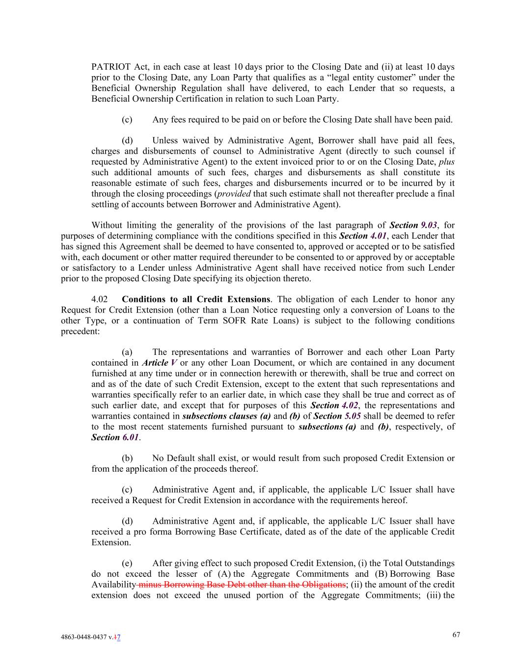 4863-0448-0437 v.17 67 PATRIOT Act, in each case at least 10 days prior to the Closing Date and (ii) at least 10 days prior to the Closing Date, any Loan Party that qualifies as a “legal entity customer” under the Beneficial Ownership Regulation shall have delivered, to each Lender that so requests, a Beneficial Ownership Certification in relation to such Loan Party. (c) Any fees required to be paid on or before the Closing Date shall have been paid. (d) Unless waived by Administrative Agent, Borrower shall have paid all fees, charges and disbursements of counsel to Administrative Agent (directly to such counsel if requested by Administrative Agent) to the extent invoiced prior to or on the Closing Date, plus such additional amounts of such fees, charges and disbursements as shall constitute its reasonable estimate of such fees, charges and disbursements incurred or to be incurred by it through the closing proceedings (provided that such estimate shall not thereafter preclude a final settling of accounts between Borrower and Administrative Agent). Without limiting the generality of the provisions of the last paragraph of Section 9.03, for purposes of determining compliance with the conditions specified in this Section 4.01, each Lender that has signed this Agreement shall be deemed to have consented to, approved or accepted or to be satisfied with, each document or other matter required thereunder to be consented to or approved by or acceptable or satisfactory to a Lender unless Administrative Agent shall have received notice from such Lender prior to the proposed Closing Date specifying its objection thereto. 4.02 Conditions to all Credit Extensions. The obligation of each Lender to honor any Request for Credit Extension (other than a Loan Notice requesting only a conversion of Loans to the other Type, or a continuation of Term SOFR Rate Loans) is subject to the following conditions precedent: (a) The representations and warranties of Borrower and each other Loan Party contained in Article V or any other Loan Document, or which are contained in any document furnished at any time under or in connection herewith or therewith, shall be true and correct on and as of the date of such Credit Extension, except to the extent that such representations and warranties specifically refer to an earlier date, in which case they shall be true and correct as of such earlier date, and except that for purposes of this Section 4.02, the representations and warranties contained in subsections clauses (a) and (b) of Section 5.05 shall be deemed to refer to the most recent statements furnished pursuant to subsections (a) and (b), respectively, of Section 6.01. (b) No Default shall exist, or would result from such proposed Credit Extension or from the application of the proceeds thereof. (c) Administrative Agent and, if applicable, the applicable L/C Issuer shall have received a Request for Credit Extension in accordance with the requirements hereof. (d) Administrative Agent and, if applicable, the applicable L/C Issuer shall have received a pro forma Borrowing Base Certificate, dated as of the date of the applicable Credit Extension. (e) After giving effect to such proposed Credit Extension, (i) the Total Outstandings do not exceed the lesser of (A) the Aggregate Commitments and (B) Borrowing Base Availability minus Borrowing Base Debt other than the Obligations; (ii) the amount of the credit extension does not exceed the unused portion of the Aggregate Commitments; (iii) the