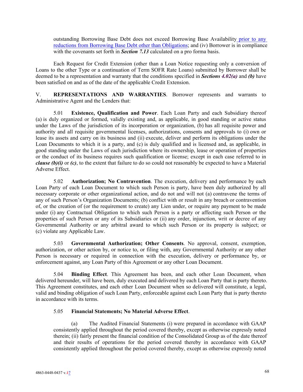4863-0448-0437 v.17 68 outstanding Borrowing Base Debt does not exceed Borrowing Base Availability prior to any reductions from Borrowing Base Debt other than Obligations; and (iv) Borrower is in compliance with the covenants set forth in Section 7.13 calculated on a pro forma basis. Each Request for Credit Extension (other than a Loan Notice requesting only a conversion of Loans to the other Type or a continuation of Term SOFR Rate Loans) submitted by Borrower shall be deemed to be a representation and warranty that the conditions specified in Sections 4.02(a) and (b) have been satisfied on and as of the date of the applicable Credit Extension. V. REPRESENTATIONS AND WARRANTIES. Borrower represents and warrants to Administrative Agent and the Lenders that: 5.01 Existence, Qualification and Power. Each Loan Party and each Subsidiary thereof (a) is duly organized or formed, validly existing and, as applicable, in good standing or active status under the Laws of the jurisdiction of its incorporation or organization, (b) has all requisite power and authority and all requisite governmental licenses, authorizations, consents and approvals to (i) own or lease its assets and carry on its business and (ii) execute, deliver and perform its obligations under the Loan Documents to which it is a party, and (c) is duly qualified and is licensed and, as applicable, in good standing under the Laws of each jurisdiction where its ownership, lease or operation of properties or the conduct of its business requires such qualification or license; except in each case referred to in clause (b)(i) or (c), to the extent that failure to do so could not reasonably be expected to have a Material Adverse Effect. 5.02 Authorization; No Contravention. The execution, delivery and performance by each Loan Party of each Loan Document to which such Person is party, have been duly authorized by all necessary corporate or other organizational action, and do not and will not (a) contravene the terms of any of such Person’s Organization Documents; (b) conflict with or result in any breach or contravention of, or the creation of (or the requirement to create) any Lien under, or require any payment to be made under (i) any Contractual Obligation to which such Person is a party or affecting such Person or the properties of such Person or any of its Subsidiaries or (ii) any order, injunction, writ or decree of any Governmental Authority or any arbitral award to which such Person or its property is subject; or (c) violate any Applicable Law. 5.03 Governmental Authorization; Other Consents. No approval, consent, exemption, authorization, or other action by, or notice to, or filing with, any Governmental Authority or any other Person is necessary or required in connection with the execution, delivery or performance by, or enforcement against, any Loan Party of this Agreement or any other Loan Document. 5.04 Binding Effect. This Agreement has been, and each other Loan Document, when delivered hereunder, will have been, duly executed and delivered by each Loan Party that is party thereto. This Agreement constitutes, and each other Loan Document when so delivered will constitute, a legal, valid and binding obligation of such Loan Party, enforceable against each Loan Party that is party thereto in accordance with its terms. 5.05 Financial Statements; No Material Adverse Effect. (a) The Audited Financial Statements (i) were prepared in accordance with GAAP consistently applied throughout the period covered thereby, except as otherwise expressly noted therein; (ii) fairly present the financial condition of the Consolidated Group as of the date thereof and their results of operations for the period covered thereby in accordance with GAAP consistently applied throughout the period covered thereby, except as otherwise expressly noted