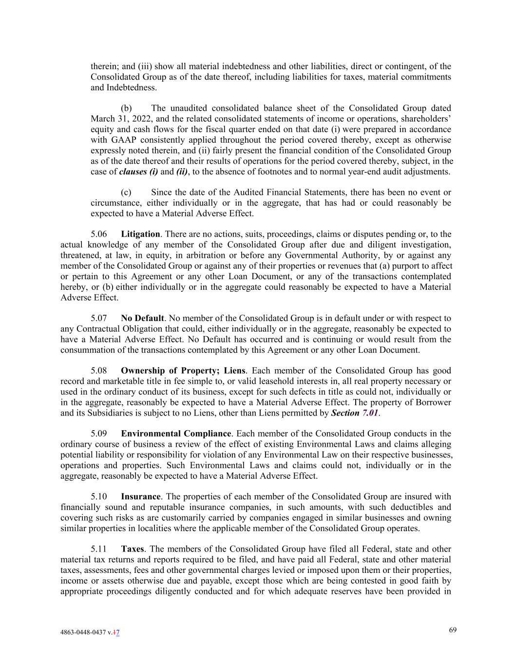 4863-0448-0437 v.17 69 therein; and (iii) show all material indebtedness and other liabilities, direct or contingent, of the Consolidated Group as of the date thereof, including liabilities for taxes, material commitments and Indebtedness. (b) The unaudited consolidated balance sheet of the Consolidated Group dated March 31, 2022, and the related consolidated statements of income or operations, shareholders’ equity and cash flows for the fiscal quarter ended on that date (i) were prepared in accordance with GAAP consistently applied throughout the period covered thereby, except as otherwise expressly noted therein, and (ii) fairly present the financial condition of the Consolidated Group as of the date thereof and their results of operations for the period covered thereby, subject, in the case of clauses (i) and (ii), to the absence of footnotes and to normal year-end audit adjustments. (c) Since the date of the Audited Financial Statements, there has been no event or circumstance, either individually or in the aggregate, that has had or could reasonably be expected to have a Material Adverse Effect. 5.06 Litigation. There are no actions, suits, proceedings, claims or disputes pending or, to the actual knowledge of any member of the Consolidated Group after due and diligent investigation, threatened, at law, in equity, in arbitration or before any Governmental Authority, by or against any member of the Consolidated Group or against any of their properties or revenues that (a) purport to affect or pertain to this Agreement or any other Loan Document, or any of the transactions contemplated hereby, or (b) either individually or in the aggregate could reasonably be expected to have a Material Adverse Effect. 5.07 No Default. No member of the Consolidated Group is in default under or with respect to any Contractual Obligation that could, either individually or in the aggregate, reasonably be expected to have a Material Adverse Effect. No Default has occurred and is continuing or would result from the consummation of the transactions contemplated by this Agreement or any other Loan Document. 5.08 Ownership of Property; Liens. Each member of the Consolidated Group has good record and marketable title in fee simple to, or valid leasehold interests in, all real property necessary or used in the ordinary conduct of its business, except for such defects in title as could not, individually or in the aggregate, reasonably be expected to have a Material Adverse Effect. The property of Borrower and its Subsidiaries is subject to no Liens, other than Liens permitted by Section 7.01. 5.09 Environmental Compliance. Each member of the Consolidated Group conducts in the ordinary course of business a review of the effect of existing Environmental Laws and claims alleging potential liability or responsibility for violation of any Environmental Law on their respective businesses, operations and properties. Such Environmental Laws and claims could not, individually or in the aggregate, reasonably be expected to have a Material Adverse Effect. 5.10 Insurance. The properties of each member of the Consolidated Group are insured with financially sound and reputable insurance companies, in such amounts, with such deductibles and covering such risks as are customarily carried by companies engaged in similar businesses and owning similar properties in localities where the applicable member of the Consolidated Group operates. 5.11 Taxes. The members of the Consolidated Group have filed all Federal, state and other material tax returns and reports required to be filed, and have paid all Federal, state and other material taxes, assessments, fees and other governmental charges levied or imposed upon them or their properties, income or assets otherwise due and payable, except those which are being contested in good faith by appropriate proceedings diligently conducted and for which adequate reserves have been provided in