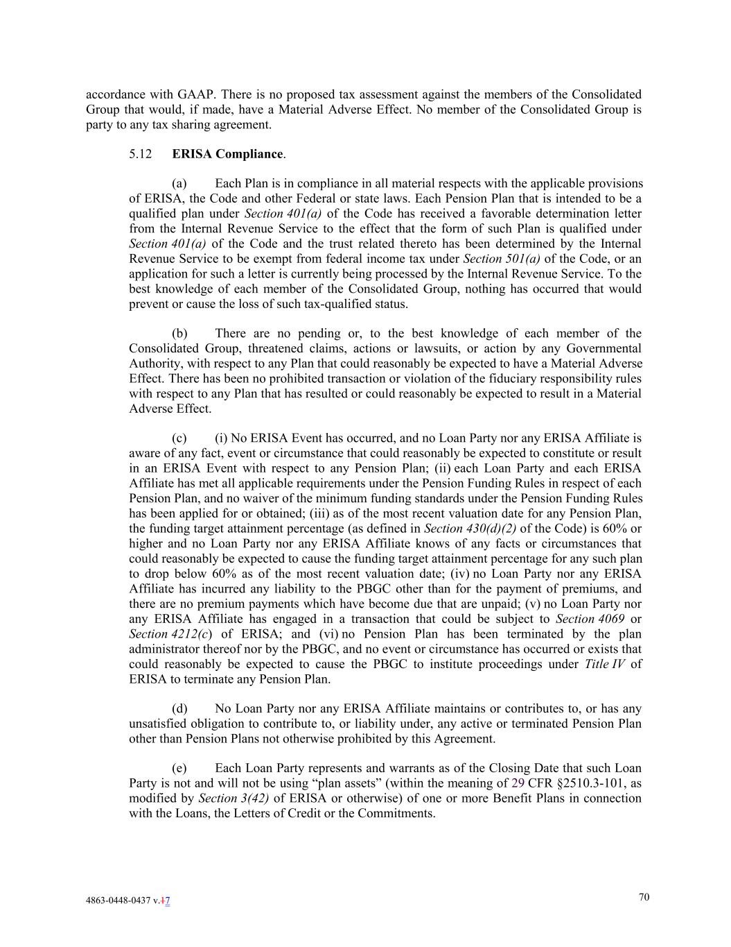4863-0448-0437 v.17 70 accordance with GAAP. There is no proposed tax assessment against the members of the Consolidated Group that would, if made, have a Material Adverse Effect. No member of the Consolidated Group is party to any tax sharing agreement. 5.12 ERISA Compliance. (a) Each Plan is in compliance in all material respects with the applicable provisions of ERISA, the Code and other Federal or state laws. Each Pension Plan that is intended to be a qualified plan under Section 401(a) of the Code has received a favorable determination letter from the Internal Revenue Service to the effect that the form of such Plan is qualified under Section 401(a) of the Code and the trust related thereto has been determined by the Internal Revenue Service to be exempt from federal income tax under Section 501(a) of the Code, or an application for such a letter is currently being processed by the Internal Revenue Service. To the best knowledge of each member of the Consolidated Group, nothing has occurred that would prevent or cause the loss of such tax-qualified status. (b) There are no pending or, to the best knowledge of each member of the Consolidated Group, threatened claims, actions or lawsuits, or action by any Governmental Authority, with respect to any Plan that could reasonably be expected to have a Material Adverse Effect. There has been no prohibited transaction or violation of the fiduciary responsibility rules with respect to any Plan that has resulted or could reasonably be expected to result in a Material Adverse Effect. (c) (i) No ERISA Event has occurred, and no Loan Party nor any ERISA Affiliate is aware of any fact, event or circumstance that could reasonably be expected to constitute or result in an ERISA Event with respect to any Pension Plan; (ii) each Loan Party and each ERISA Affiliate has met all applicable requirements under the Pension Funding Rules in respect of each Pension Plan, and no waiver of the minimum funding standards under the Pension Funding Rules has been applied for or obtained; (iii) as of the most recent valuation date for any Pension Plan, the funding target attainment percentage (as defined in Section 430(d)(2) of the Code) is 60% or higher and no Loan Party nor any ERISA Affiliate knows of any facts or circumstances that could reasonably be expected to cause the funding target attainment percentage for any such plan to drop below 60% as of the most recent valuation date; (iv) no Loan Party nor any ERISA Affiliate has incurred any liability to the PBGC other than for the payment of premiums, and there are no premium payments which have become due that are unpaid; (v) no Loan Party nor any ERISA Affiliate has engaged in a transaction that could be subject to Section 4069 or Section 4212(c) of ERISA; and (vi) no Pension Plan has been terminated by the plan administrator thereof nor by the PBGC, and no event or circumstance has occurred or exists that could reasonably be expected to cause the PBGC to institute proceedings under Title IV of ERISA to terminate any Pension Plan. (d) No Loan Party nor any ERISA Affiliate maintains or contributes to, or has any unsatisfied obligation to contribute to, or liability under, any active or terminated Pension Plan other than Pension Plans not otherwise prohibited by this Agreement. (e) Each Loan Party represents and warrants as of the Closing Date that such Loan Party is not and will not be using “plan assets” (within the meaning of 29 CFR §2510.3-101, as modified by Section 3(42) of ERISA or otherwise) of one or more Benefit Plans in connection with the Loans, the Letters of Credit or the Commitments.