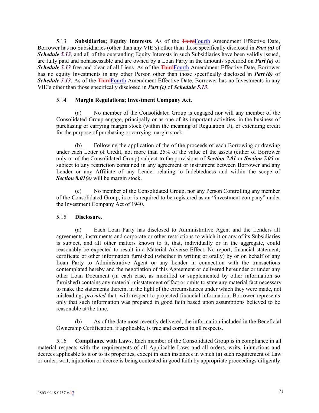 4863-0448-0437 v.17 71 5.13 Subsidiaries; Equity Interests. As of the ThirdFourth Amendment Effective Date, Borrower has no Subsidiaries (other than any VIE’s) other than those specifically disclosed in Part (a) of Schedule 5.13, and all of the outstanding Equity Interests in such Subsidiaries have been validly issued, are fully paid and nonassessable and are owned by a Loan Party in the amounts specified on Part (a) of Schedule 5.13 free and clear of all Liens. As of the ThirdFourth Amendment Effective Date, Borrower has no equity Investments in any other Person other than those specifically disclosed in Part (b) of Schedule 5.13. As of the ThirdFourth Amendment Effective Date, Borrower has no Investments in any VIE’s other than those specifically disclosed in Part (c) of Schedule 5.13. 5.14 Margin Regulations; Investment Company Act. (a) No member of the Consolidated Group is engaged nor will any member of the Consolidated Group engage, principally or as one of its important activities, in the business of purchasing or carrying margin stock (within the meaning of Regulation U), or extending credit for the purpose of purchasing or carrying margin stock. (b) Following the application of the of the proceeds of each Borrowing or drawing under each Letter of Credit, not more than 25% of the value of the assets (either of Borrower only or of the Consolidated Group) subject to the provisions of Section 7.01 or Section 7.05 or subject to any restriction contained in any agreement or instrument between Borrower and any Lender or any Affiliate of any Lender relating to Indebtedness and within the scope of Section 8.01(e) will be margin stock. (c) No member of the Consolidated Group, nor any Person Controlling any member of the Consolidated Group, is or is required to be registered as an “investment company” under the Investment Company Act of 1940. 5.15 Disclosure. (a) Each Loan Party has disclosed to Administrative Agent and the Lenders all agreements, instruments and corporate or other restrictions to which it or any of its Subsidiaries is subject, and all other matters known to it, that, individually or in the aggregate, could reasonably be expected to result in a Material Adverse Effect. No report, financial statement, certificate or other information furnished (whether in writing or orally) by or on behalf of any Loan Party to Administrative Agent or any Lender in connection with the transactions contemplated hereby and the negotiation of this Agreement or delivered hereunder or under any other Loan Document (in each case, as modified or supplemented by other information so furnished) contains any material misstatement of fact or omits to state any material fact necessary to make the statements therein, in the light of the circumstances under which they were made, not misleading; provided that, with respect to projected financial information, Borrower represents only that such information was prepared in good faith based upon assumptions believed to be reasonable at the time. (b) As of the date most recently delivered, the information included in the Beneficial Ownership Certification, if applicable, is true and correct in all respects. 5.16 Compliance with Laws. Each member of the Consolidated Group is in compliance in all material respects with the requirements of all Applicable Laws and all orders, writs, injunctions and decrees applicable to it or to its properties, except in such instances in which (a) such requirement of Law or order, writ, injunction or decree is being contested in good faith by appropriate proceedings diligently