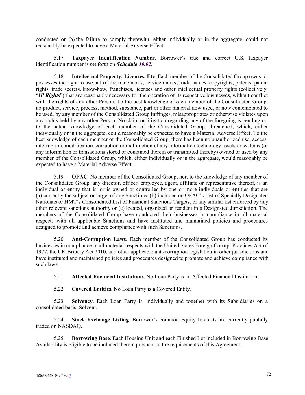 4863-0448-0437 v.17 72 conducted or (b) the failure to comply therewith, either individually or in the aggregate, could not reasonably be expected to have a Material Adverse Effect. 5.17 Taxpayer Identification Number. Borrower’s true and correct U.S. taxpayer identification number is set forth on Schedule 10.02. 5.18 Intellectual Property; Licenses, Etc. Each member of the Consolidated Group owns, or possesses the right to use, all of the trademarks, service marks, trade names, copyrights, patents, patent rights, trade secrets, know-how, franchises, licenses and other intellectual property rights (collectively, “IP Rights”) that are reasonably necessary for the operation of its respective businesses, without conflict with the rights of any other Person. To the best knowledge of each member of the Consolidated Group, no product, service, process, method, substance, part or other material now used, or now contemplated to be used, by any member of the Consolidated Group infringes, misappropriates or otherwise violates upon any rights held by any other Person. No claim or litigation regarding any of the foregoing is pending or, to the actual knowledge of each member of the Consolidated Group, threatened, which, either individually or in the aggregate, could reasonably be expected to have a Material Adverse Effect. To the best knowledge of each member of the Consolidated Group, there has been no unauthorized use, access, interruption, modification, corruption or malfunction of any information technology assets or systems (or any information or transactions stored or contained therein or transmitted thereby) owned or used by any member of the Consolidated Group, which, either individually or in the aggregate, would reasonably be expected to have a Material Adverse Effect. 5.19 OFAC. No member of the Consolidated Group, nor, to the knowledge of any member of the Consolidated Group, any director, officer, employee, agent, affiliate or representative thereof, is an individual or entity that is, or is owned or controlled by one or more individuals or entities that are (a) currently the subject or target of any Sanctions, (b) included on OFAC’s List of Specially Designated Nationals or HMT’s Consolidated List of Financial Sanctions Targets, or any similar list enforced by any other relevant sanctions authority or (c) located, organized or resident in a Designated Jurisdiction. The members of the Consolidated Group have conducted their businesses in compliance in all material respects with all applicable Sanctions and have instituted and maintained policies and procedures designed to promote and achieve compliance with such Sanctions. 5.20 Anti-Corruption Laws. Each member of the Consolidated Group has conducted its businesses in compliance in all material respects with the United States Foreign Corrupt Practices Act of 1977, the UK Bribery Act 2010, and other applicable anti-corruption legislation in other jurisdictions and have instituted and maintained policies and procedures designed to promote and achieve compliance with such laws. 5.21 Affected Financial Institutions. No Loan Party is an Affected Financial Institution. 5.22 Covered Entities. No Loan Party is a Covered Entity. 5.23 Solvency. Each Loan Party is, individually and together with its Subsidiaries on a consolidated basis, Solvent. 5.24 Stock Exchange Listing. Borrower’s common Equity Interests are currently publicly traded on NASDAQ. 5.25 Borrowing Base. Each Housing Unit and each Finished Lot included in Borrowing Base Availability is eligible to be included therein pursuant to the requirements of this Agreement.