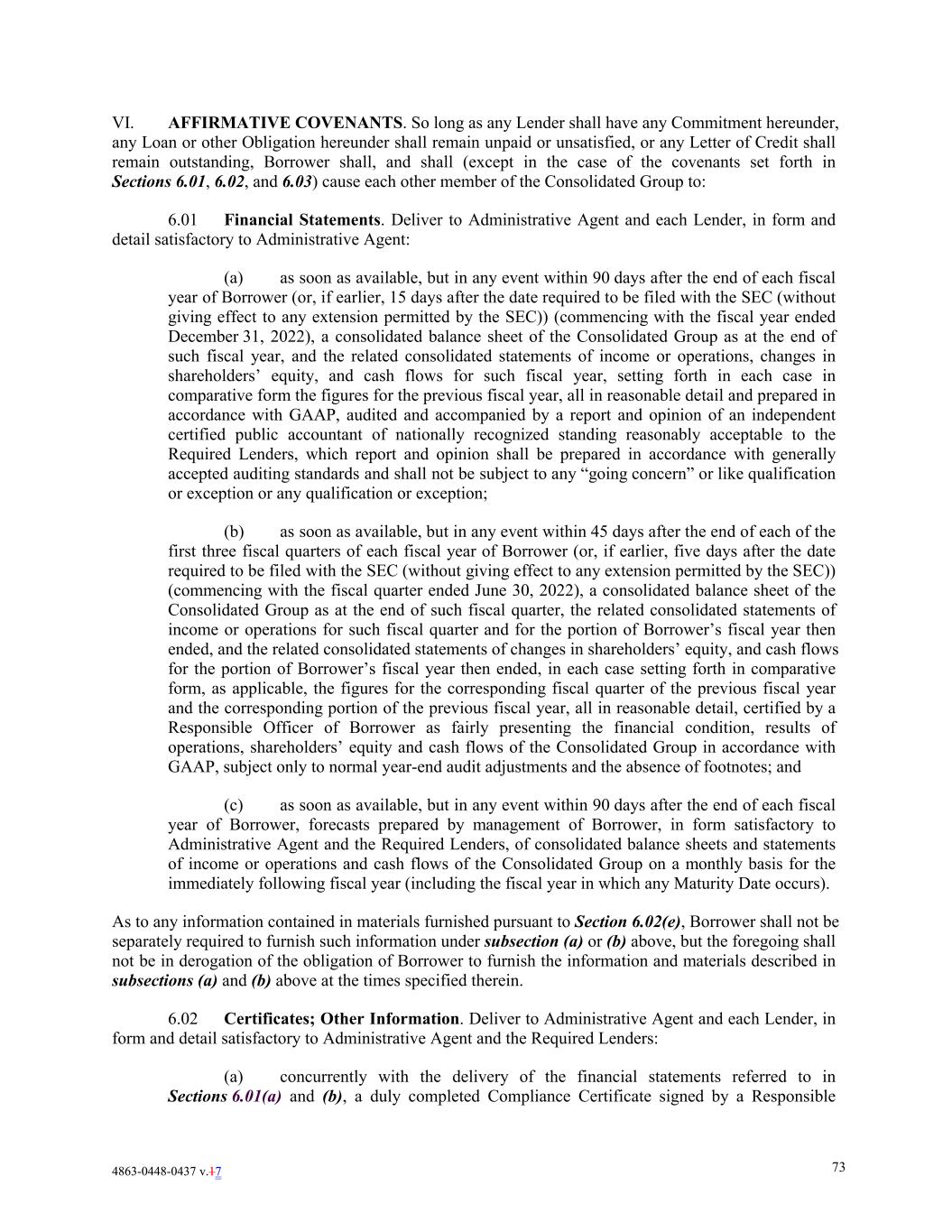 4863-0448-0437 v.17 73 VI. AFFIRMATIVE COVENANTS. So long as any Lender shall have any Commitment hereunder, any Loan or other Obligation hereunder shall remain unpaid or unsatisfied, or any Letter of Credit shall remain outstanding, Borrower shall, and shall (except in the case of the covenants set forth in Sections 6.01, 6.02, and 6.03) cause each other member of the Consolidated Group to: 6.01 Financial Statements. Deliver to Administrative Agent and each Lender, in form and detail satisfactory to Administrative Agent: (a) as soon as available, but in any event within 90 days after the end of each fiscal year of Borrower (or, if earlier, 15 days after the date required to be filed with the SEC (without giving effect to any extension permitted by the SEC)) (commencing with the fiscal year ended December 31, 2022), a consolidated balance sheet of the Consolidated Group as at the end of such fiscal year, and the related consolidated statements of income or operations, changes in shareholders’ equity, and cash flows for such fiscal year, setting forth in each case in comparative form the figures for the previous fiscal year, all in reasonable detail and prepared in accordance with GAAP, audited and accompanied by a report and opinion of an independent certified public accountant of nationally recognized standing reasonably acceptable to the Required Lenders, which report and opinion shall be prepared in accordance with generally accepted auditing standards and shall not be subject to any “going concern” or like qualification or exception or any qualification or exception; (b) as soon as available, but in any event within 45 days after the end of each of the first three fiscal quarters of each fiscal year of Borrower (or, if earlier, five days after the date required to be filed with the SEC (without giving effect to any extension permitted by the SEC)) (commencing with the fiscal quarter ended June 30, 2022), a consolidated balance sheet of the Consolidated Group as at the end of such fiscal quarter, the related consolidated statements of income or operations for such fiscal quarter and for the portion of Borrower’s fiscal year then ended, and the related consolidated statements of changes in shareholders’ equity, and cash flows for the portion of Borrower’s fiscal year then ended, in each case setting forth in comparative form, as applicable, the figures for the corresponding fiscal quarter of the previous fiscal year and the corresponding portion of the previous fiscal year, all in reasonable detail, certified by a Responsible Officer of Borrower as fairly presenting the financial condition, results of operations, shareholders’ equity and cash flows of the Consolidated Group in accordance with GAAP, subject only to normal year-end audit adjustments and the absence of footnotes; and (c) as soon as available, but in any event within 90 days after the end of each fiscal year of Borrower, forecasts prepared by management of Borrower, in form satisfactory to Administrative Agent and the Required Lenders, of consolidated balance sheets and statements of income or operations and cash flows of the Consolidated Group on a monthly basis for the immediately following fiscal year (including the fiscal year in which any Maturity Date occurs). As to any information contained in materials furnished pursuant to Section 6.02(e), Borrower shall not be separately required to furnish such information under subsection (a) or (b) above, but the foregoing shall not be in derogation of the obligation of Borrower to furnish the information and materials described in subsections (a) and (b) above at the times specified therein. 6.02 Certificates; Other Information. Deliver to Administrative Agent and each Lender, in form and detail satisfactory to Administrative Agent and the Required Lenders: (a) concurrently with the delivery of the financial statements referred to in Sections 6.01(a) and (b), a duly completed Compliance Certificate signed by a Responsible