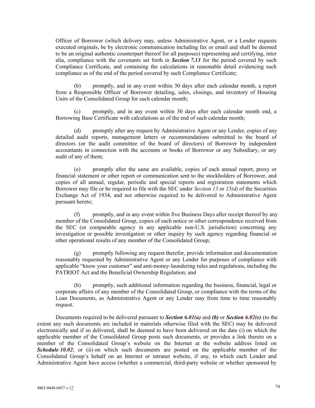 4863-0448-0437 v.17 74 Officer of Borrower (which delivery may, unless Administrative Agent, or a Lender requests executed originals, be by electronic communication including fax or email and shall be deemed to be an original authentic counterpart thereof for all purposes) representing and certifying, inter alia, compliance with the covenants set forth in Section 7.13 for the period covered by such Compliance Certificate, and containing the calculations in reasonable detail evidencing such compliance as of the end of the period covered by such Compliance Certificate; (b) promptly, and in any event within 30 days after each calendar month, a report from a Responsible Officer of Borrower detailing, sales, closings, and inventory of Housing Units of the Consolidated Group for such calendar month; (c) promptly, and in any event within 30 days after each calendar month end, a Borrowing Base Certificate with calculations as of the end of such calendar month; (d) promptly after any request by Administrative Agent or any Lender, copies of any detailed audit reports, management letters or recommendations submitted to the board of directors (or the audit committee of the board of directors) of Borrower by independent accountants in connection with the accounts or books of Borrower or any Subsidiary, or any audit of any of them; (e) promptly after the same are available, copies of each annual report, proxy or financial statement or other report or communication sent to the stockholders of Borrower, and copies of all annual, regular, periodic and special reports and registration statements which Borrower may file or be required to file with the SEC under Section 13 or 15(d) of the Securities Exchange Act of 1934, and not otherwise required to be delivered to Administrative Agent pursuant hereto; (f) promptly, and in any event within five Business Days after receipt thereof by any member of the Consolidated Group, copies of each notice or other correspondence received from the SEC (or comparable agency in any applicable non-U.S. jurisdiction) concerning any investigation or possible investigation or other inquiry by such agency regarding financial or other operational results of any member of the Consolidated Group; (g) promptly following any request therefor, provide information and documentation reasonably requested by Administrative Agent or any Lender for purposes of compliance with applicable “know your customer” and anti-money-laundering rules and regulations, including the PATRIOT Act and the Beneficial Ownership Regulation; and (h) promptly, such additional information regarding the business, financial, legal or corporate affairs of any member of the Consolidated Group, or compliance with the terms of the Loan Documents, as Administrative Agent or any Lender may from time to time reasonably request. Documents required to be delivered pursuant to Section 6.01(a) and (b) or Section 6.02(e) (to the extent any such documents are included in materials otherwise filed with the SEC) may be delivered electronically and if so delivered, shall be deemed to have been delivered on the date (i) on which the applicable member of the Consolidated Group posts such documents, or provides a link thereto on a member of the Consolidated Group’s website on the Internet at the website address listed on Schedule 10.02; or (ii) on which such documents are posted on the applicable member of the Consolidated Group’s behalf on an Internet or intranet website, if any, to which each Lender and Administrative Agent have access (whether a commercial, third-party website or whether sponsored by