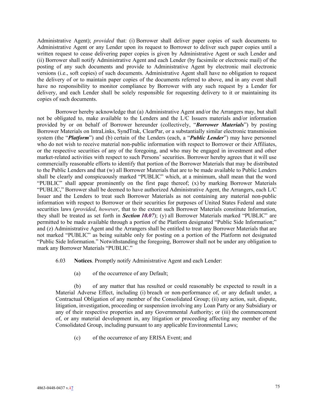 4863-0448-0437 v.17 75 Administrative Agent); provided that: (i) Borrower shall deliver paper copies of such documents to Administrative Agent or any Lender upon its request to Borrower to deliver such paper copies until a written request to cease delivering paper copies is given by Administrative Agent or such Lender and (ii) Borrower shall notify Administrative Agent and each Lender (by facsimile or electronic mail) of the posting of any such documents and provide to Administrative Agent by electronic mail electronic versions (i.e., soft copies) of such documents. Administrative Agent shall have no obligation to request the delivery of or to maintain paper copies of the documents referred to above, and in any event shall have no responsibility to monitor compliance by Borrower with any such request by a Lender for delivery, and each Lender shall be solely responsible for requesting delivery to it or maintaining its copies of such documents. Borrower hereby acknowledge that (a) Administrative Agent and/or the Arrangers may, but shall not be obligated to, make available to the Lenders and the L/C Issuers materials and/or information provided by or on behalf of Borrower hereunder (collectively, “Borrower Materials”) by posting Borrower Materials on IntraLinks, SyndTrak, ClearPar, or a substantially similar electronic transmission system (the “Platform”) and (b) certain of the Lenders (each, a “Public Lender”) may have personnel who do not wish to receive material non-public information with respect to Borrower or their Affiliates, or the respective securities of any of the foregoing, and who may be engaged in investment and other market-related activities with respect to such Persons’ securities. Borrower hereby agrees that it will use commercially reasonable efforts to identify that portion of the Borrower Materials that may be distributed to the Public Lenders and that (w) all Borrower Materials that are to be made available to Public Lenders shall be clearly and conspicuously marked “PUBLIC” which, at a minimum, shall mean that the word “PUBLIC” shall appear prominently on the first page thereof; (x) by marking Borrower Materials “PUBLIC,” Borrower shall be deemed to have authorized Administrative Agent, the Arrangers, each L/C Issuer and the Lenders to treat such Borrower Materials as not containing any material non-public information with respect to Borrower or their securities for purposes of United States Federal and state securities laws (provided, however, that to the extent such Borrower Materials constitute Information, they shall be treated as set forth in Section 10.07); (y) all Borrower Materials marked “PUBLIC” are permitted to be made available through a portion of the Platform designated “Public Side Information;” and (z) Administrative Agent and the Arrangers shall be entitled to treat any Borrower Materials that are not marked “PUBLIC” as being suitable only for posting on a portion of the Platform not designated “Public Side Information.” Notwithstanding the foregoing, Borrower shall not be under any obligation to mark any Borrower Materials “PUBLIC.” 6.03 Notices. Promptly notify Administrative Agent and each Lender: (a) of the occurrence of any Default; (b) of any matter that has resulted or could reasonably be expected to result in a Material Adverse Effect, including (i) breach or non-performance of, or any default under, a Contractual Obligation of any member of the Consolidated Group; (ii) any action, suit, dispute, litigation, investigation, proceeding or suspension involving any Loan Party or any Subsidiary or any of their respective properties and any Governmental Authority; or (iii) the commencement of, or any material development in, any litigation or proceeding affecting any member of the Consolidated Group, including pursuant to any applicable Environmental Laws; (c) of the occurrence of any ERISA Event; and