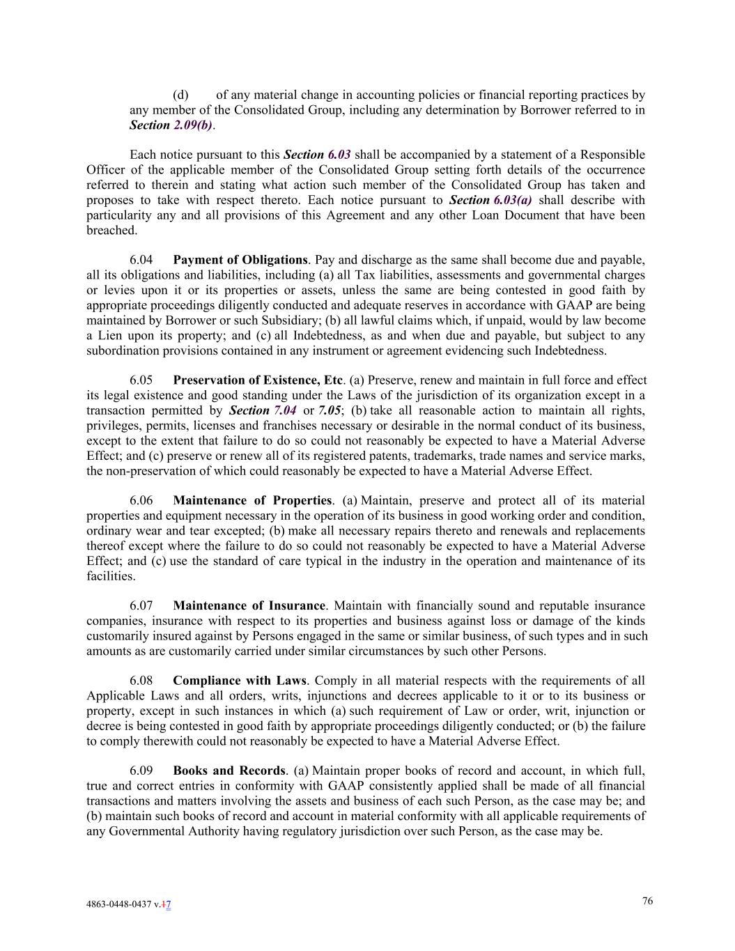 4863-0448-0437 v.17 76 (d) of any material change in accounting policies or financial reporting practices by any member of the Consolidated Group, including any determination by Borrower referred to in Section 2.09(b). Each notice pursuant to this Section 6.03 shall be accompanied by a statement of a Responsible Officer of the applicable member of the Consolidated Group setting forth details of the occurrence referred to therein and stating what action such member of the Consolidated Group has taken and proposes to take with respect thereto. Each notice pursuant to Section 6.03(a) shall describe with particularity any and all provisions of this Agreement and any other Loan Document that have been breached. 6.04 Payment of Obligations. Pay and discharge as the same shall become due and payable, all its obligations and liabilities, including (a) all Tax liabilities, assessments and governmental charges or levies upon it or its properties or assets, unless the same are being contested in good faith by appropriate proceedings diligently conducted and adequate reserves in accordance with GAAP are being maintained by Borrower or such Subsidiary; (b) all lawful claims which, if unpaid, would by law become a Lien upon its property; and (c) all Indebtedness, as and when due and payable, but subject to any subordination provisions contained in any instrument or agreement evidencing such Indebtedness. 6.05 Preservation of Existence, Etc. (a) Preserve, renew and maintain in full force and effect its legal existence and good standing under the Laws of the jurisdiction of its organization except in a transaction permitted by Section 7.04 or 7.05; (b) take all reasonable action to maintain all rights, privileges, permits, licenses and franchises necessary or desirable in the normal conduct of its business, except to the extent that failure to do so could not reasonably be expected to have a Material Adverse Effect; and (c) preserve or renew all of its registered patents, trademarks, trade names and service marks, the non-preservation of which could reasonably be expected to have a Material Adverse Effect. 6.06 Maintenance of Properties. (a) Maintain, preserve and protect all of its material properties and equipment necessary in the operation of its business in good working order and condition, ordinary wear and tear excepted; (b) make all necessary repairs thereto and renewals and replacements thereof except where the failure to do so could not reasonably be expected to have a Material Adverse Effect; and (c) use the standard of care typical in the industry in the operation and maintenance of its facilities. 6.07 Maintenance of Insurance. Maintain with financially sound and reputable insurance companies, insurance with respect to its properties and business against loss or damage of the kinds customarily insured against by Persons engaged in the same or similar business, of such types and in such amounts as are customarily carried under similar circumstances by such other Persons. 6.08 Compliance with Laws. Comply in all material respects with the requirements of all Applicable Laws and all orders, writs, injunctions and decrees applicable to it or to its business or property, except in such instances in which (a) such requirement of Law or order, writ, injunction or decree is being contested in good faith by appropriate proceedings diligently conducted; or (b) the failure to comply therewith could not reasonably be expected to have a Material Adverse Effect. 6.09 Books and Records. (a) Maintain proper books of record and account, in which full, true and correct entries in conformity with GAAP consistently applied shall be made of all financial transactions and matters involving the assets and business of each such Person, as the case may be; and (b) maintain such books of record and account in material conformity with all applicable requirements of any Governmental Authority having regulatory jurisdiction over such Person, as the case may be.