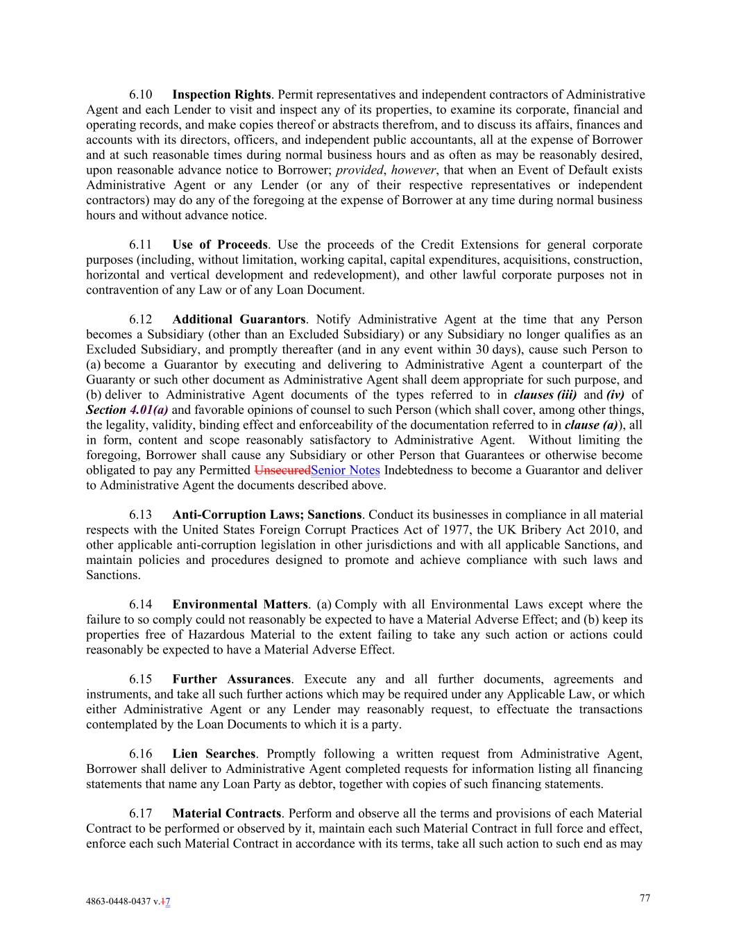 4863-0448-0437 v.17 77 6.10 Inspection Rights. Permit representatives and independent contractors of Administrative Agent and each Lender to visit and inspect any of its properties, to examine its corporate, financial and operating records, and make copies thereof or abstracts therefrom, and to discuss its affairs, finances and accounts with its directors, officers, and independent public accountants, all at the expense of Borrower and at such reasonable times during normal business hours and as often as may be reasonably desired, upon reasonable advance notice to Borrower; provided, however, that when an Event of Default exists Administrative Agent or any Lender (or any of their respective representatives or independent contractors) may do any of the foregoing at the expense of Borrower at any time during normal business hours and without advance notice. 6.11 Use of Proceeds. Use the proceeds of the Credit Extensions for general corporate purposes (including, without limitation, working capital, capital expenditures, acquisitions, construction, horizontal and vertical development and redevelopment), and other lawful corporate purposes not in contravention of any Law or of any Loan Document. 6.12 Additional Guarantors. Notify Administrative Agent at the time that any Person becomes a Subsidiary (other than an Excluded Subsidiary) or any Subsidiary no longer qualifies as an Excluded Subsidiary, and promptly thereafter (and in any event within 30 days), cause such Person to (a) become a Guarantor by executing and delivering to Administrative Agent a counterpart of the Guaranty or such other document as Administrative Agent shall deem appropriate for such purpose, and (b) deliver to Administrative Agent documents of the types referred to in clauses (iii) and (iv) of Section 4.01(a) and favorable opinions of counsel to such Person (which shall cover, among other things, the legality, validity, binding effect and enforceability of the documentation referred to in clause (a)), all in form, content and scope reasonably satisfactory to Administrative Agent. Without limiting the foregoing, Borrower shall cause any Subsidiary or other Person that Guarantees or otherwise become obligated to pay any Permitted UnsecuredSenior Notes Indebtedness to become a Guarantor and deliver to Administrative Agent the documents described above. 6.13 Anti-Corruption Laws; Sanctions. Conduct its businesses in compliance in all material respects with the United States Foreign Corrupt Practices Act of 1977, the UK Bribery Act 2010, and other applicable anti-corruption legislation in other jurisdictions and with all applicable Sanctions, and maintain policies and procedures designed to promote and achieve compliance with such laws and Sanctions. 6.14 Environmental Matters. (a) Comply with all Environmental Laws except where the failure to so comply could not reasonably be expected to have a Material Adverse Effect; and (b) keep its properties free of Hazardous Material to the extent failing to take any such action or actions could reasonably be expected to have a Material Adverse Effect. 6.15 Further Assurances. Execute any and all further documents, agreements and instruments, and take all such further actions which may be required under any Applicable Law, or which either Administrative Agent or any Lender may reasonably request, to effectuate the transactions contemplated by the Loan Documents to which it is a party. 6.16 Lien Searches. Promptly following a written request from Administrative Agent, Borrower shall deliver to Administrative Agent completed requests for information listing all financing statements that name any Loan Party as debtor, together with copies of such financing statements. 6.17 Material Contracts. Perform and observe all the terms and provisions of each Material Contract to be performed or observed by it, maintain each such Material Contract in full force and effect, enforce each such Material Contract in accordance with its terms, take all such action to such end as may