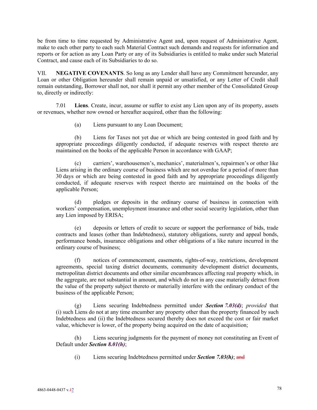 4863-0448-0437 v.17 78 be from time to time requested by Administrative Agent and, upon request of Administrative Agent, make to each other party to each such Material Contract such demands and requests for information and reports or for action as any Loan Party or any of its Subsidiaries is entitled to make under such Material Contract, and cause each of its Subsidiaries to do so. VII. NEGATIVE COVENANTS. So long as any Lender shall have any Commitment hereunder, any Loan or other Obligation hereunder shall remain unpaid or unsatisfied, or any Letter of Credit shall remain outstanding, Borrower shall not, nor shall it permit any other member of the Consolidated Group to, directly or indirectly: 7.01 Liens. Create, incur, assume or suffer to exist any Lien upon any of its property, assets or revenues, whether now owned or hereafter acquired, other than the following: (a) Liens pursuant to any Loan Document; (b) Liens for Taxes not yet due or which are being contested in good faith and by appropriate proceedings diligently conducted, if adequate reserves with respect thereto are maintained on the books of the applicable Person in accordance with GAAP; (c) carriers’, warehousemen’s, mechanics’, materialmen’s, repairmen’s or other like Liens arising in the ordinary course of business which are not overdue for a period of more than 30 days or which are being contested in good faith and by appropriate proceedings diligently conducted, if adequate reserves with respect thereto are maintained on the books of the applicable Person; (d) pledges or deposits in the ordinary course of business in connection with workers’ compensation, unemployment insurance and other social security legislation, other than any Lien imposed by ERISA; (e) deposits or letters of credit to secure or support the performance of bids, trade contracts and leases (other than Indebtedness), statutory obligations, surety and appeal bonds, performance bonds, insurance obligations and other obligations of a like nature incurred in the ordinary course of business; (f) notices of commencement, easements, rights-of-way, restrictions, development agreements, special taxing district documents, community development district documents, metropolitan district documents and other similar encumbrances affecting real property which, in the aggregate, are not substantial in amount, and which do not in any case materially detract from the value of the property subject thereto or materially interfere with the ordinary conduct of the business of the applicable Person; (g) Liens securing Indebtedness permitted under Section 7.03(d); provided that (i) such Liens do not at any time encumber any property other than the property financed by such Indebtedness and (ii) the Indebtedness secured thereby does not exceed the cost or fair market value, whichever is lower, of the property being acquired on the date of acquisition; (h) Liens securing judgments for the payment of money not constituting an Event of Default under Section 8.01(h); (i) Liens securing Indebtedness permitted under Section 7.03(h); and