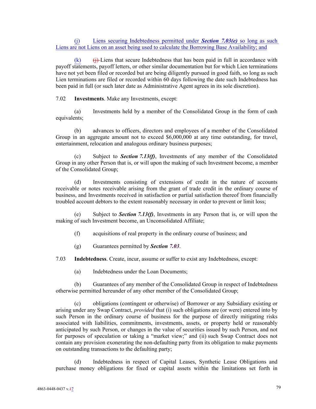 4863-0448-0437 v.17 79 (j) Liens securing Indebtedness permitted under Section 7.03(e) so long as such Liens are not Liens on an asset being used to calculate the Borrowing Base Availability; and (k) (j) Liens that secure Indebtedness that has been paid in full in accordance with payoff statements, payoff letters, or other similar documentation but for which Lien terminations have not yet been filed or recorded but are being diligently pursued in good faith, so long as such Lien terminations are filed or recorded within 60 days following the date such Indebtedness has been paid in full (or such later date as Administrative Agent agrees in its sole discretion). 7.02 Investments. Make any Investments, except: (a) Investments held by a member of the Consolidated Group in the form of cash equivalents; (b) advances to officers, directors and employees of a member of the Consolidated Group in an aggregate amount not to exceed $6,000,000 at any time outstanding, for travel, entertainment, relocation and analogous ordinary business purposes; (c) Subject to Section 7.13(f), Investments of any member of the Consolidated Group in any other Person that is, or will upon the making of such Investment become, a member of the Consolidated Group; (d) Investments consisting of extensions of credit in the nature of accounts receivable or notes receivable arising from the grant of trade credit in the ordinary course of business, and Investments received in satisfaction or partial satisfaction thereof from financially troubled account debtors to the extent reasonably necessary in order to prevent or limit loss; (e) Subject to Section 7.13(f), Investments in any Person that is, or will upon the making of such Investment become, an Unconsolidated Affiliate; (f) acquisitions of real property in the ordinary course of business; and (g) Guarantees permitted by Section 7.03. 7.03 Indebtedness. Create, incur, assume or suffer to exist any Indebtedness, except: (a) Indebtedness under the Loan Documents; (b) Guarantees of any member of the Consolidated Group in respect of Indebtedness otherwise permitted hereunder of any other member of the Consolidated Group; (c) obligations (contingent or otherwise) of Borrower or any Subsidiary existing or arising under any Swap Contract, provided that (i) such obligations are (or were) entered into by such Person in the ordinary course of business for the purpose of directly mitigating risks associated with liabilities, commitments, investments, assets, or property held or reasonably anticipated by such Person, or changes in the value of securities issued by such Person, and not for purposes of speculation or taking a “market view;” and (ii) such Swap Contract does not contain any provision exonerating the non-defaulting party from its obligation to make payments on outstanding transactions to the defaulting party; (d) Indebtedness in respect of Capital Leases, Synthetic Lease Obligations and purchase money obligations for fixed or capital assets within the limitations set forth in