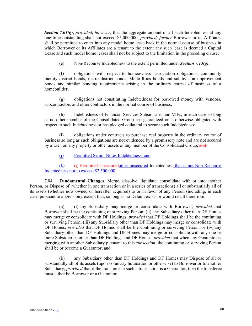 4863-0448-0437 v.17 80 Section 7.01(g); provided, however, that the aggregate amount of all such Indebtedness at any one time outstanding shall not exceed $5,000,000; provided, further Borrower or its Affiliates shall be permitted to enter into any model home lease back in the normal course of business in which Borrower or its Affiliates are a tenant to the extent any such lease is deemed a Capital Lease and such model home leases shall not be subject to the limitation in the preceding clause; (e) Non-Recourse Indebtedness to the extent permitted under Section 7.13(g); (f) obligations with respect to homeowners’ association obligations, community facility district bonds, metro district bonds, Mello-Roos bonds and subdivision improvement bonds and similar bonding requirements arising in the ordinary course of business of a homebuilder; (g) obligations not constituting Indebtedness for borrowed money with vendors, subcontractors and other contractors in the normal course of business; (h) Indebtedness of Financial Services Subsidiaries and VIEs, in each case so long as no other member of the Consolidated Group has guaranteed or is otherwise obligated with respect to such Indebtedness or has pledged collateral to secure such Indebtedness; (i) obligations under contracts to purchase real property in the ordinary course of business so long as such obligations are not evidenced by a promissory note and are not secured by a Lien on any property or other assets of any member of the Consolidated Group; and (j) Permitted Senior Notes Indebtedness; and (k) (j) Permitted Unsecuredother unsecured Indebtedness that is not Non-Recourse Indebtedness not to exceed $2,500,000. 7.04 Fundamental Changes. Merge, dissolve, liquidate, consolidate with or into another Person, or Dispose of (whether in one transaction or in a series of transactions) all or substantially all of its assets (whether now owned or hereafter acquired) to or in favor of any Person (including, in each case, pursuant to a Division), except that, so long as no Default exists or would result therefrom: (a) (i) any Subsidiary may merge or consolidate with Borrower, provided that Borrower shall be the continuing or surviving Person, (ii) any Subsidiary other than DF Homes may merge or consolidate with DF Holdings, provided that DF Holdings shall be the continuing or surviving Person, (iii) any Subsidiary other than DF Holdings may merge or consolidate with DF Homes, provided that DF Homes shall be the continuing or surviving Person, or (iv) any Subsidiary other than DF Holdings and DF Homes may merge or consolidate with any one or more Subsidiaries other than DF Holdings and DF Homes, provided that when any Guarantor is merging with another Subsidiary pursuant to this subsection, the continuing or surviving Person shall be or become a Guarantor; and (b) any Subsidiary other than DF Holdings and DF Homes may Dispose of all or substantially all of its assets (upon voluntary liquidation or otherwise) to Borrower or to another Subsidiary; provided that if the transferor in such a transaction is a Guarantor, then the transferee must either be Borrower or a Guarantor.