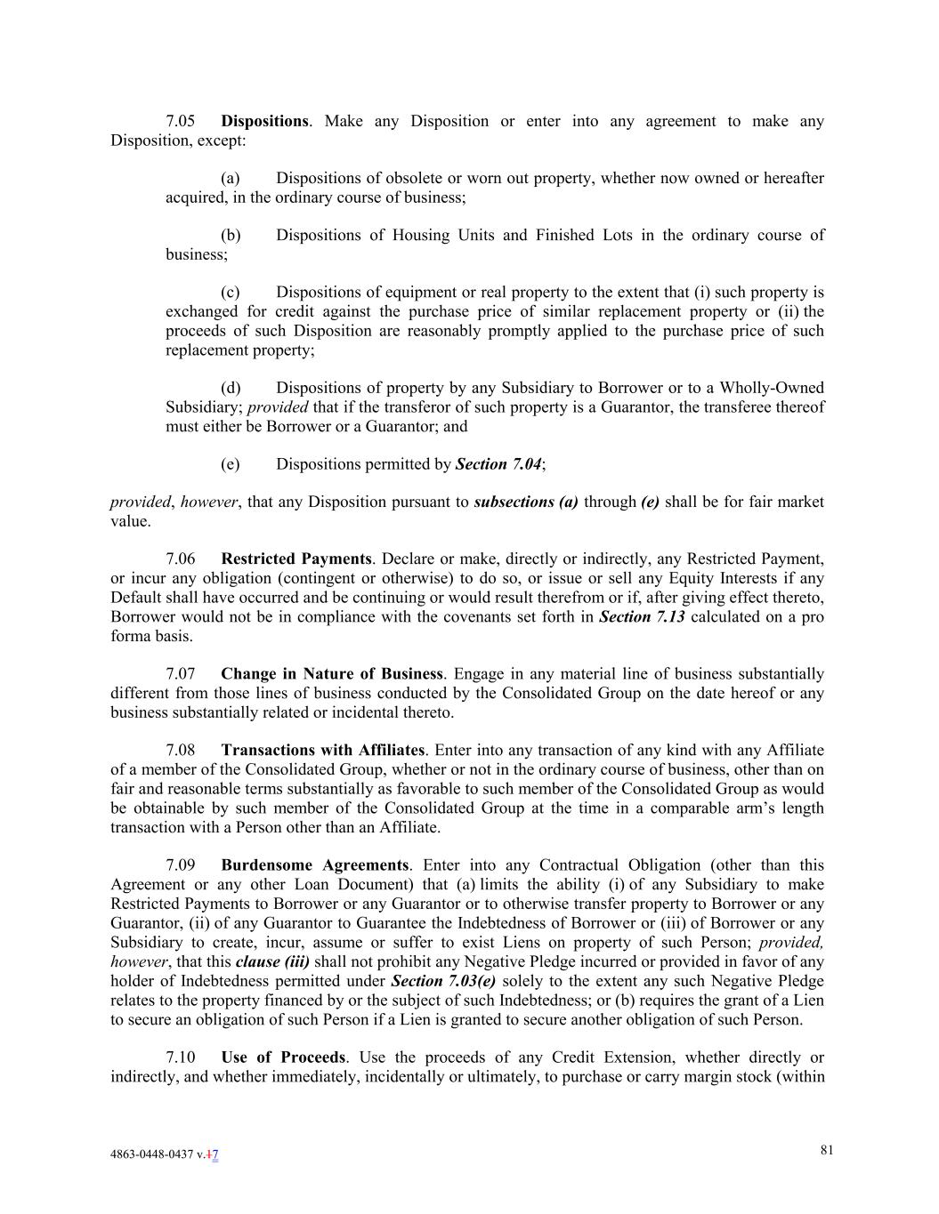 4863-0448-0437 v.17 81 7.05 Dispositions. Make any Disposition or enter into any agreement to make any Disposition, except: (a) Dispositions of obsolete or worn out property, whether now owned or hereafter acquired, in the ordinary course of business; (b) Dispositions of Housing Units and Finished Lots in the ordinary course of business; (c) Dispositions of equipment or real property to the extent that (i) such property is exchanged for credit against the purchase price of similar replacement property or (ii) the proceeds of such Disposition are reasonably promptly applied to the purchase price of such replacement property; (d) Dispositions of property by any Subsidiary to Borrower or to a Wholly-Owned Subsidiary; provided that if the transferor of such property is a Guarantor, the transferee thereof must either be Borrower or a Guarantor; and (e) Dispositions permitted by Section 7.04; provided, however, that any Disposition pursuant to subsections (a) through (e) shall be for fair market value. 7.06 Restricted Payments. Declare or make, directly or indirectly, any Restricted Payment, or incur any obligation (contingent or otherwise) to do so, or issue or sell any Equity Interests if any Default shall have occurred and be continuing or would result therefrom or if, after giving effect thereto, Borrower would not be in compliance with the covenants set forth in Section 7.13 calculated on a pro forma basis. 7.07 Change in Nature of Business. Engage in any material line of business substantially different from those lines of business conducted by the Consolidated Group on the date hereof or any business substantially related or incidental thereto. 7.08 Transactions with Affiliates. Enter into any transaction of any kind with any Affiliate of a member of the Consolidated Group, whether or not in the ordinary course of business, other than on fair and reasonable terms substantially as favorable to such member of the Consolidated Group as would be obtainable by such member of the Consolidated Group at the time in a comparable arm’s length transaction with a Person other than an Affiliate. 7.09 Burdensome Agreements. Enter into any Contractual Obligation (other than this Agreement or any other Loan Document) that (a) limits the ability (i) of any Subsidiary to make Restricted Payments to Borrower or any Guarantor or to otherwise transfer property to Borrower or any Guarantor, (ii) of any Guarantor to Guarantee the Indebtedness of Borrower or (iii) of Borrower or any Subsidiary to create, incur, assume or suffer to exist Liens on property of such Person; provided, however, that this clause (iii) shall not prohibit any Negative Pledge incurred or provided in favor of any holder of Indebtedness permitted under Section 7.03(e) solely to the extent any such Negative Pledge relates to the property financed by or the subject of such Indebtedness; or (b) requires the grant of a Lien to secure an obligation of such Person if a Lien is granted to secure another obligation of such Person. 7.10 Use of Proceeds. Use the proceeds of any Credit Extension, whether directly or indirectly, and whether immediately, incidentally or ultimately, to purchase or carry margin stock (within